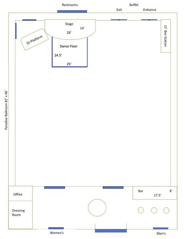 Paradise Ballrooms is a timeless, Victorian-style ballroom. Step into an elegant lobby featuring a built-in bar to set the scene. Inside, the expansive ballroom boasts a spacious dancefloor, a prominent main stage, and a designated DJ platform. Guests will enjoy a dedicated beverage station and an attached buffet area for seamless dining service. Customizable colored uplighting and stunning chandeliers add a luxurious glow, allowing you to personalize the ambiance to perfectly match your vision.