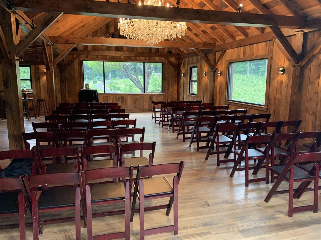 The Stable Room on the lower level features a 700 square foot room opening to an expansive covered patio space overlooking our grounds. The Hayloft on the upper level features over 800 square feet with dramatic views of our vineyard, cabin, and grounds and an elevated deck adjoining the room. The centerpiece of this room is the European crystal chandelier. The floors of this space are the original exterior barn boards and the original hayloft ceiling all dating to the late 19th century.