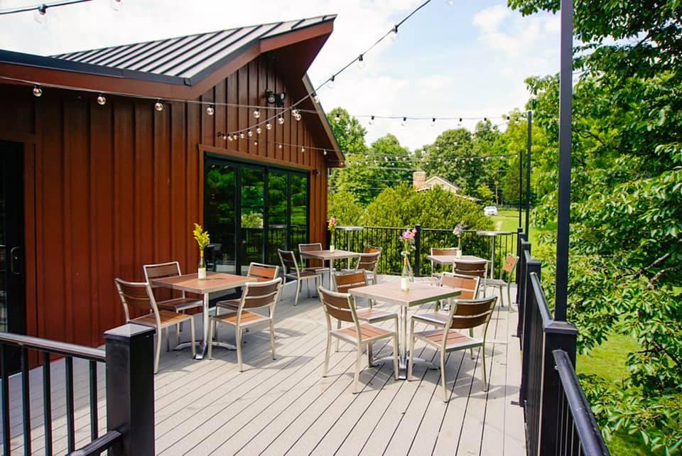 Our Red Barn & Patio rental venue is our newest venue at Paradise Springs. The two-story structure was rebuilt in June 2016 from our reclaimed 19th-century barn that originally stood 12 miles away in Fairfax City, VA, and moved to our grounds in the 1950s. Suitable for anything from meetings to celebrations, the Red Barn features two floors of rustic and elegant event space accommodating up to 120 guests indoors with additional space on the surrounding patio and upper-level deck. The Red Barn can be rented as one venue or as two more intimate spaces; the Stable Room and the Hayloft.