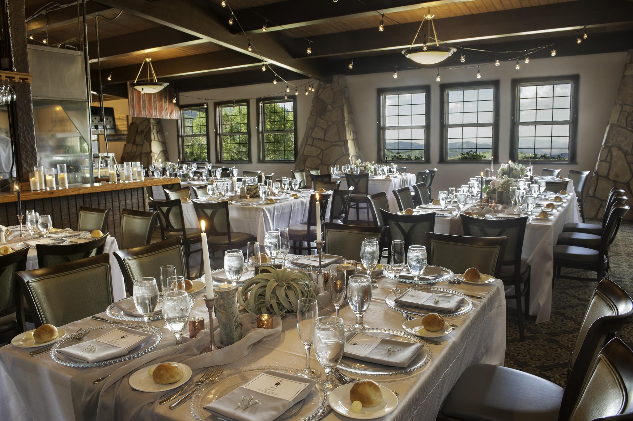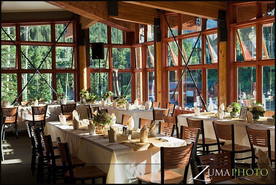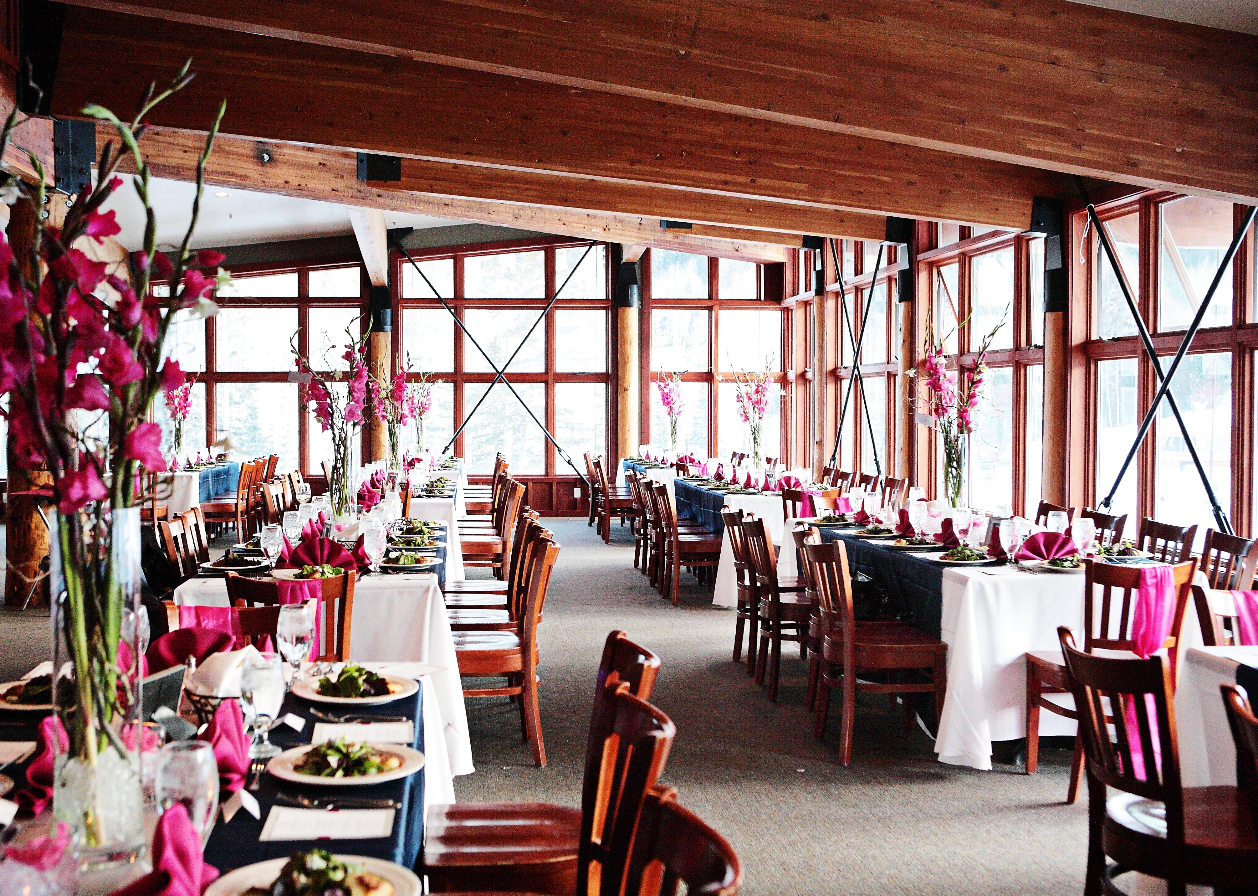 Dining tables and chairs, display tables, cocktail tables, standard linens, china, stemware, cutlery, ceremony chairs, dance floor, lift transportation to ceremony site and alpine slide.