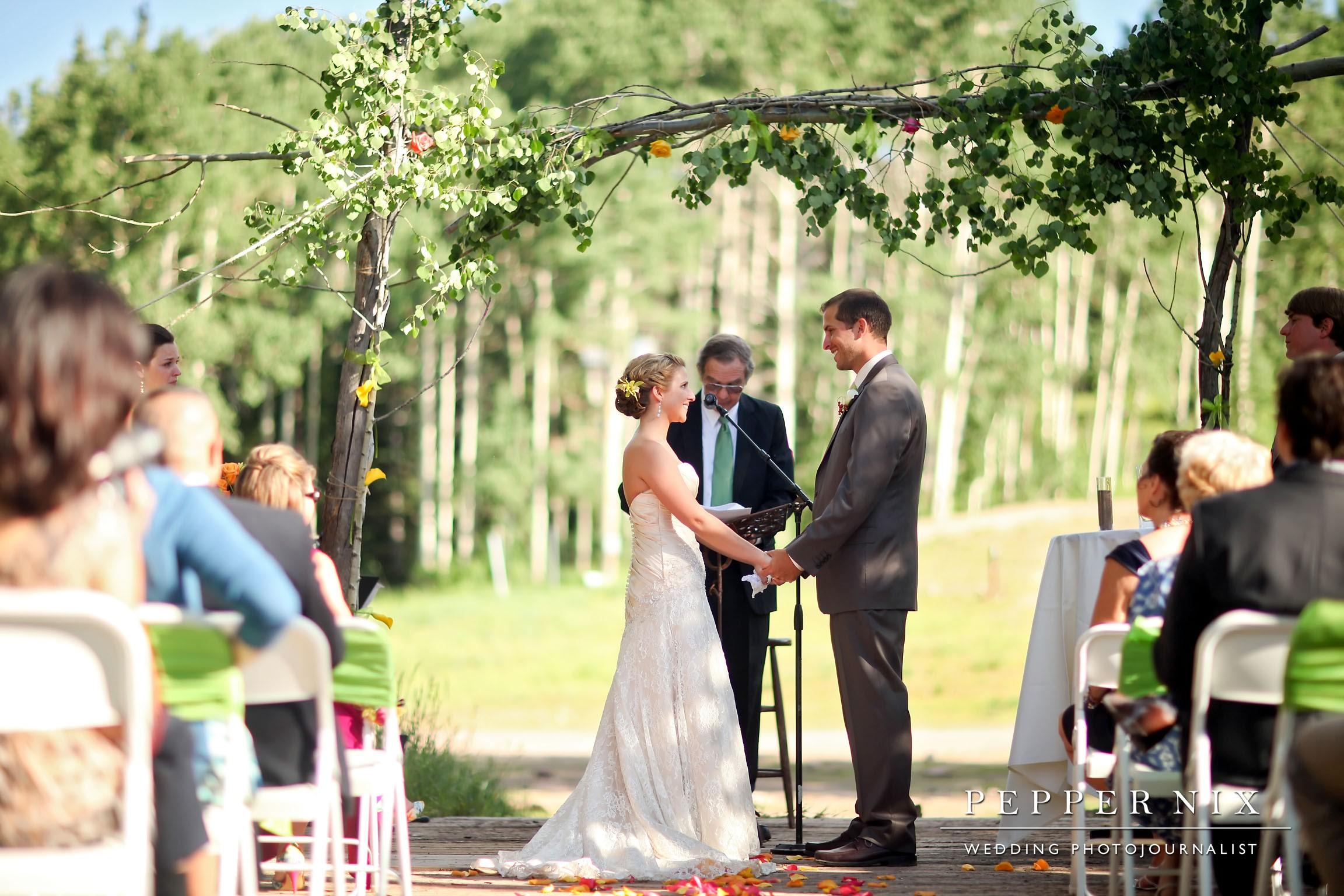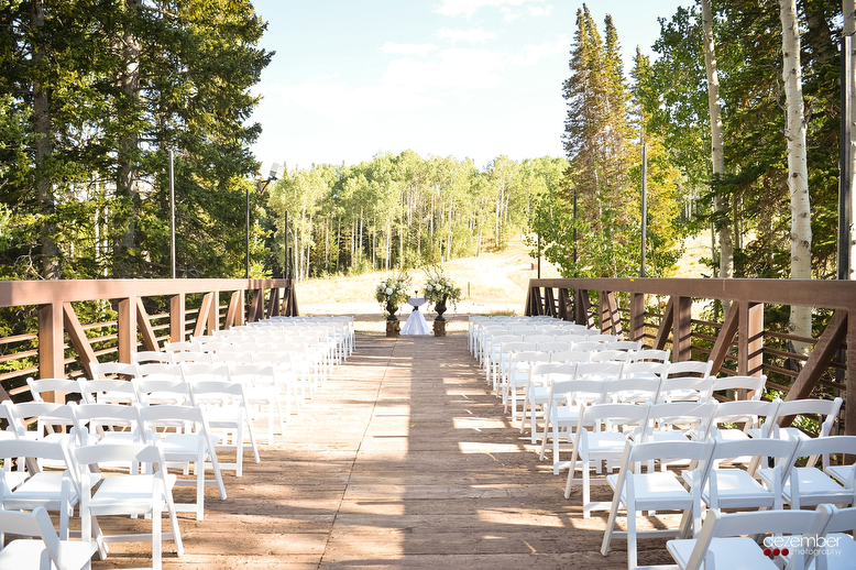 Guests will soar over the gorgeous mountain views to 8,000 feet in the enclosed Red Pine Gondola Cabin which takes you 2/3 of the way up the mountain. Nestled in a saddle on the mountainside is Red Pine Lodge. This picture-perfect venue has floor-to-ceiling windows that take in the beautiful forest scenery which surrounds it. Red Pine Lodge has two levels and a spacious outdoor patio for your cocktail reception. Your ceremony will take place on the charming wooden bridge nestled among spruce and aspens.
