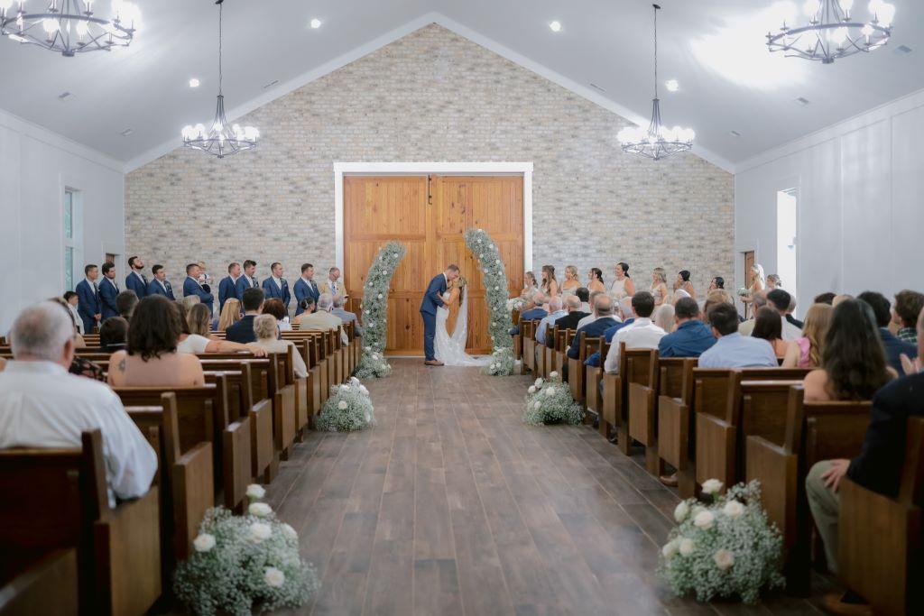 The Carriage House is a modern, chapel-like ceremony site. With wooden pews to give it that classic church feel, you can say "I do" in front of our gorgeous wooden doors. The Carriage House also has restrooms for your guests, and sliding barn doors for a grand entrance. The white brick compliments any wedding theme perfectly. Select this site as your primary site or use it as your emergency rain plan.