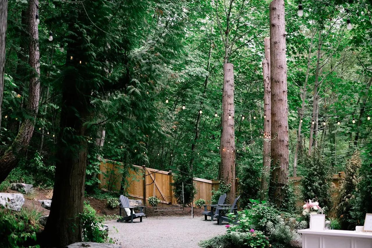 Bond with nature or used to sneak away from the crowd for a private moment, surrounded by trees, nature, and white strung lights.