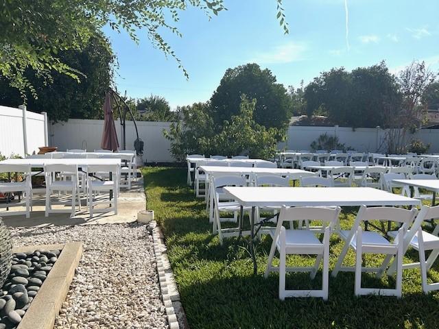 Features: A spacious patio area next to vibrant greenery and garden beds, providing a picturesque backdrop for any occasion. Outdoor Lighting: Perfect for evening events, creating a magical ambiance. 100 White Resin chairs 20 6 ft rectangular tables 1 bartender table Kitchen for cooking