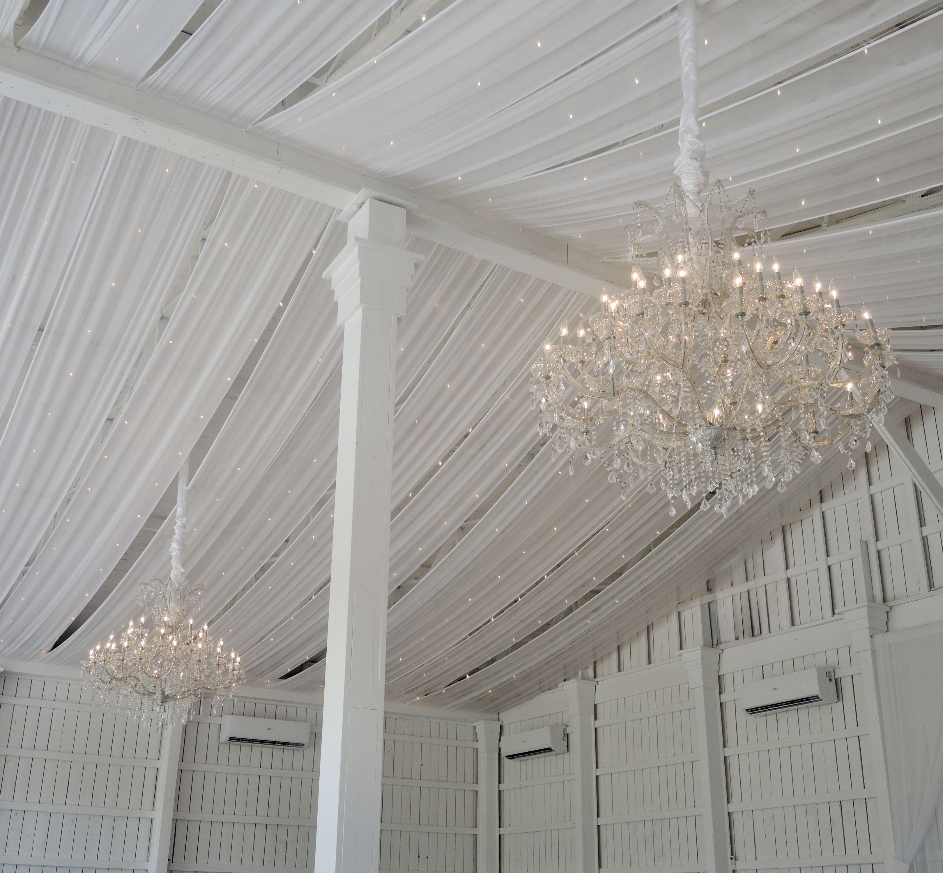 Pegasus Hall has white-washed wooden walls & columns, 25' open beamed ceilings, white draping, twinkle lights, crystal Chandeliers, open-air pergola.