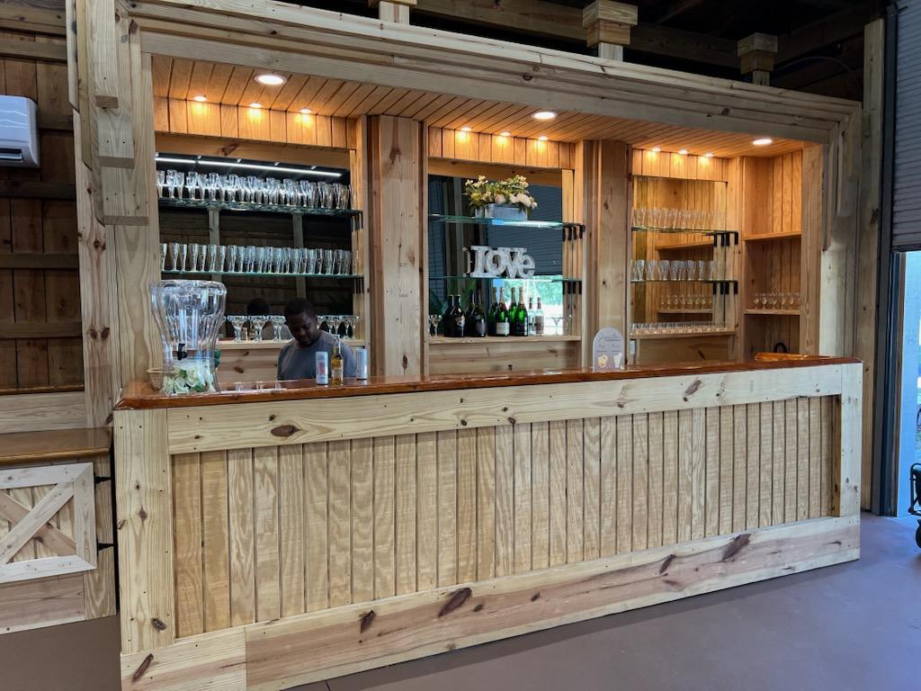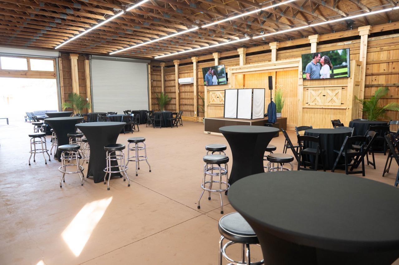 The Manor Lodge's rustic charm features natural wood, exposed ceiling trusses, 13' built-in wet bar, a stage, 2 large screen TVs, a 1,440 sq ft front pergola and a 1,000 sq ft back patio, both with market lights offering additional alfresco space that harmonizes with the lodge’s aesthetic. Manor Lodge is climate controlled and perfect for after-parties, VIP dinners, cocktail hours, corporate/educational retreats or as a backup for inclement weather.