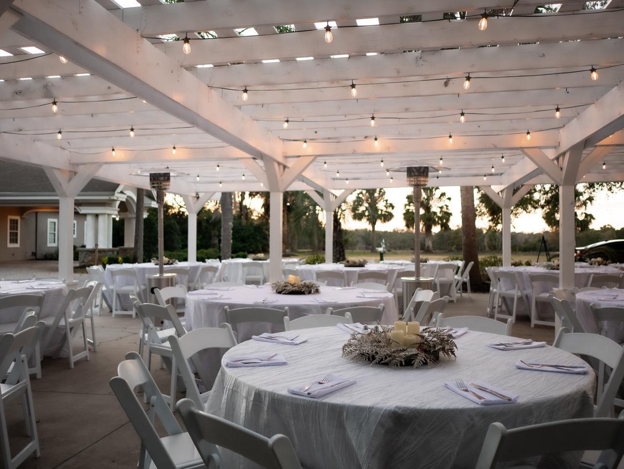 Pegasus Hall is a magnificent venue and well suited for weddings or other large, slightly more formal events offering a blend of elegance and sophistication. Climate-controlled space of 2,400 sq ft. The interior features high 25' open beam ceilings, white-washed wooden walls, & white columns, chiffon ceiling draping and twinkle lights. The Pergola is 1,440 sq ft with its intricate moldings elegant columns & twinkle lights for dancing under the stars.