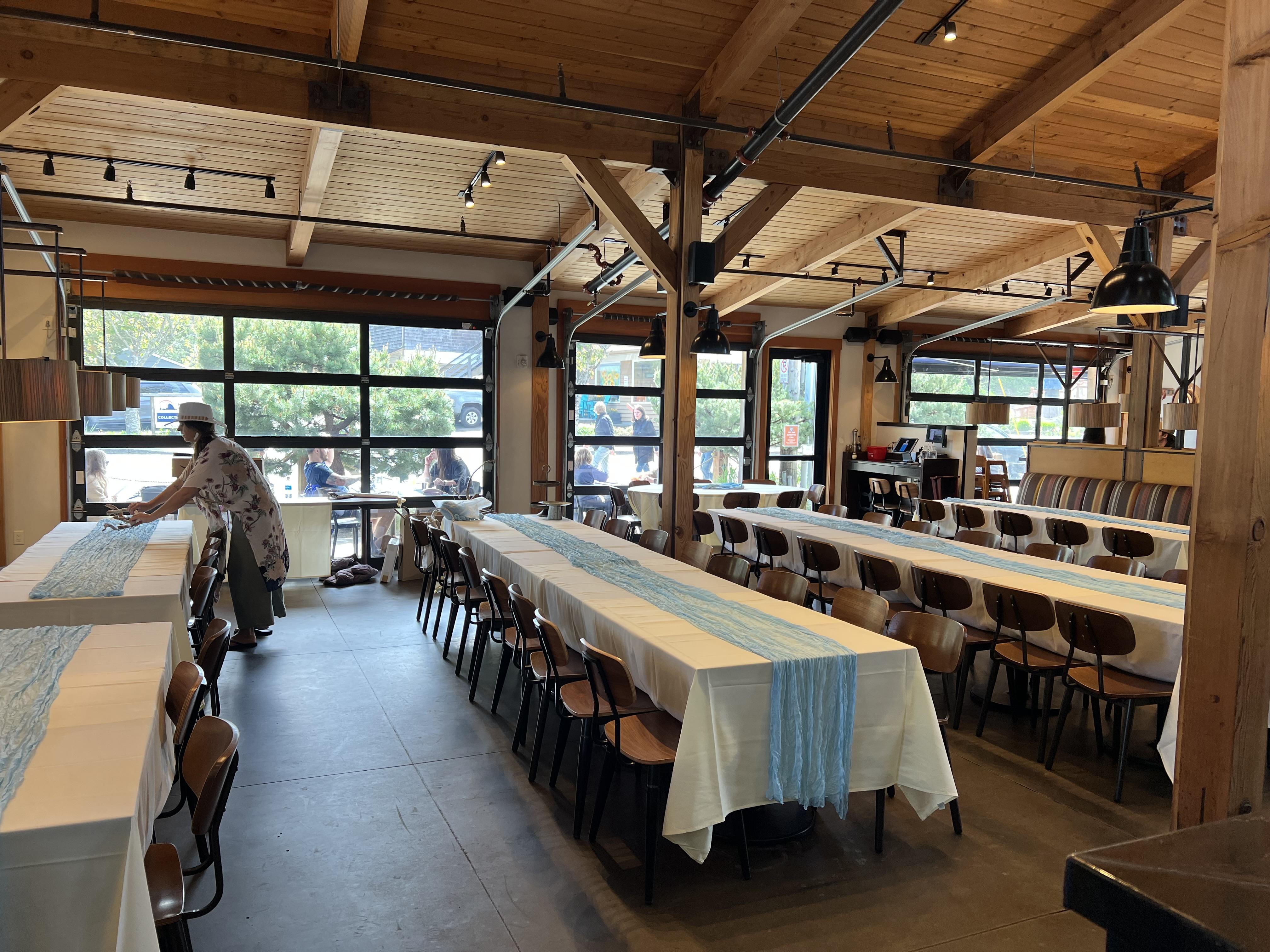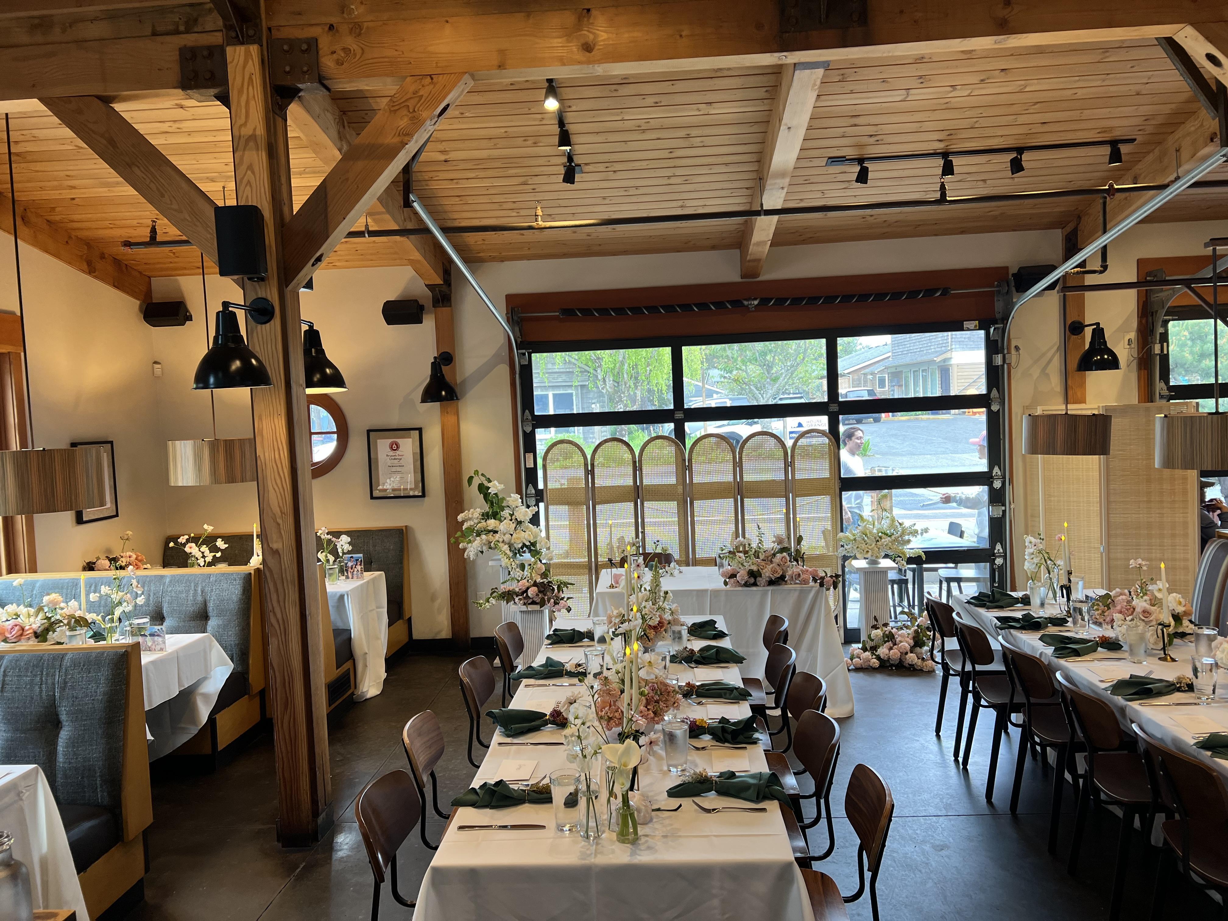 Large windows fill the space with abundant natural light, creating an inviting coastal atmosphere, allowing for up to 32 seated guests.