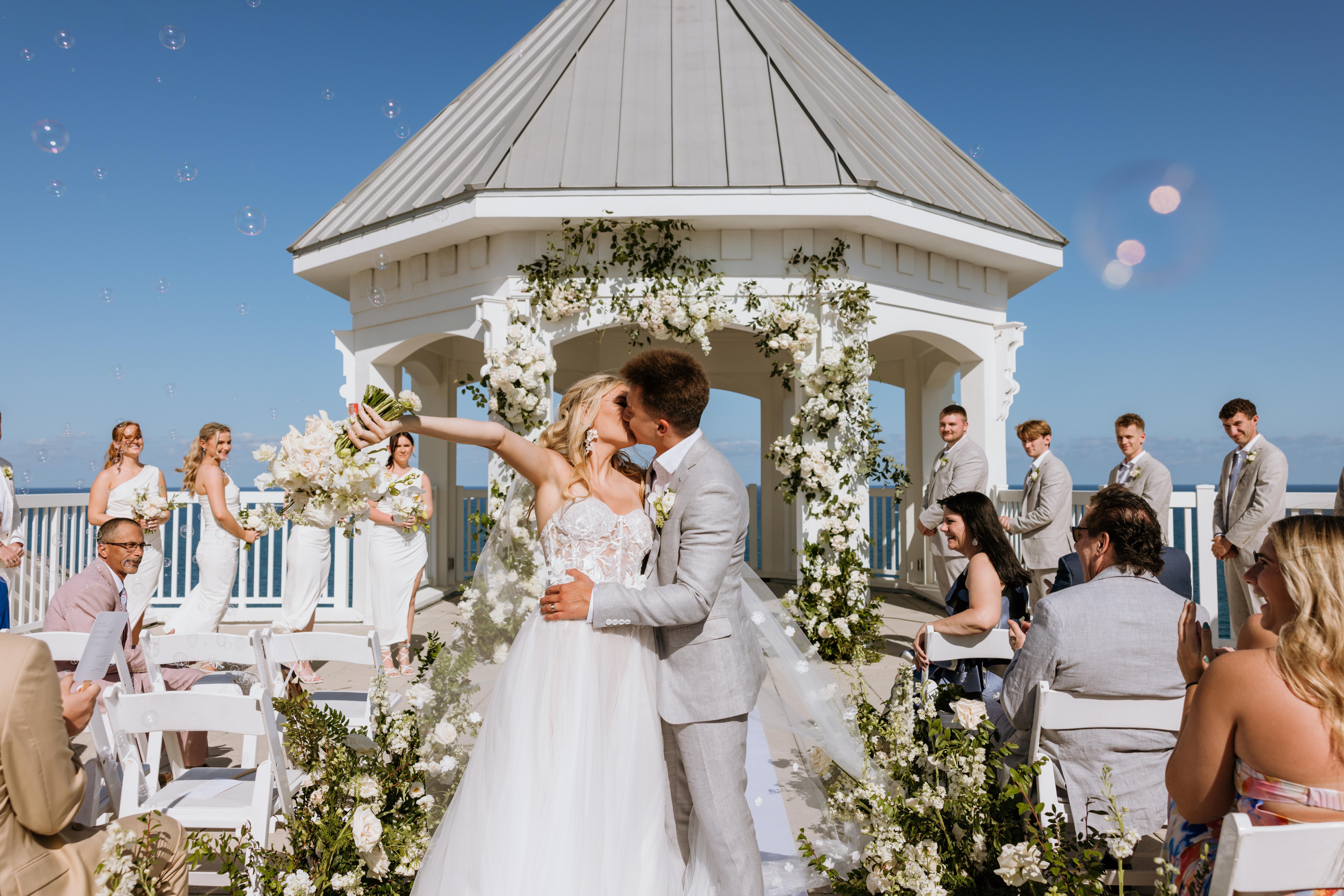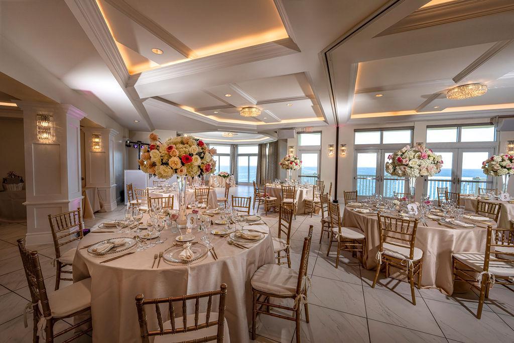 ~ The Atlantic Ballroom sits directly on the dunes of the Atlantic Ocean with floor to ceiling glass windows that offer a 180-degree view of the ocean, along with crystal chandeliers and warm intimate lighting. This ballroom will accommodate up to 60 guests for a wedding reception.