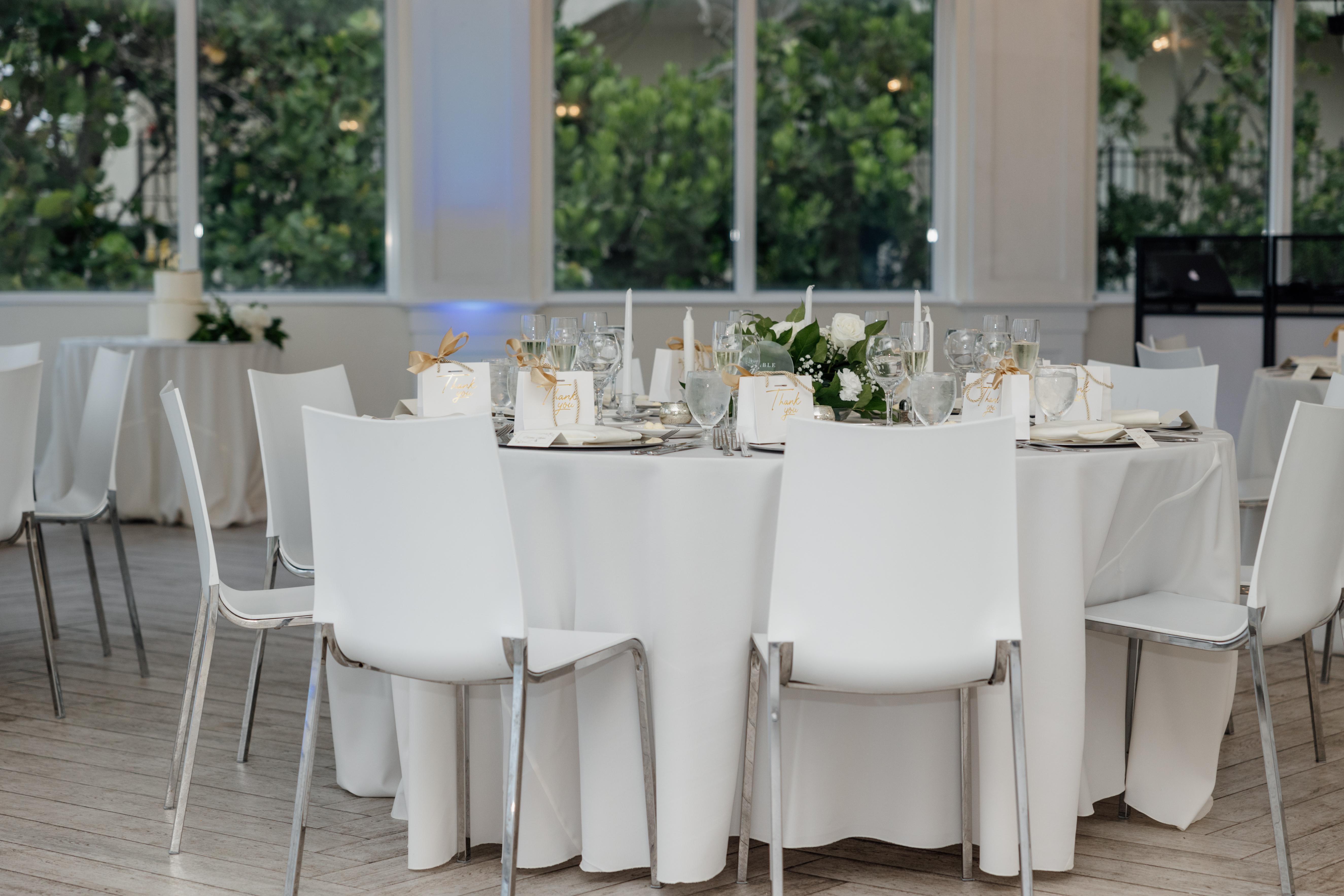 - Round or Royal Tables - White Banquet Chairs - Your choice of Color Floor Length Linen & Napkins - Beach themed Centerpieces - Centerpieces -Silverware, China, Glassware - Banquet Service Team