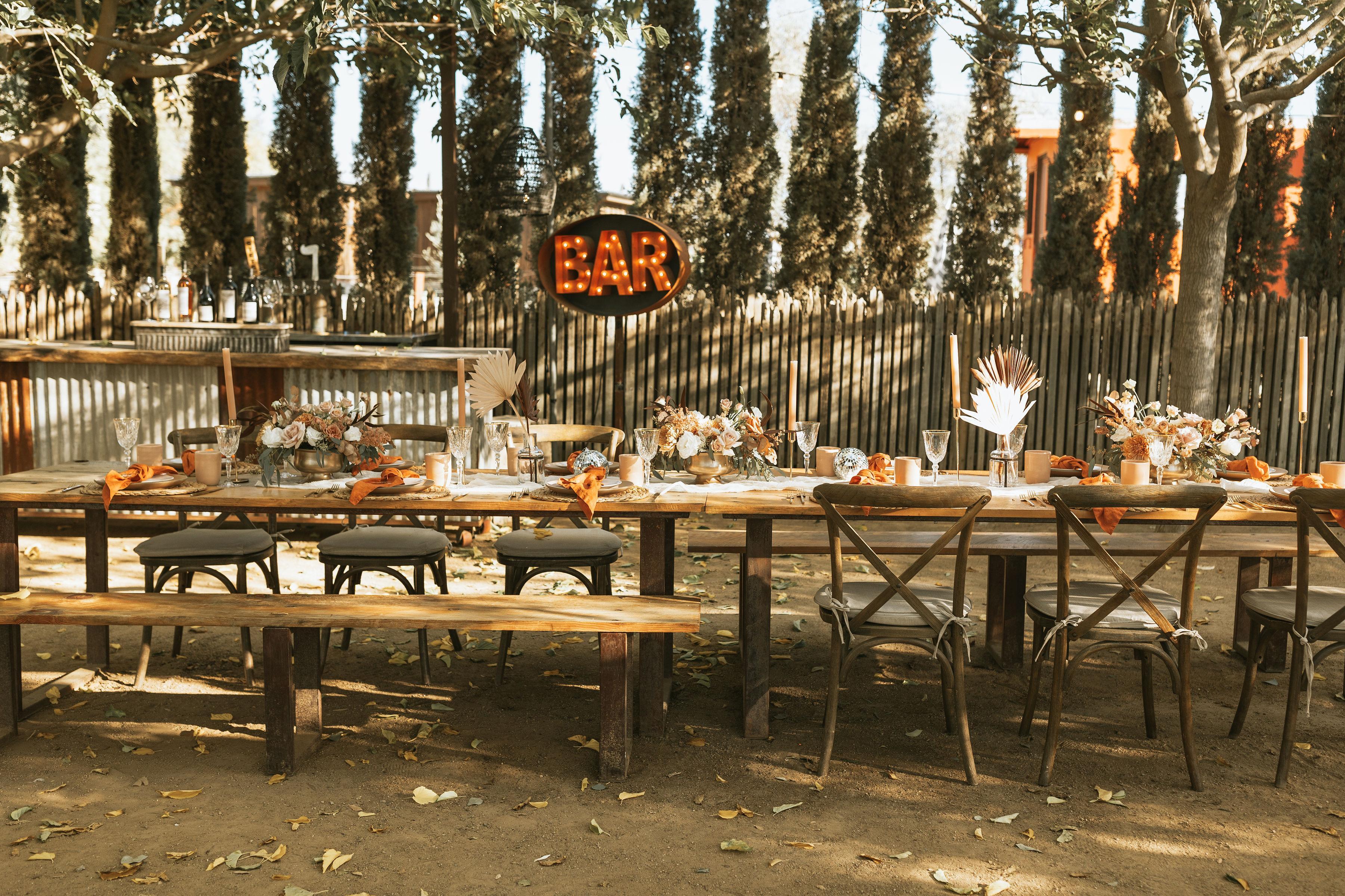 - Tables and Benches - Cross Back Chairs Upgrade Option - Dance Floor - Two Bar Space Options - Buffet Space - Yard Games - Restrooms
