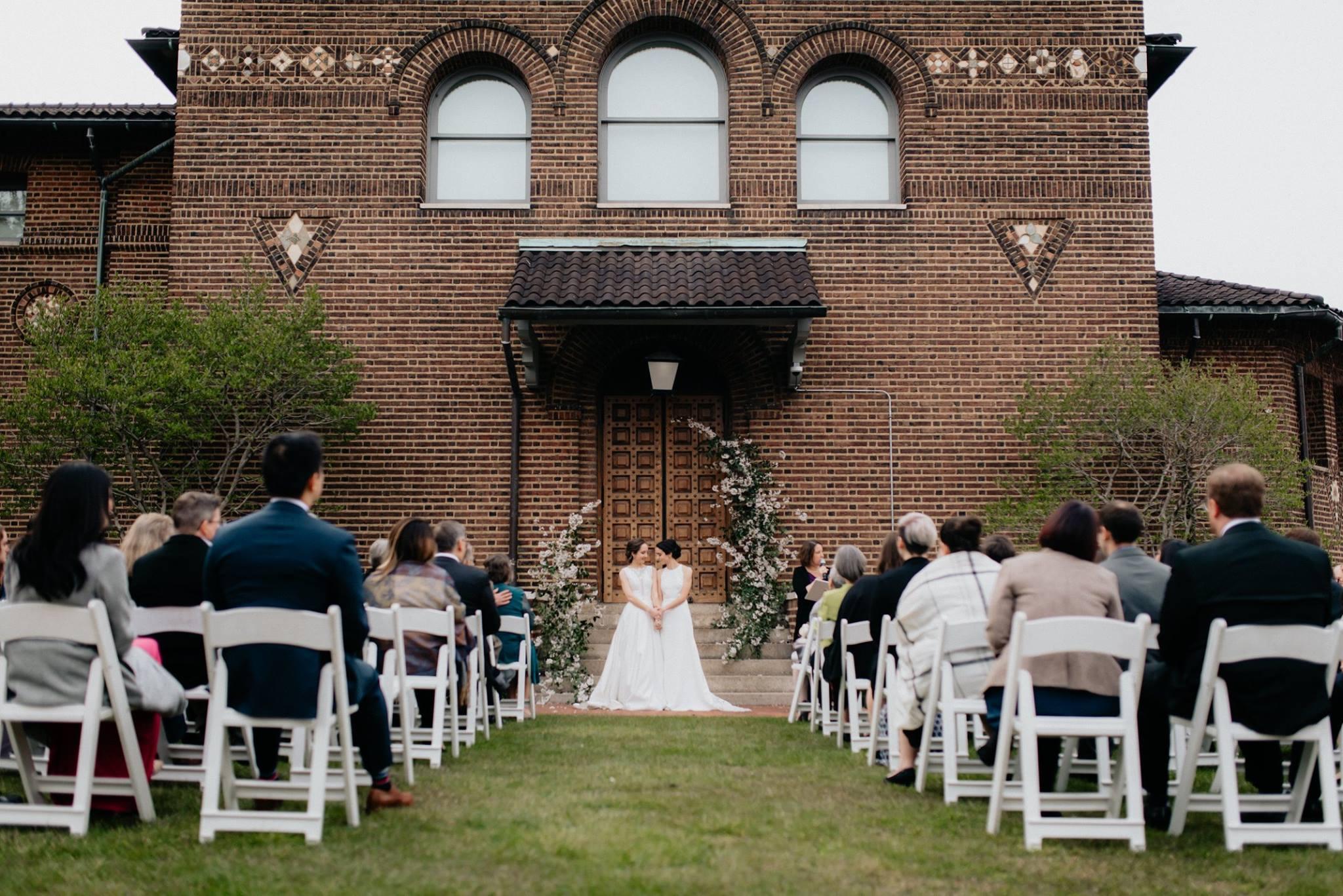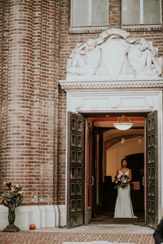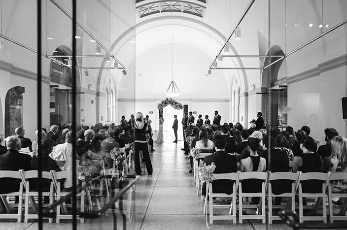 Beautiful architectural details including high arched ceilings and marble/glass floors make the perfect setting for a ceremony or cocktail reception. Grand wooden doors open out onto a spectacular view of the Warden Garden.