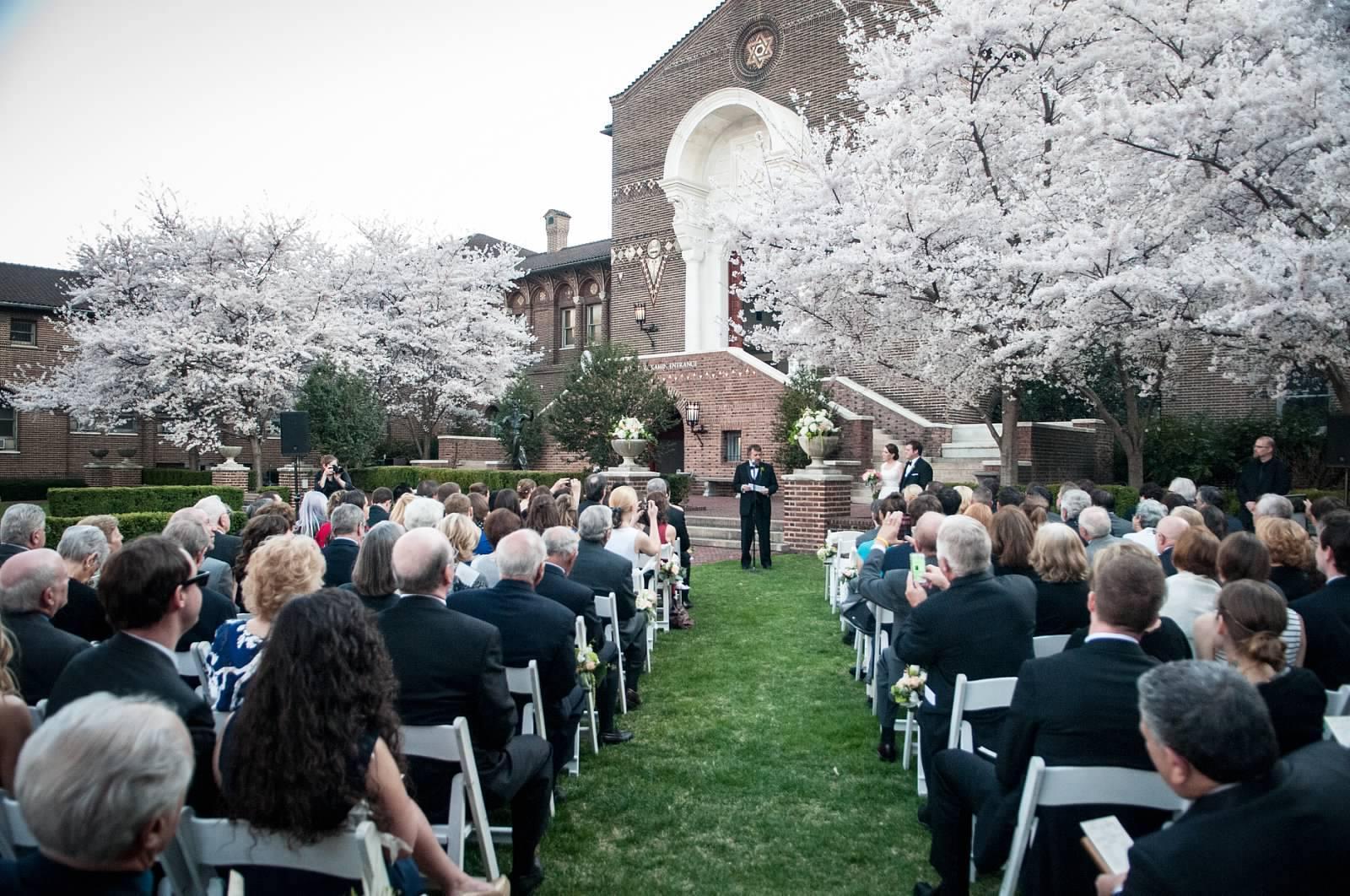 Featuring sculptural pieces of A.S Calder, a cobblestone walkway, and central marble fountain, this exquisite courtyard garden creates the perfect atmosphere for your outdoor wedding.