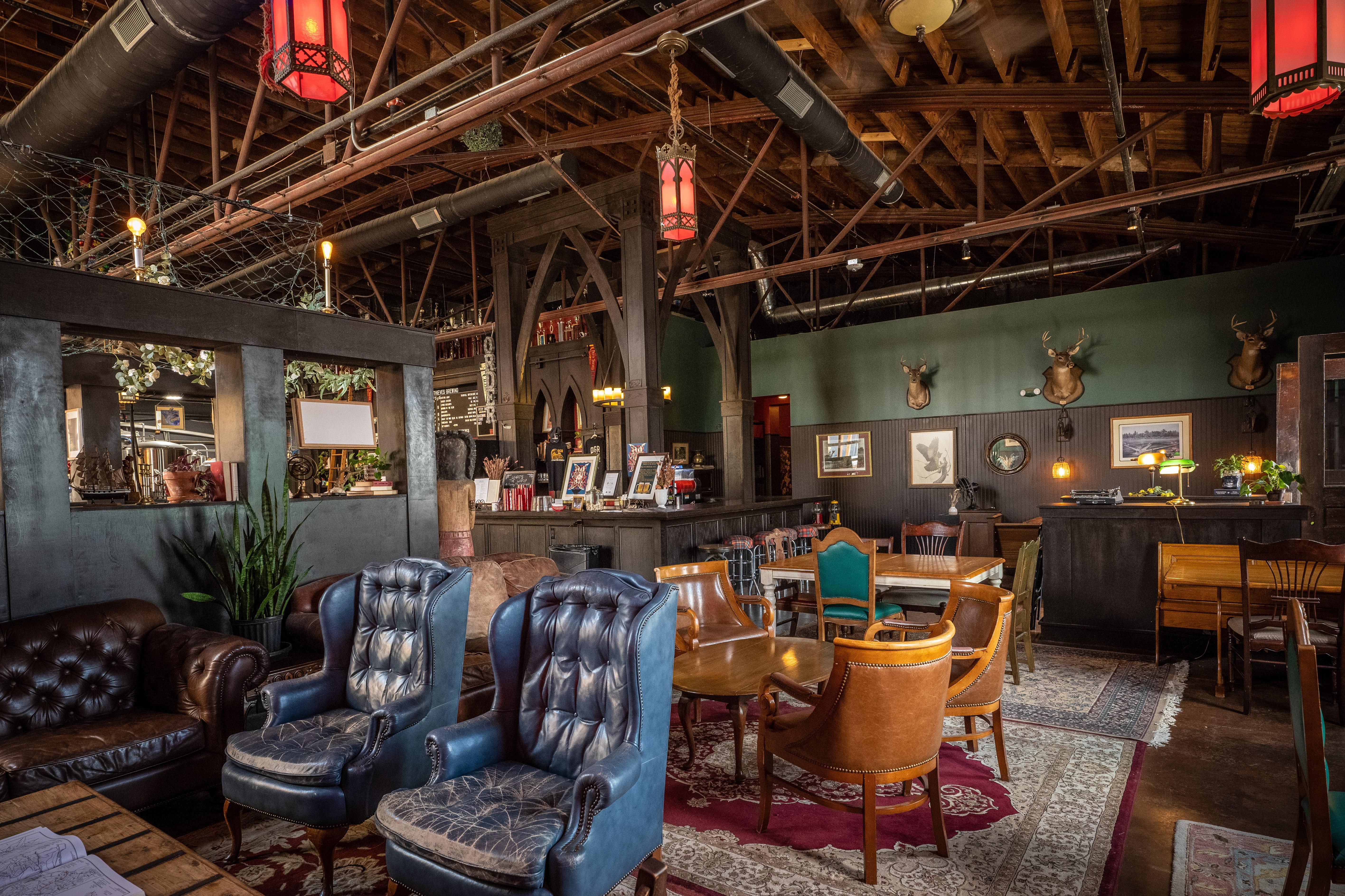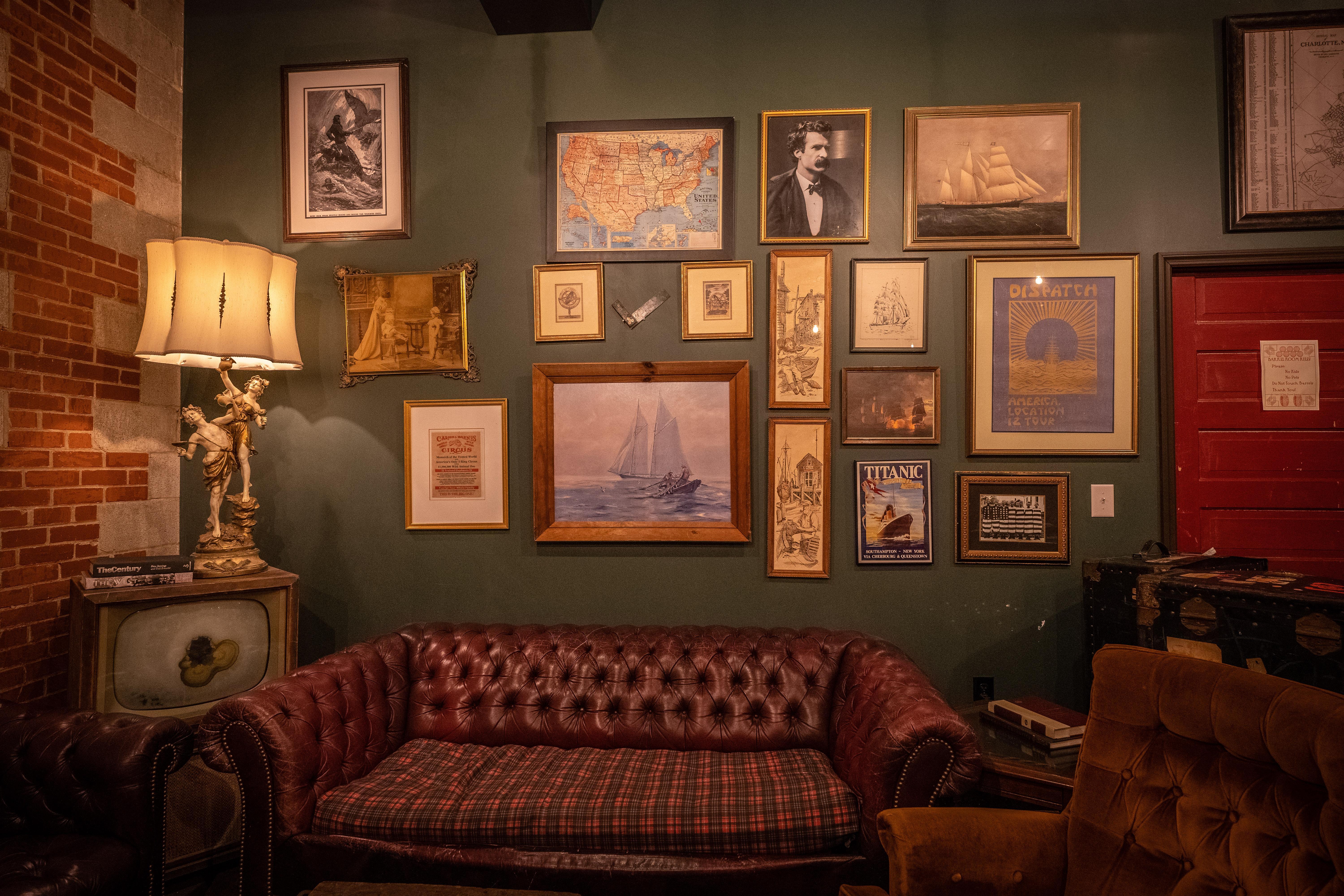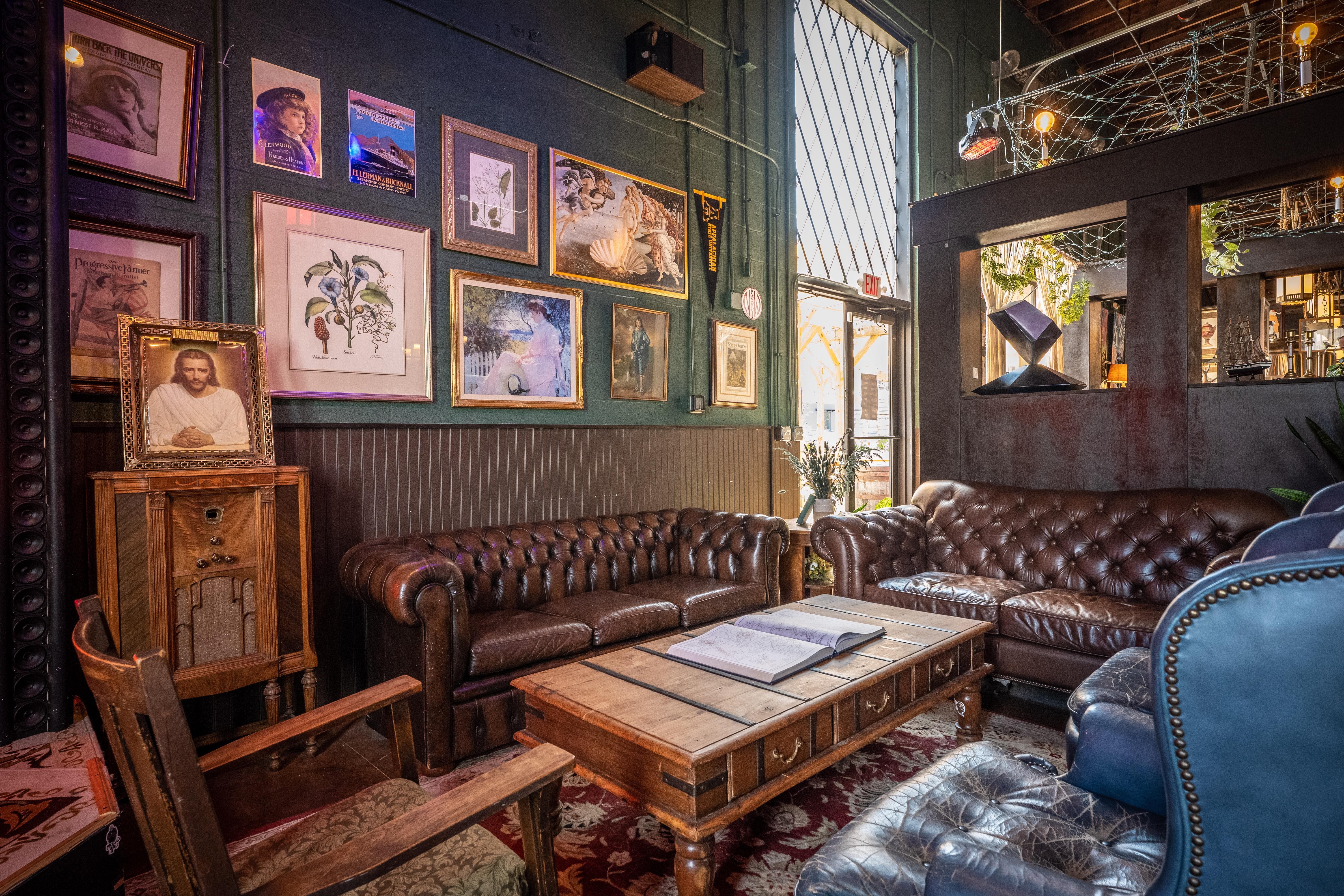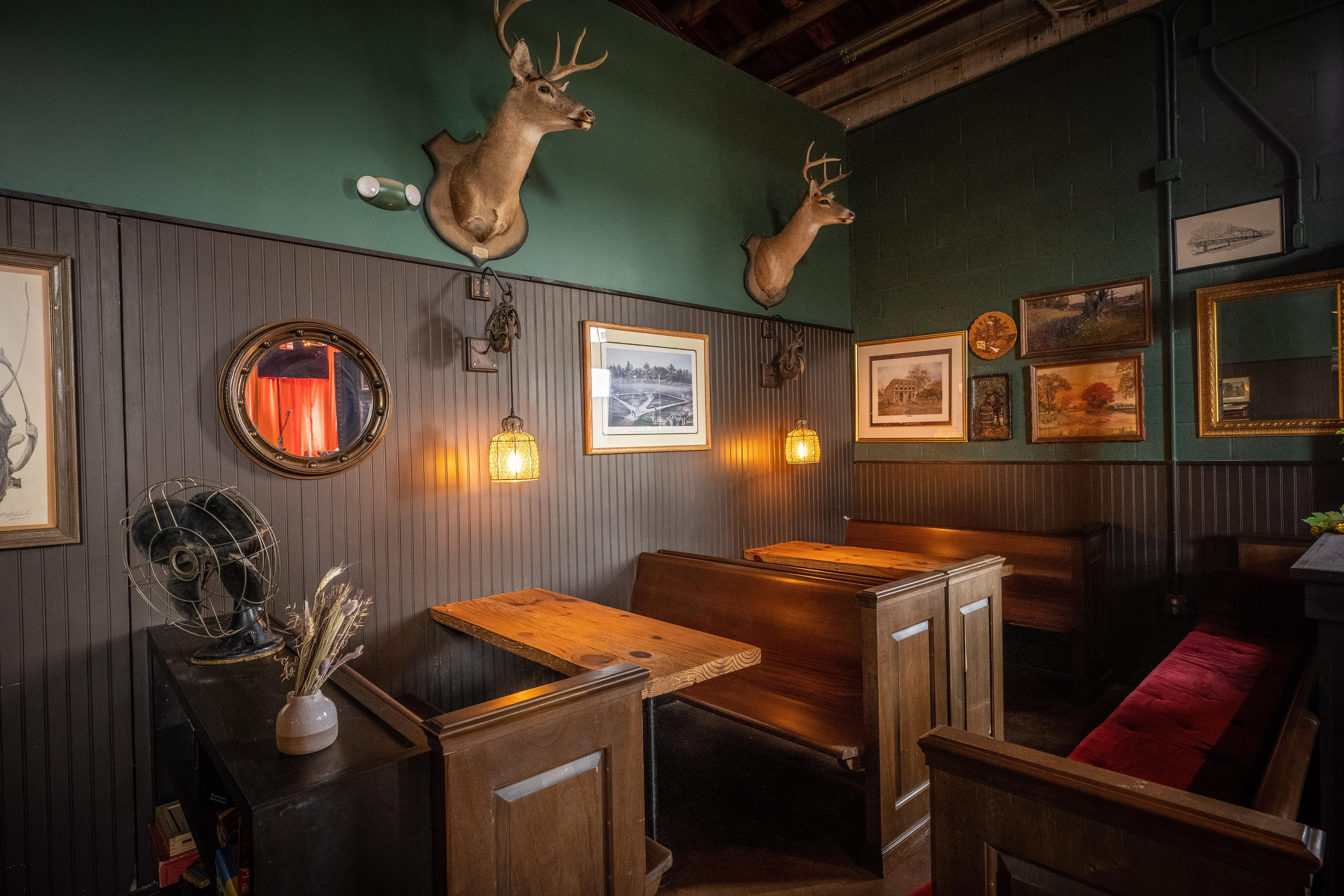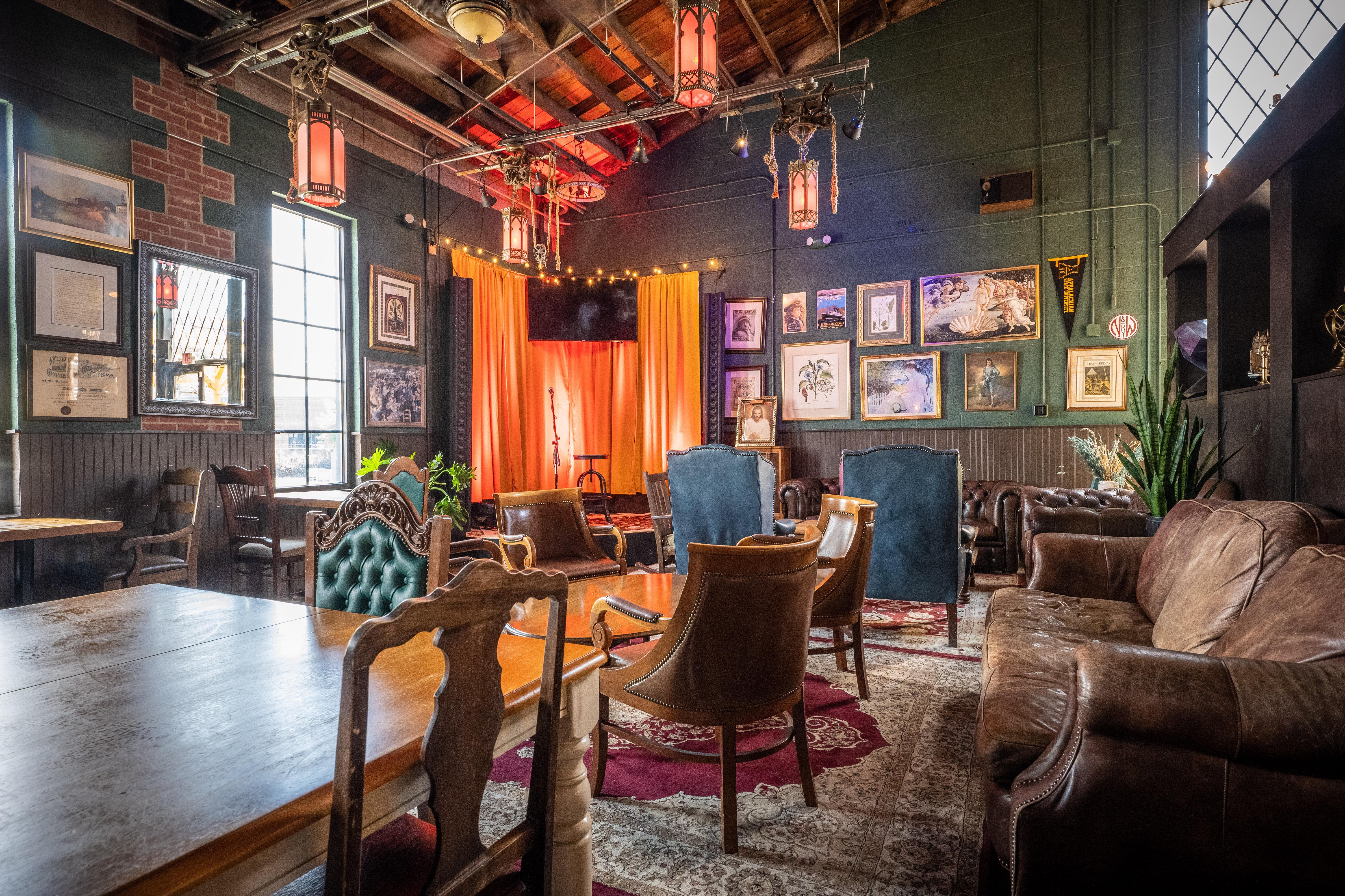 This corner space adjacent to main taproom area is decorated in period art and decor, blending country club, cigar lounge, hunting lodge, and church aesthetics with its own intimate stage and sound system