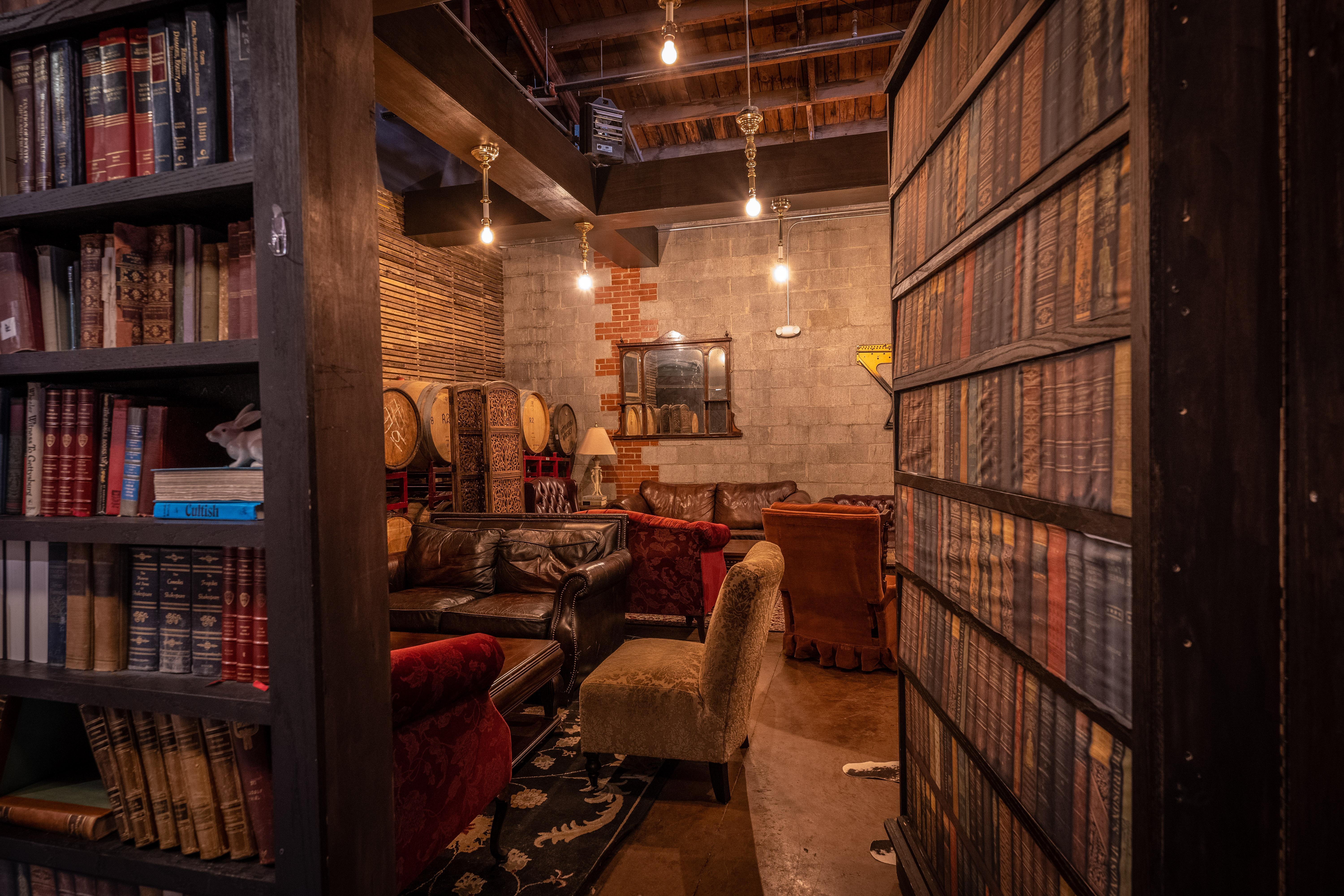 This space is hidden behind secret doors for a truly private experience with overstuffed leather couches and chairs, warm lighting, barrel wall, and period-appointed decor