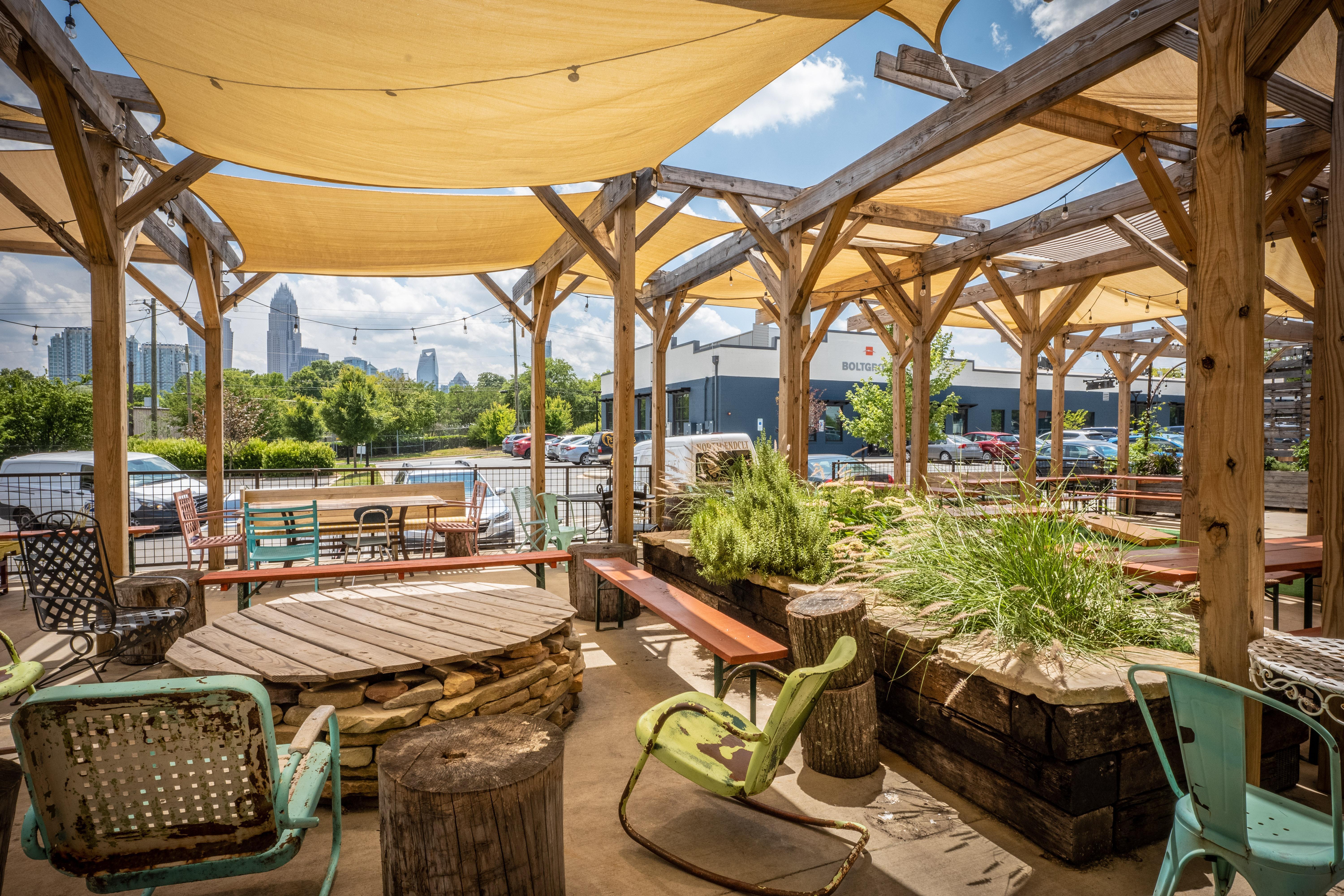 Our cozy taproom has over 2,000 square feet inside and 3,000 square feet of shaded outdoor space, 19 craft beer and seltzer options, and prohibition-era style with overstuffed leather furnishings and lounge vibe and breezy Austin-style shaded patio - all within walking distance of Uptown Charlotte