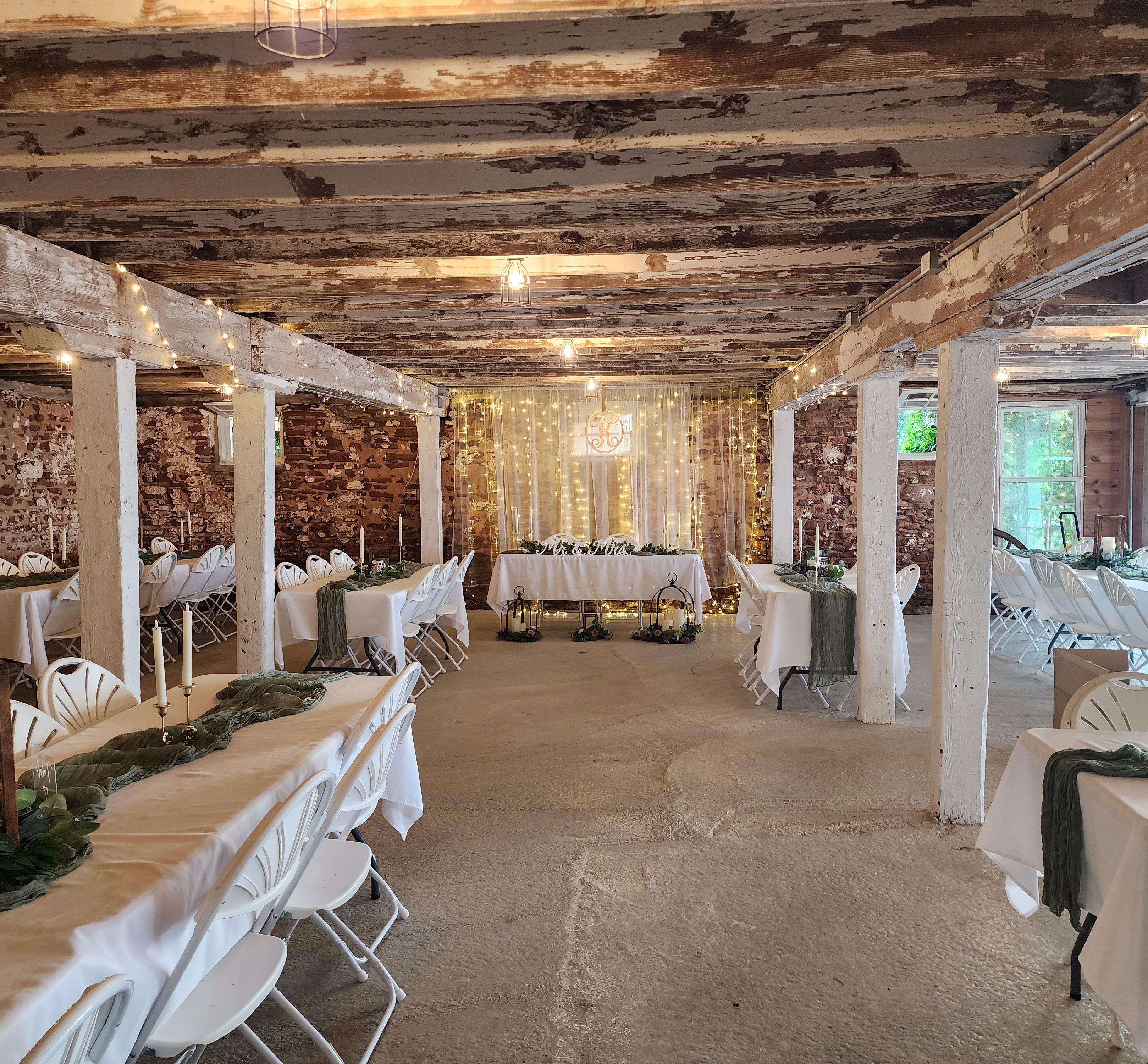 Panoramic natural views • Multiple indoor and outdoor ceremony sites • 300+ indoor seating • 14' x 33' deck overlooking the valley • Scenic walking paths • Large parking lot • Handicap and wheelchair accessible • Numerous photo opportunities • Tables and chairs included • Men's and women's restrooms • Bridal dressing room • Groomsmen dressing area • Heat and air conditioning • Rustic farm props available • Caterer preparation area • Elevated DJ or band stage • Rustic live edge wood bar • Spacious dance floor • Romantic string lighting • Stellar acoustics • Quiet natural setting • Event clean-up provided
