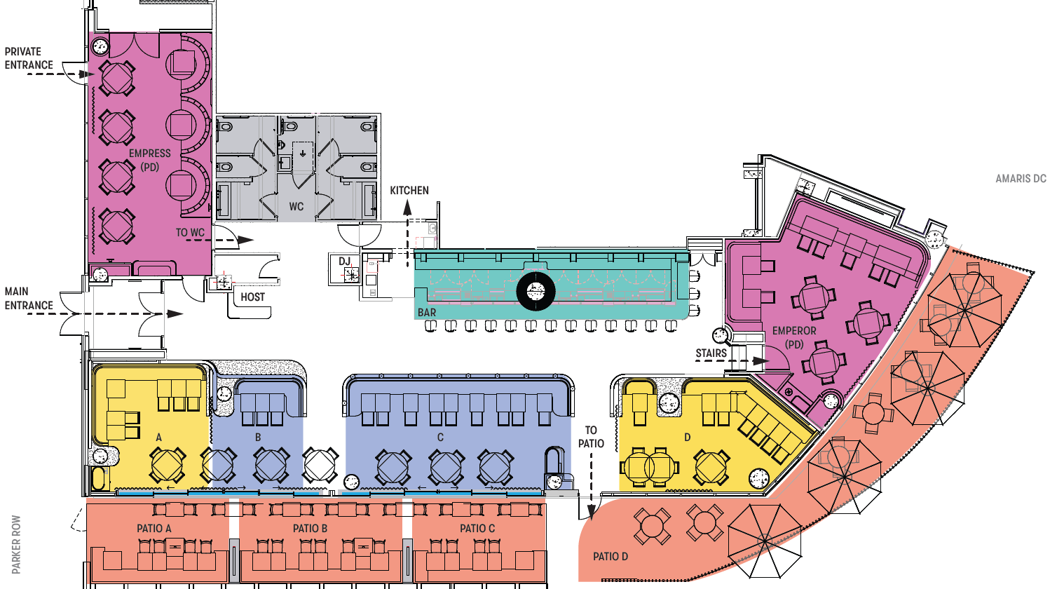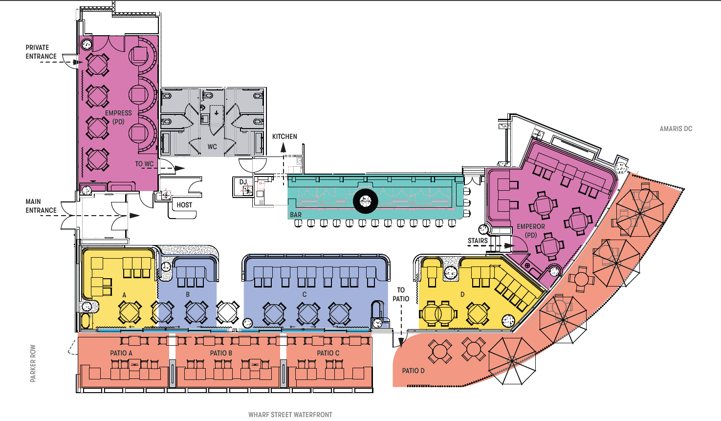 Philippe Chow's dining room creates a glitzy juxtaposition through intimate, serene settings, while not compromising the luxurious views of yachts sailing the Potomac just steps away. The ornate finishes and plush banquettes will ensconce guests in luxury, while captivating mirror accents in purples and blues, are reminiscent of our New York locations. The concept balances the rich culture of traditional Chinese dining with lavish French aesthetic…a perfect showcase for weddings and receptions.