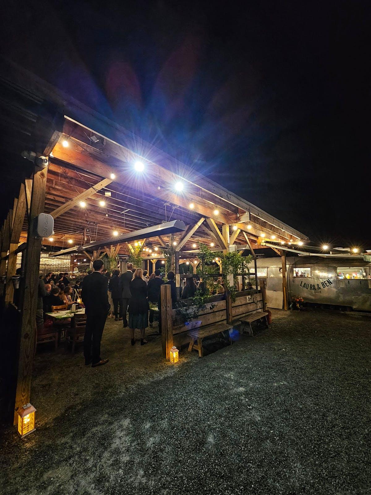 The LOT is an scenic outdoor area with a covered dining area, extended picnic table area, an Airstream, and pergola.