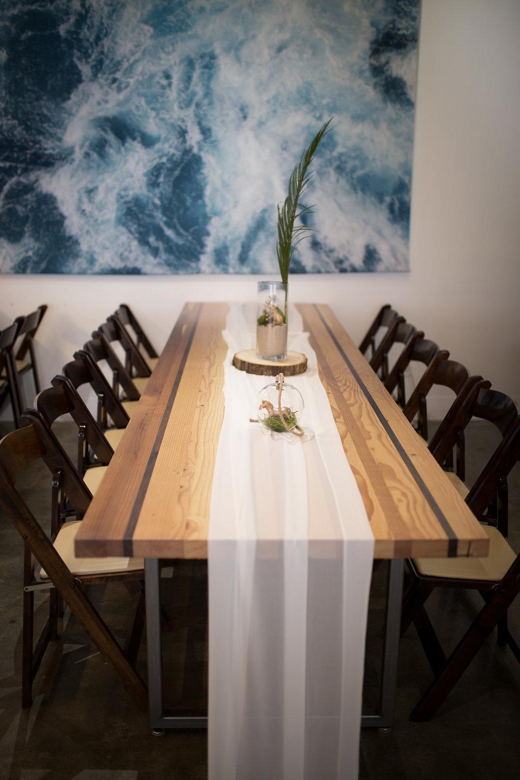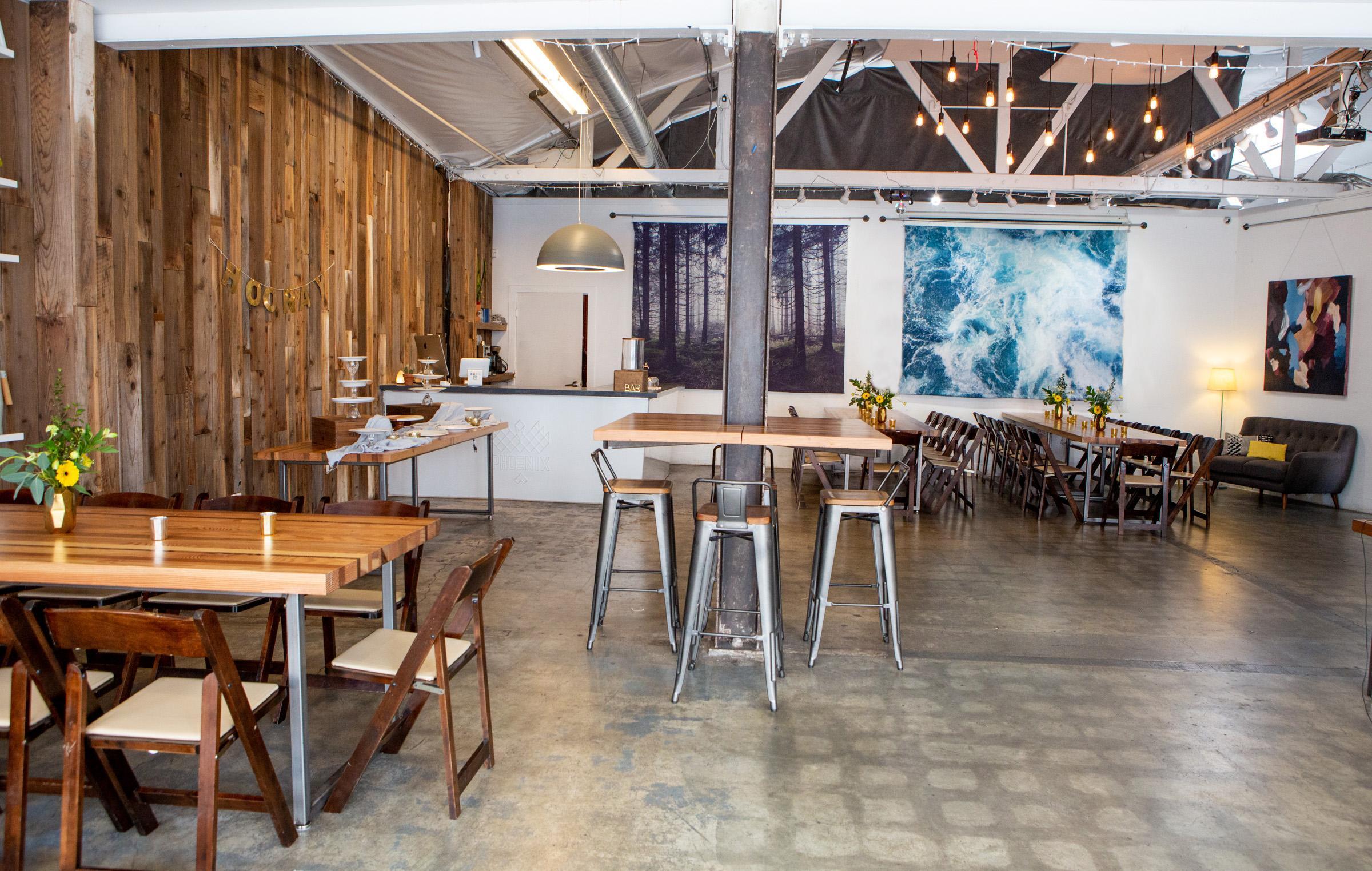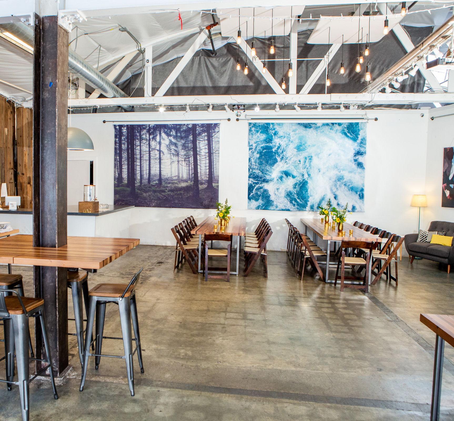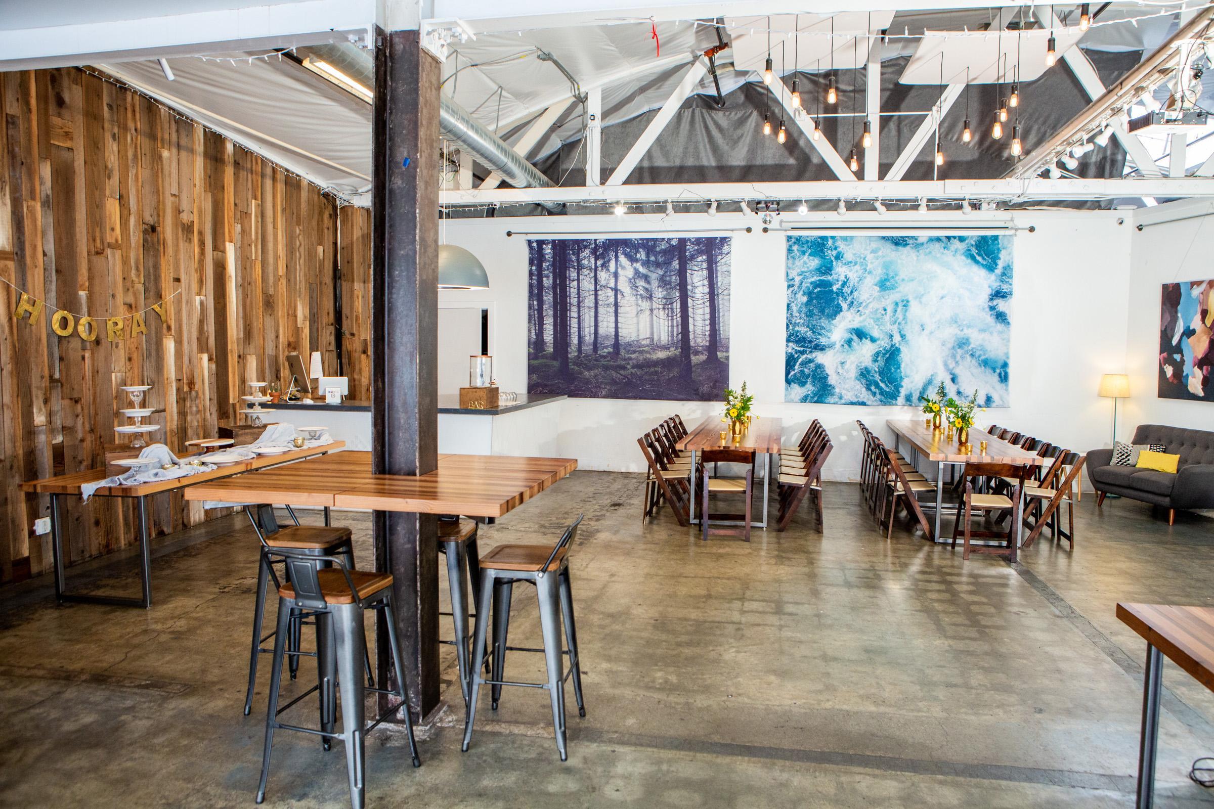 50 wooden padded folding chairs Gorgeous handmade wooden tables Small kitchen space Bluetooth surround sound speakers Bar area 2 wheelchair friendly restrooms Warm Edison bulb lighting Plants and art On-site Event Host Available to add on to any event: Event Design, Event Coordination Custom Floor plan design including the Pre-Set of tables and chairs A full selection of functional and stylish on site rentals AV Equipment Extra staff: Bartenders, Bussers and Servers