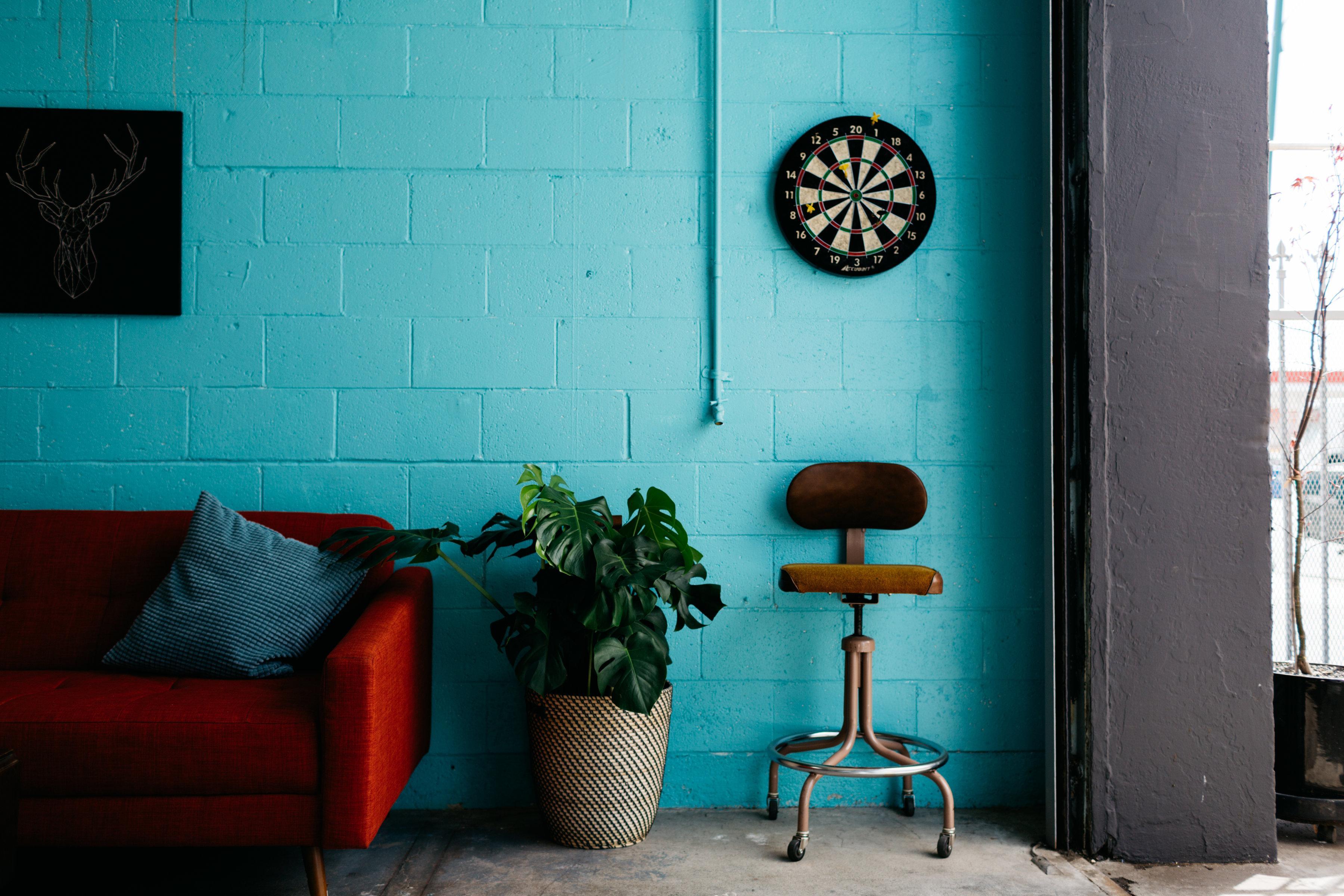 Our main space is a gorgeous industrial space with great lighting featuring a driftwood wall, tons of plants, art and a smooth concrete floor great for dancing the night away. Included are the use of our indoor / outdoor lounge area with edgy mural, popping teal wall and orange couch. Our cozy outdoor patio features lounge furniture , bright outdoor rugs, a fragrant jasmin wall and fun throw pillows + market lighting.