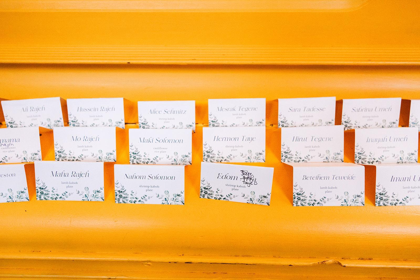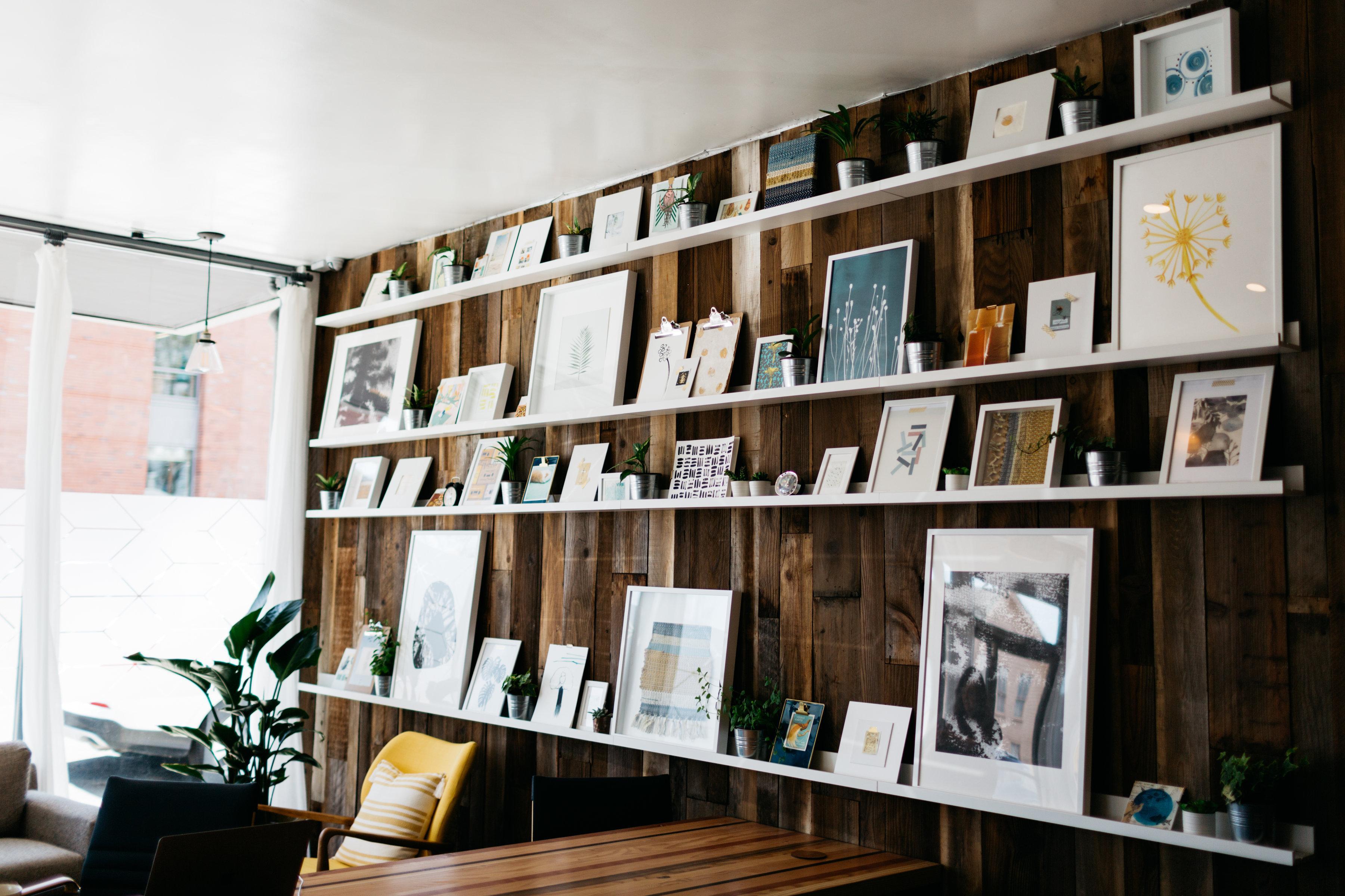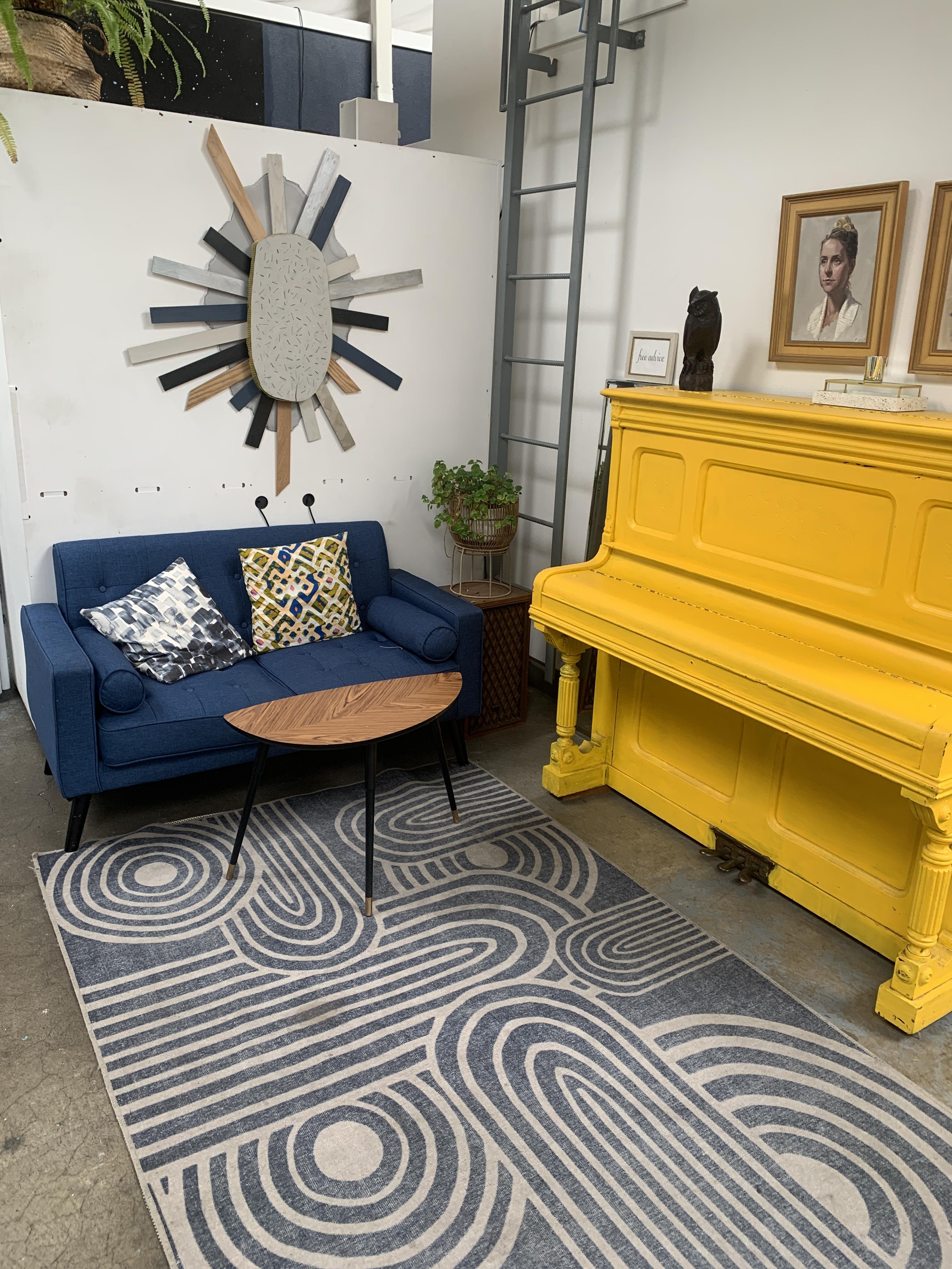 - yellow piano - 2x huge bean bags - 2x high top tables - 6x stools - lots of art - 8 ft wooden table - small couch and rug - market lighting