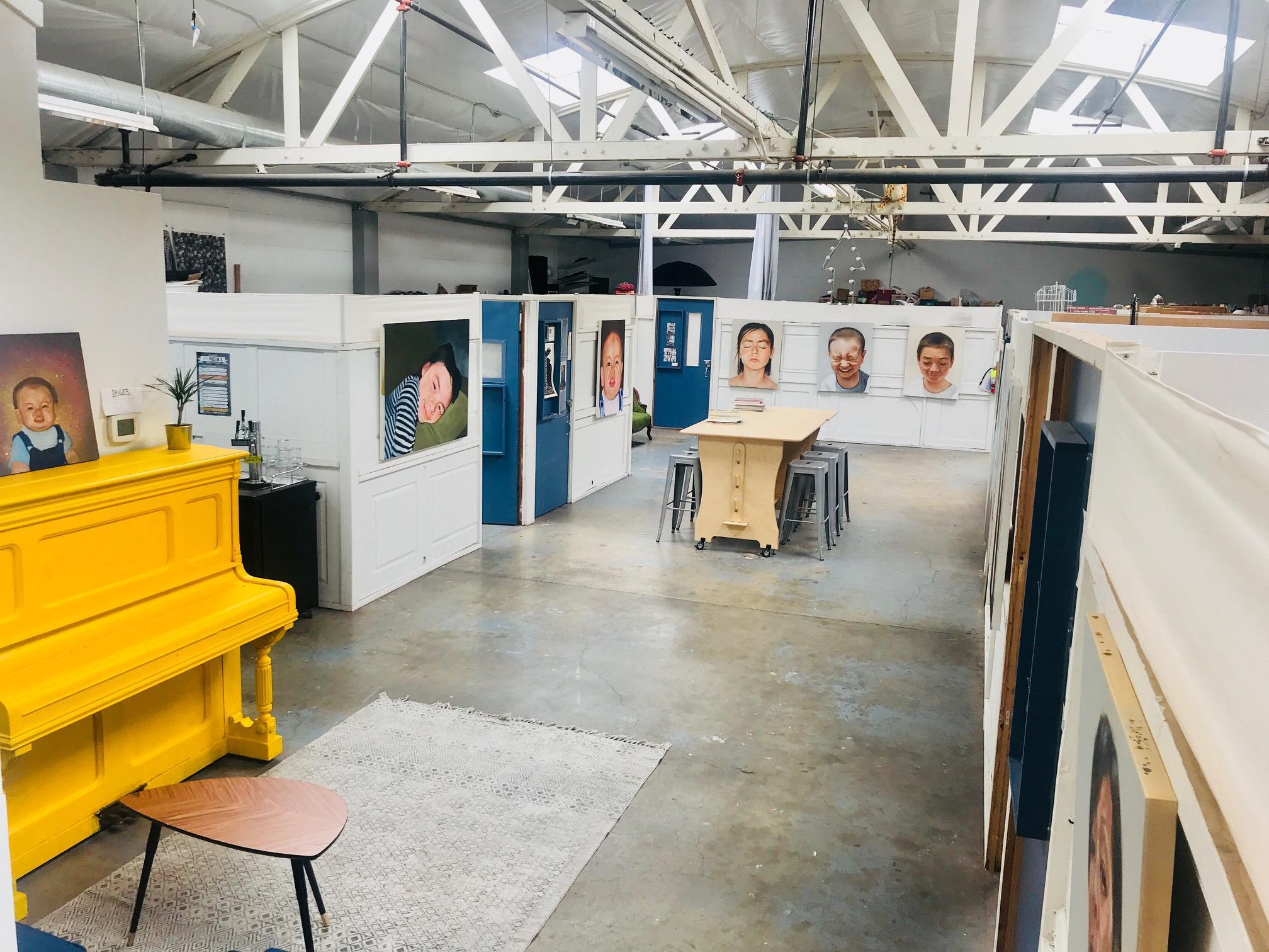 This space features the middle area of our art studios. This space is great for parties with a larger guest count (overflow, buffet set up) or for a smaller wedding ceremony. It is also used as a kids activity space or teen zone. The Art Gallery has skylights (day) and market string lights for the evening. It is a required add on for weddings with more than 50 guests or full service catering. It features a funky yellow piano, huge bean bags for relaxing, high top tables with stools.