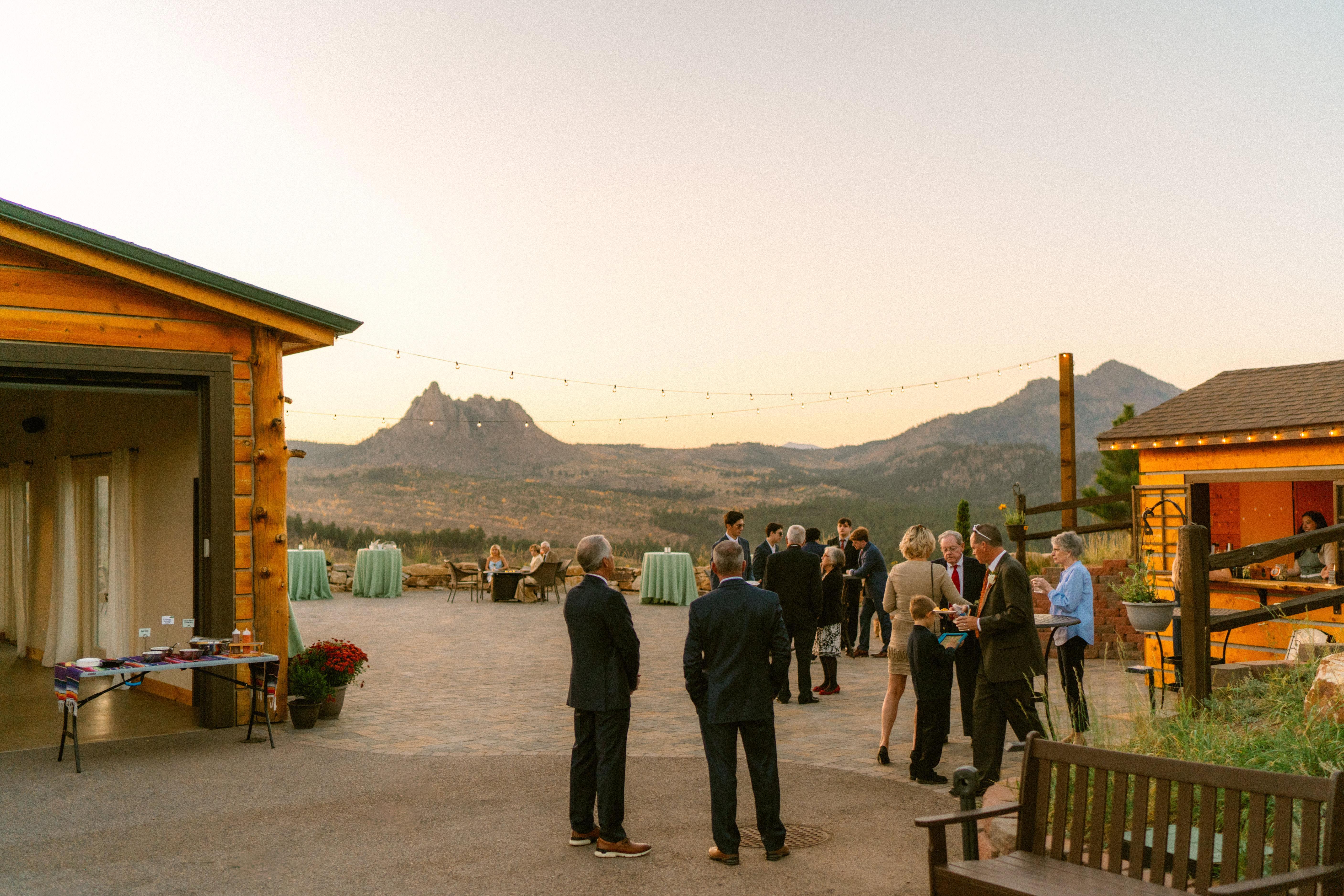 The 3,000 sqft. patio at Pikes Peak Ranch offers stunning mountain views of Thunderbutte, Sheepnose, & the forest. Featuring an outdoor bar, cocktail tables, & three propane fire pits w/ seating, it’s perfect for any event. Equipped with an outdoor sound system, it supports handheld, lapel, & headset mics. With ceremony seating for up to 145 guests, string lights, & yard games, this flexible space is ideal for outdoor dinners, cocktail hours, or ceremonies, creating an unforgettable experience.