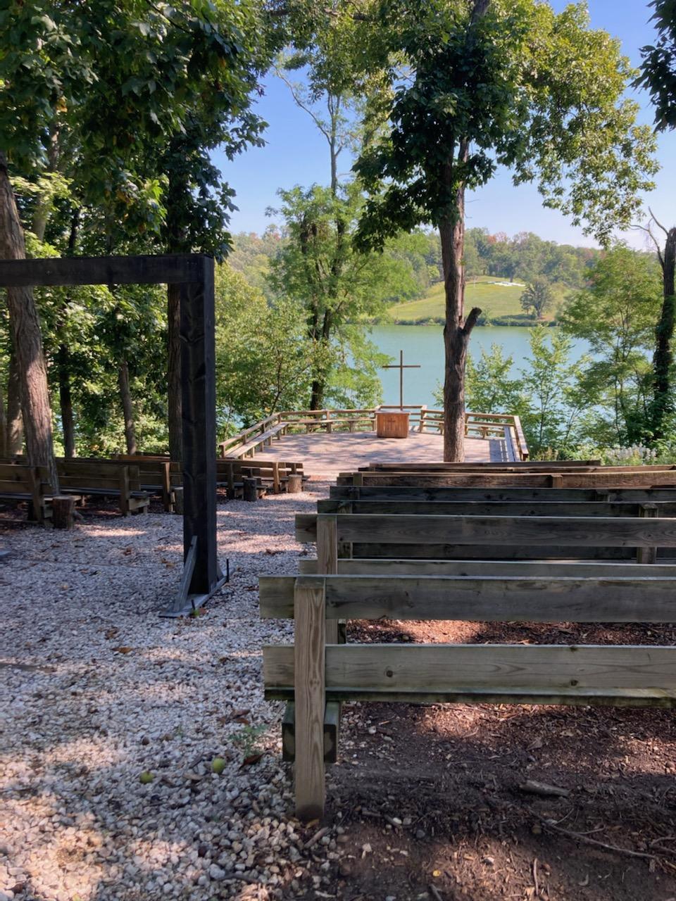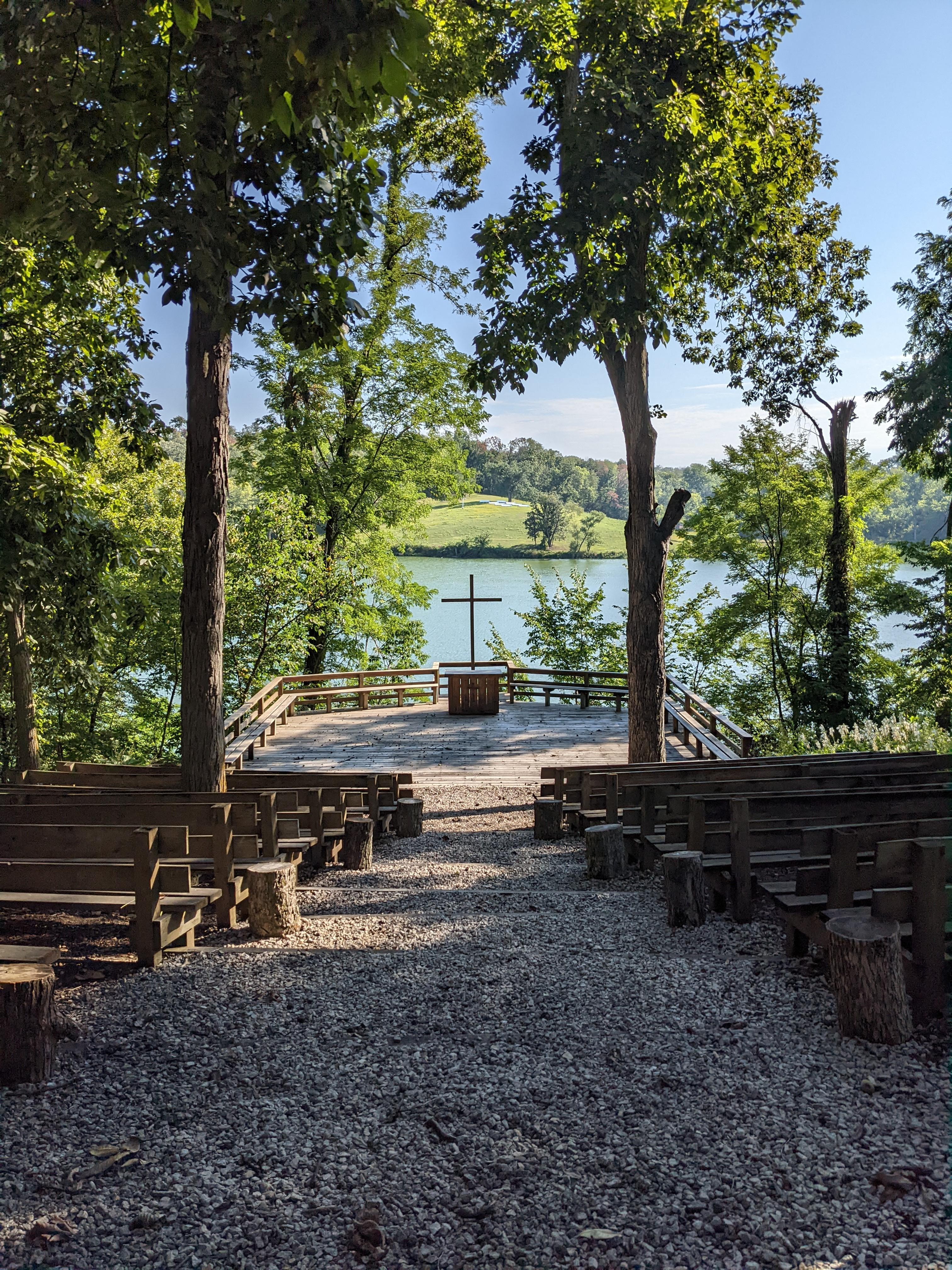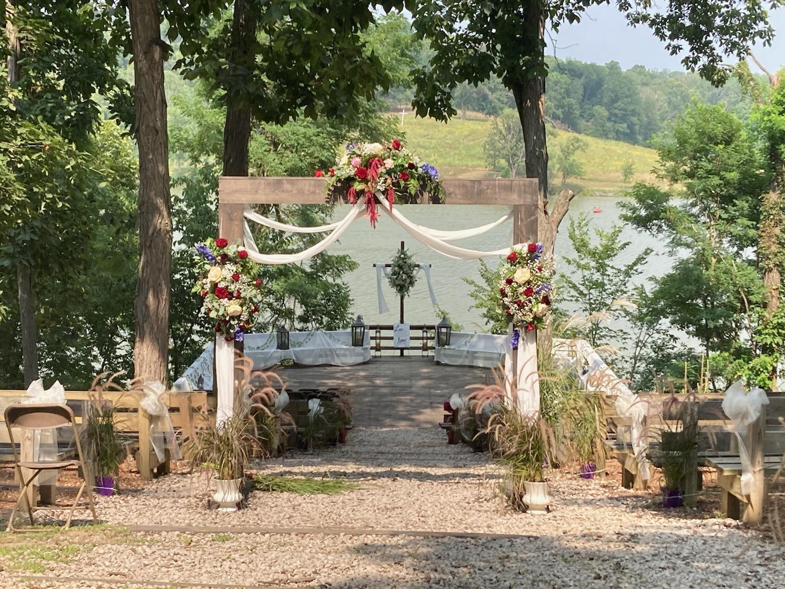Vesper Point features a stunning view over our private, 80-acre lake. It has wooden benches that can seat up to 150 people or 200 standing.