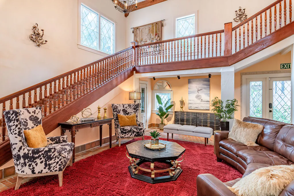 Whether you’re seeking a sweeping formal entertaining space or simply a cozy, intimate after-dinner game of chess, the Pillars Castle will perfectly suit your needs. The Grand Hall is the ultimate gathering space with its soaring two-story ceiling and dramatic staircase. One can almost hear the echoes of the clinking of glasses and laughter from parties in years’ past. The baby grand piano is right at home here, just waiting to add to the festive ambiance. Bring back the age of grand entertainment and style that this opulent room was built for! The famous statue "life" was sculpted here in 1920 along with many other famous works of art.