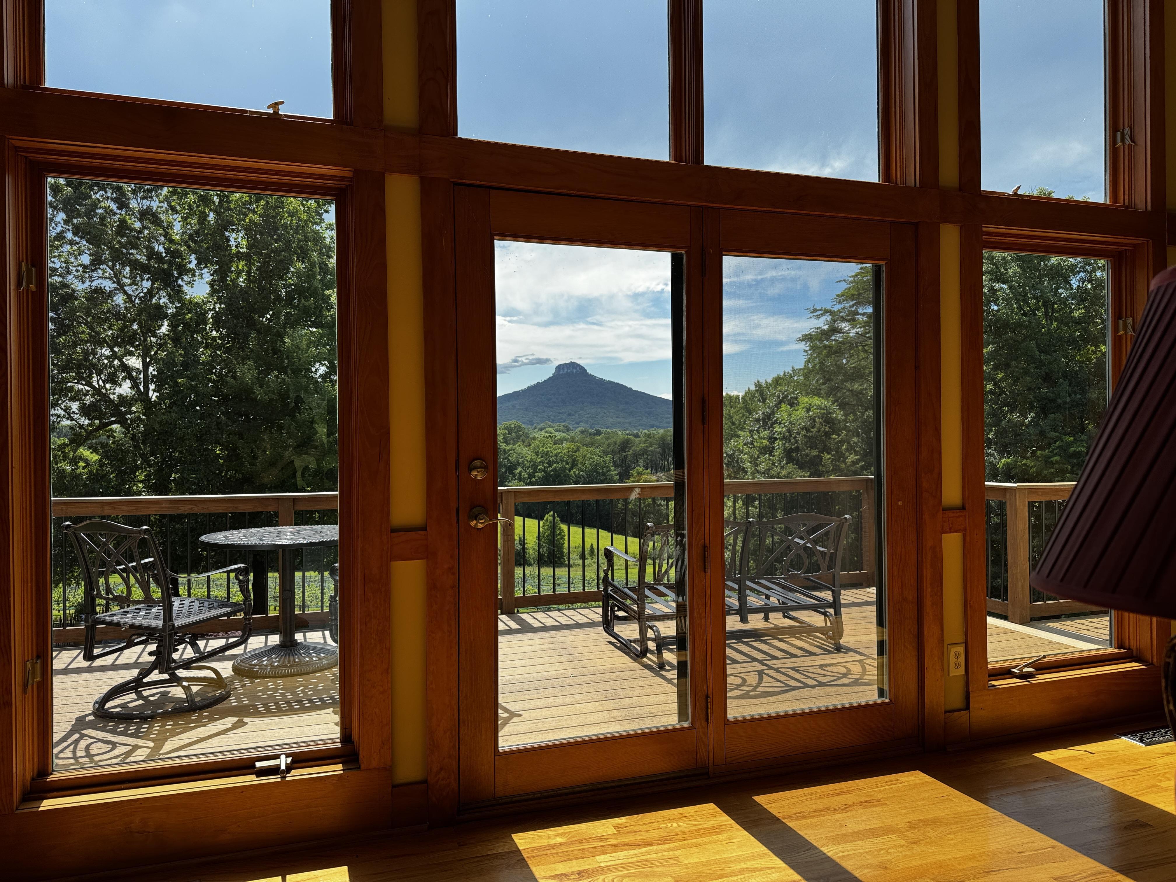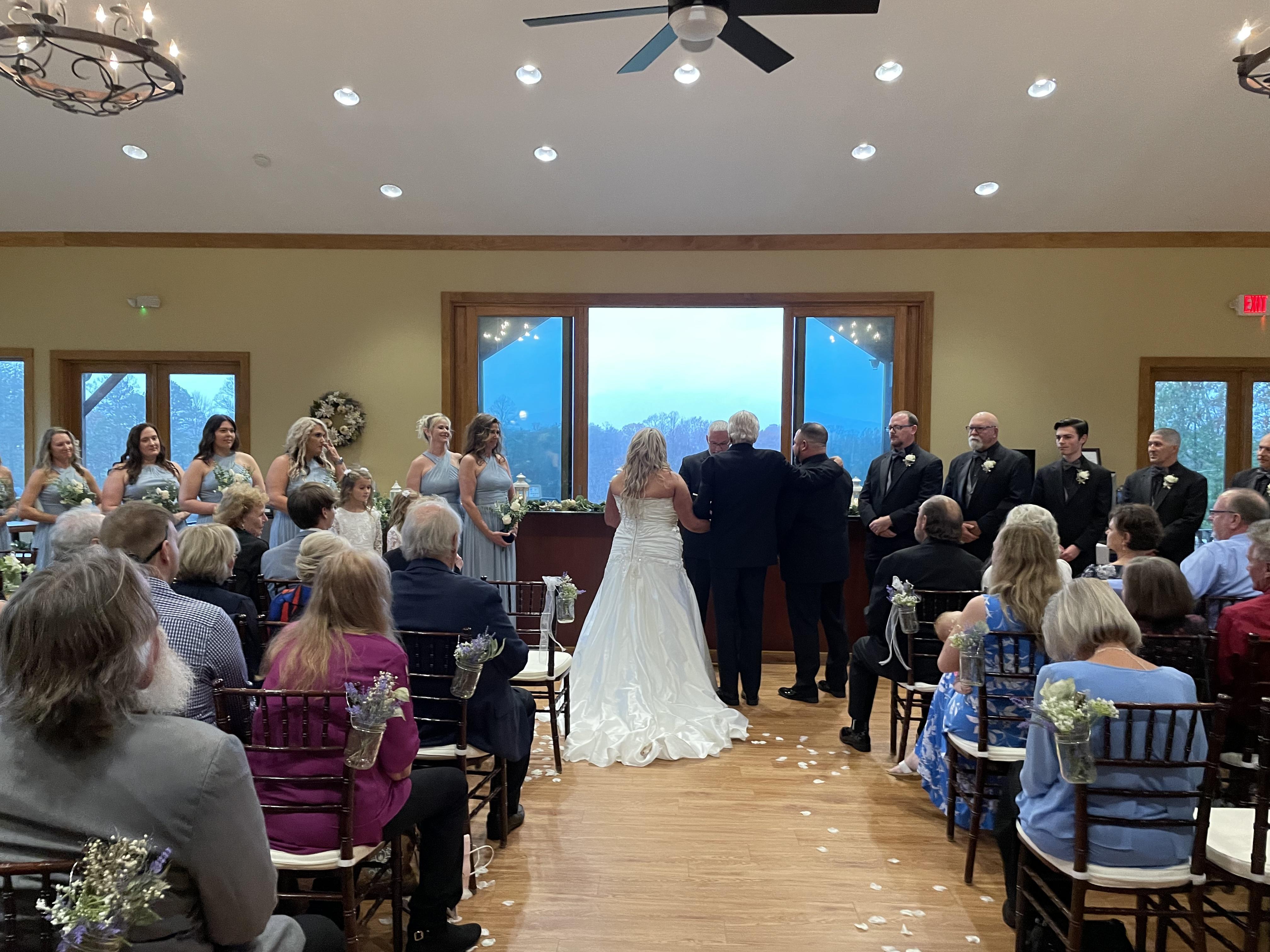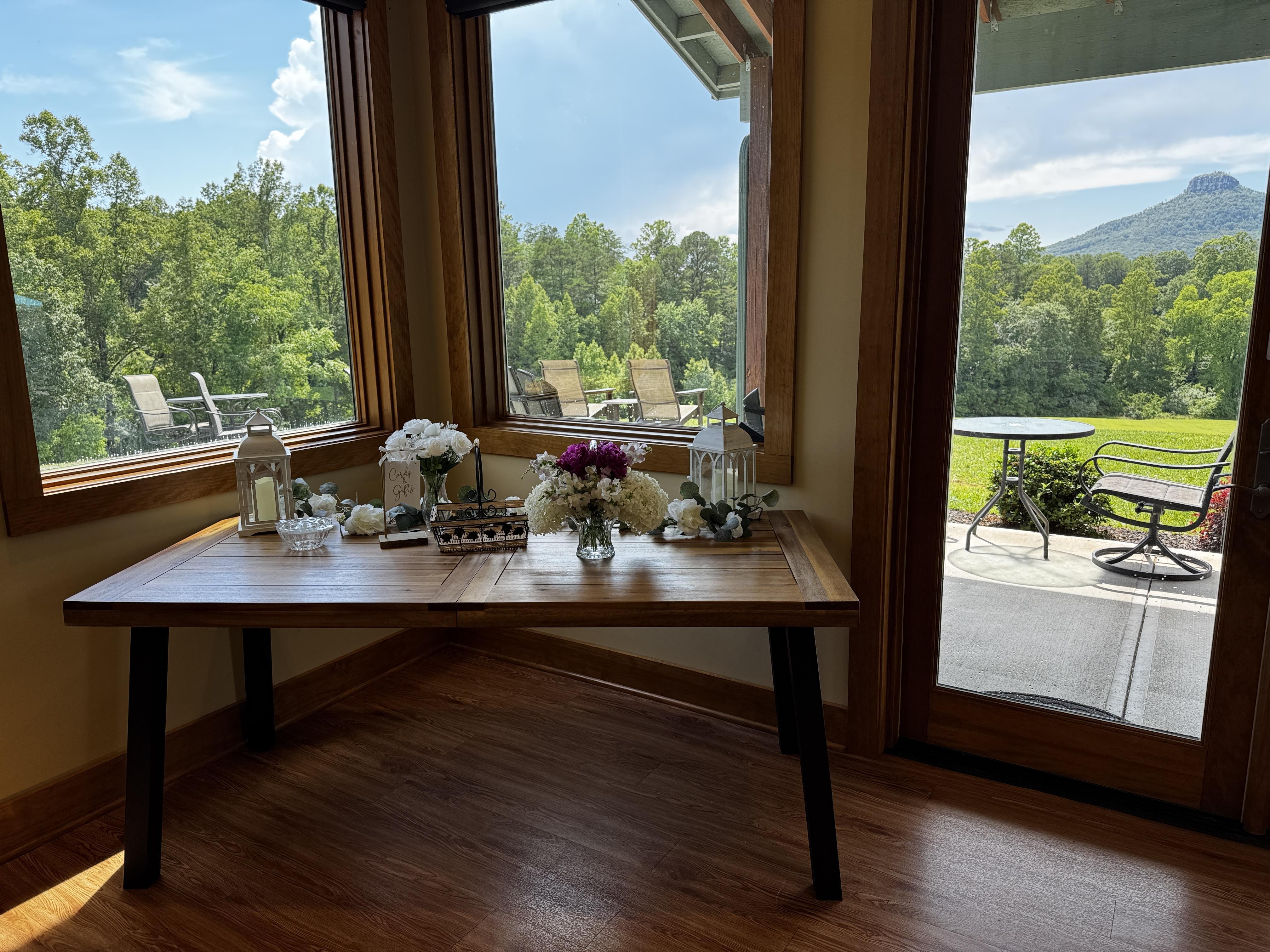 The floor to ceiling windows provide a stunning backdrop for an indoor wedding. The covered patio allows for an indoor/outdoor ceremony even with a little rain. We set up the chiavari chairs facing Pilot Mountain for a beautiful view.