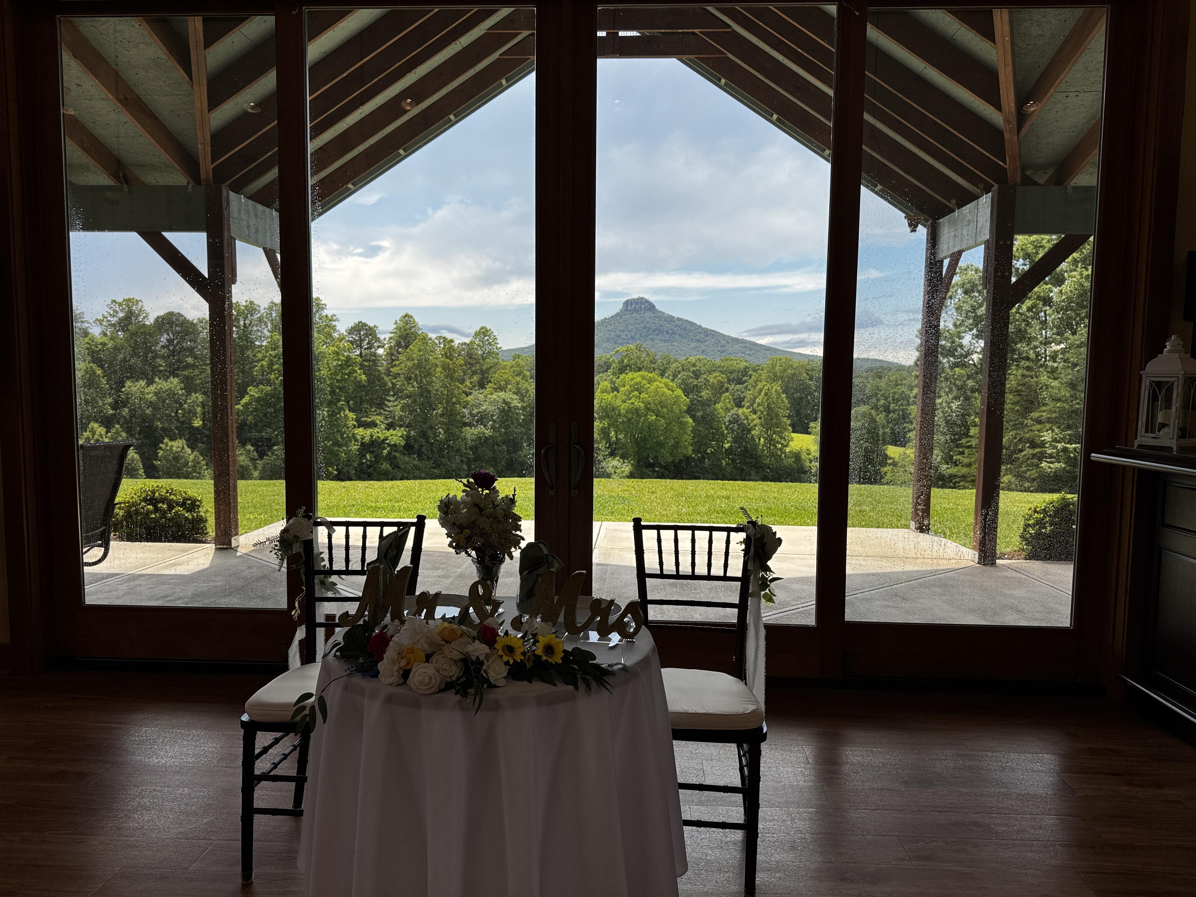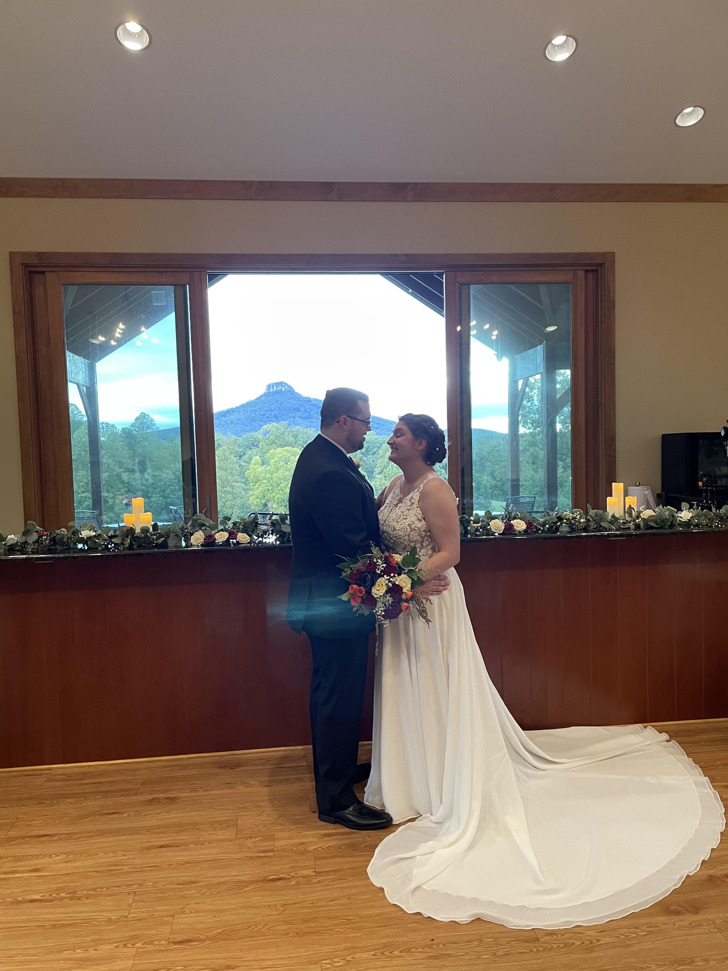 The venue was amazing, stunning view of Pilot Mt. and lots of lovely nature, and flowers and vineyards around. The staff handled catering, decorations and DJ taking that stress off of us. They also were very organized and had a very thorough plan so that day of everything ran soothly. Venue is in good condition and a great for the price.