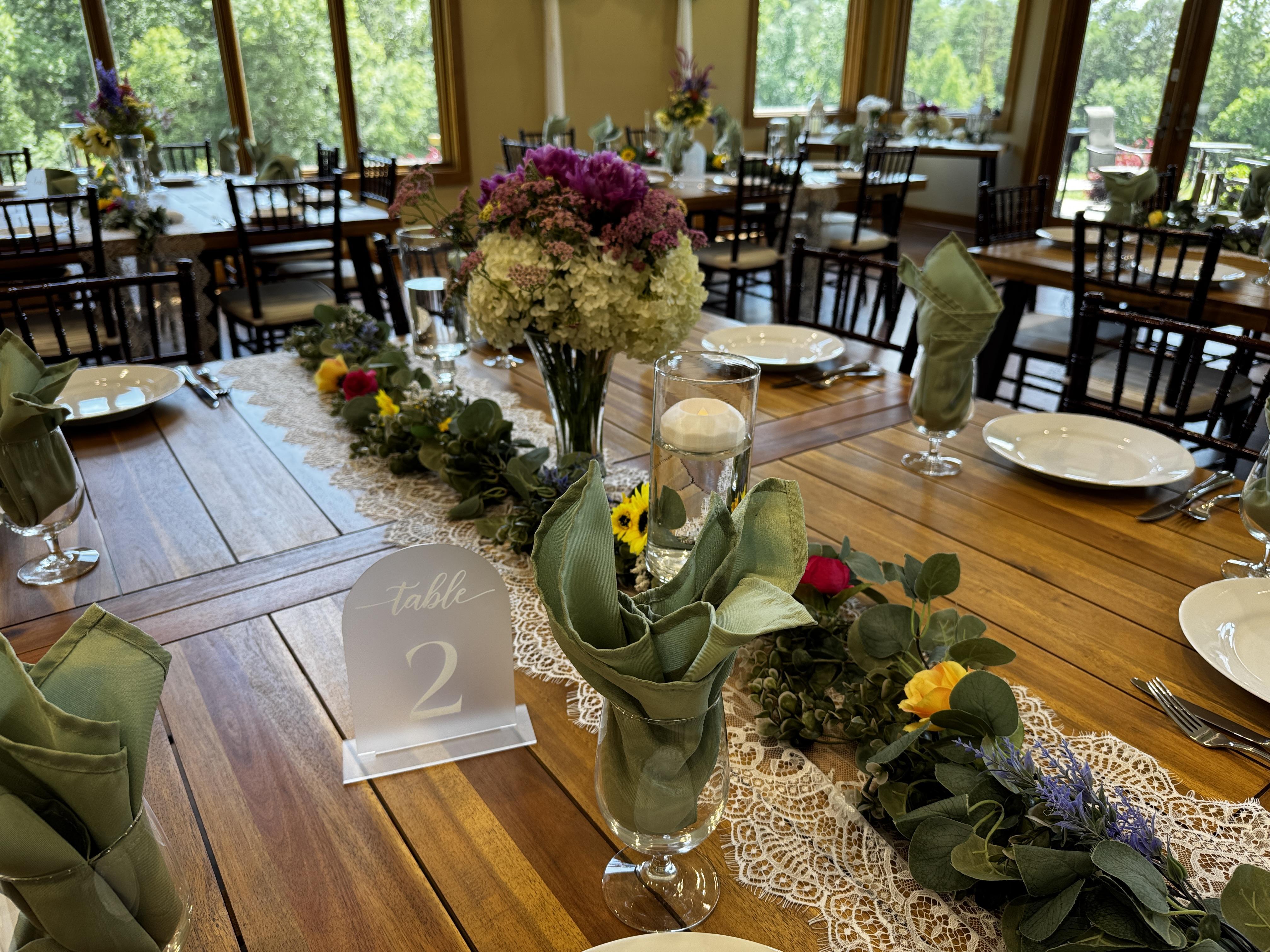 Our beautiful reception venue makes a special setting for your wedding reception. Our all inclusive package includes decor, dinner plates, silverware, cloth napkins, wine glasses, water goblets and floating LED candles for a romantic atmosphere.