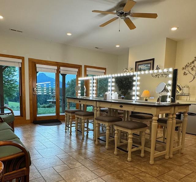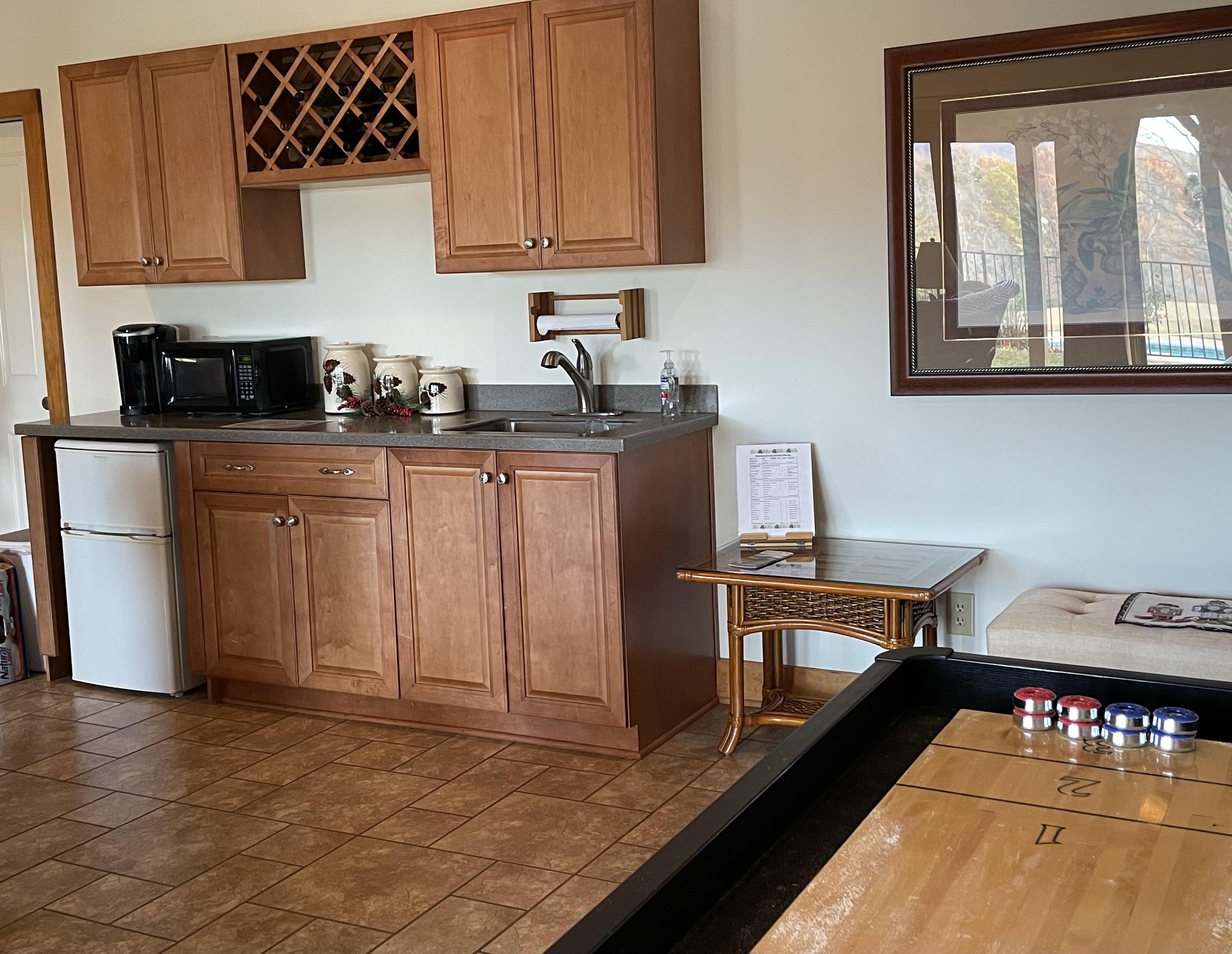 The ladies space includes a hair & make up salon with 8 Hollywood makeup mirrors, a separate dressing room with a 7’ mirror and ladies rest room. The space includes a patio to enjoy relaxing outside, kitchenette with coffee maker, under counter fridge, ice maker, microwave and sink. The guys side has a game room with a poker table, 55" TV, mini bar and seating for 10. There is also a dressing room with full size couch & chairs to relax, second restroom and patio with table & chairs.