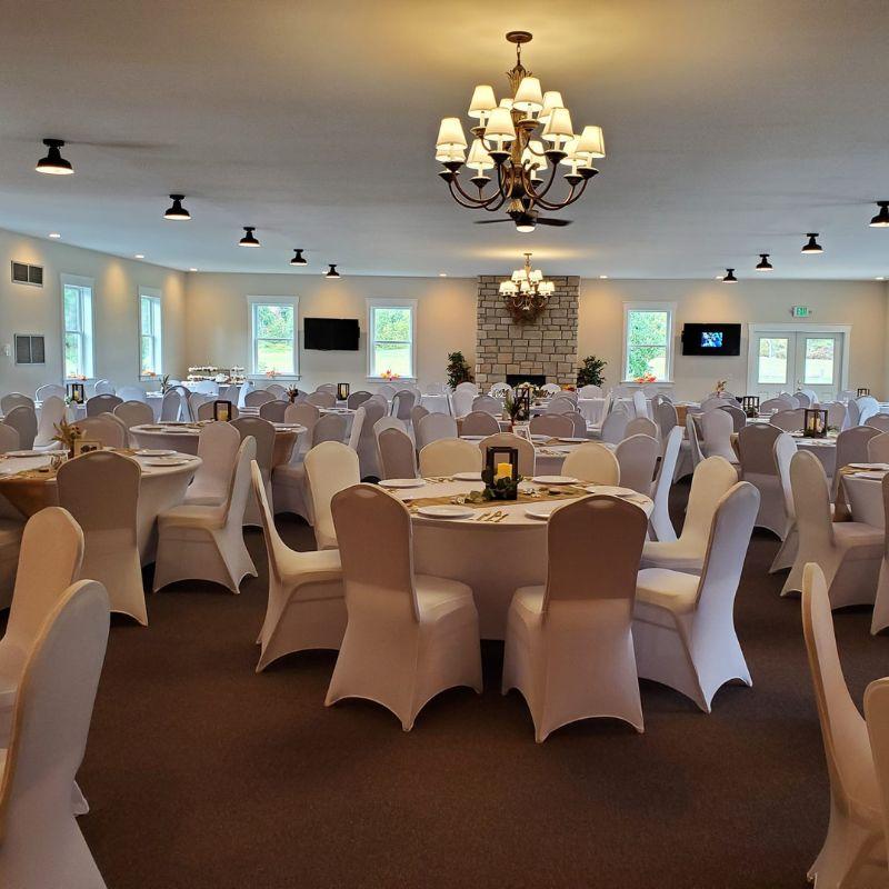 It features a wood-burning fireplace, large round tables with chairs, a large projection screen in case you want to play a slideshow or have a presentation, and several large flat-screen TVs in case you or your guests want to watch the big game.