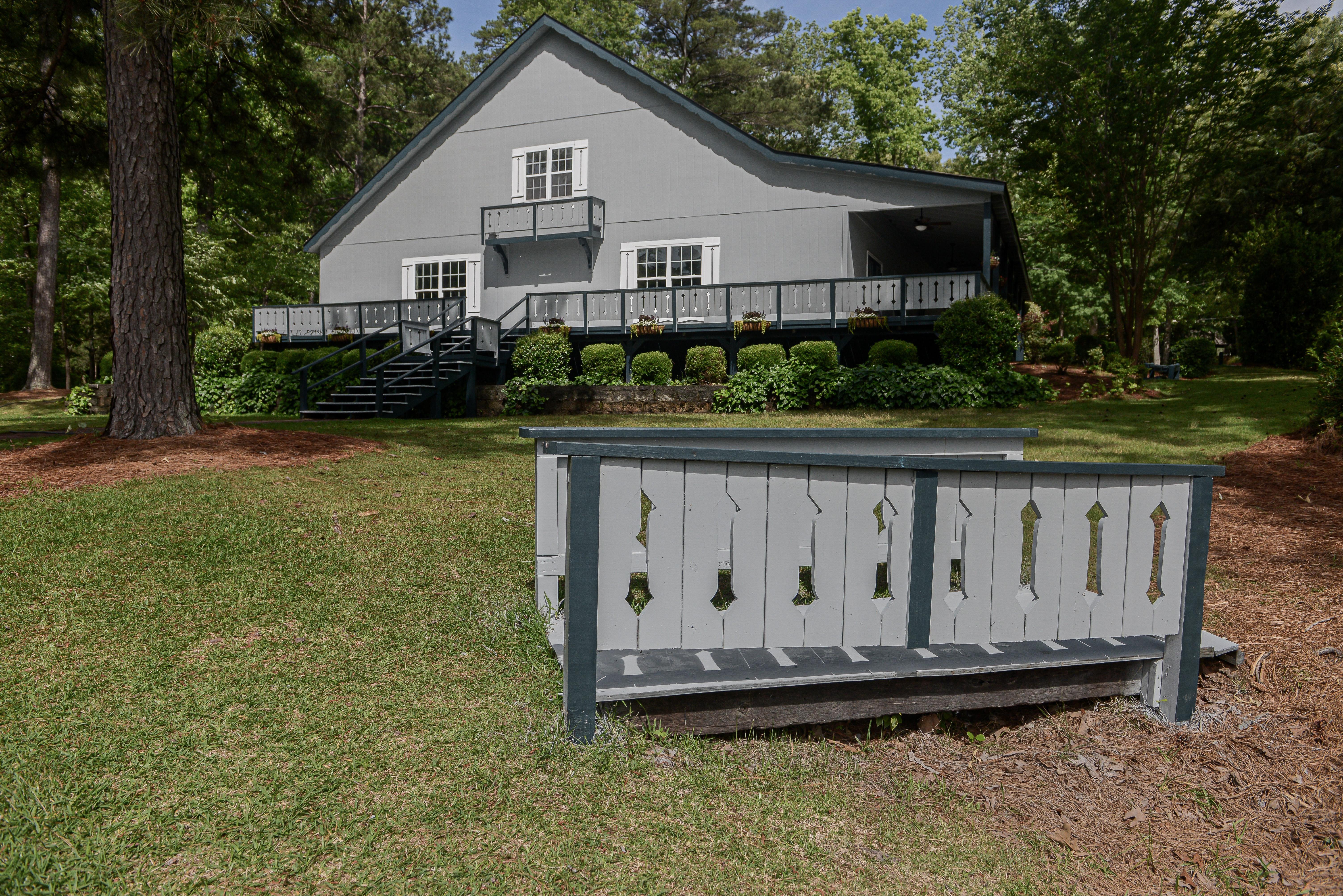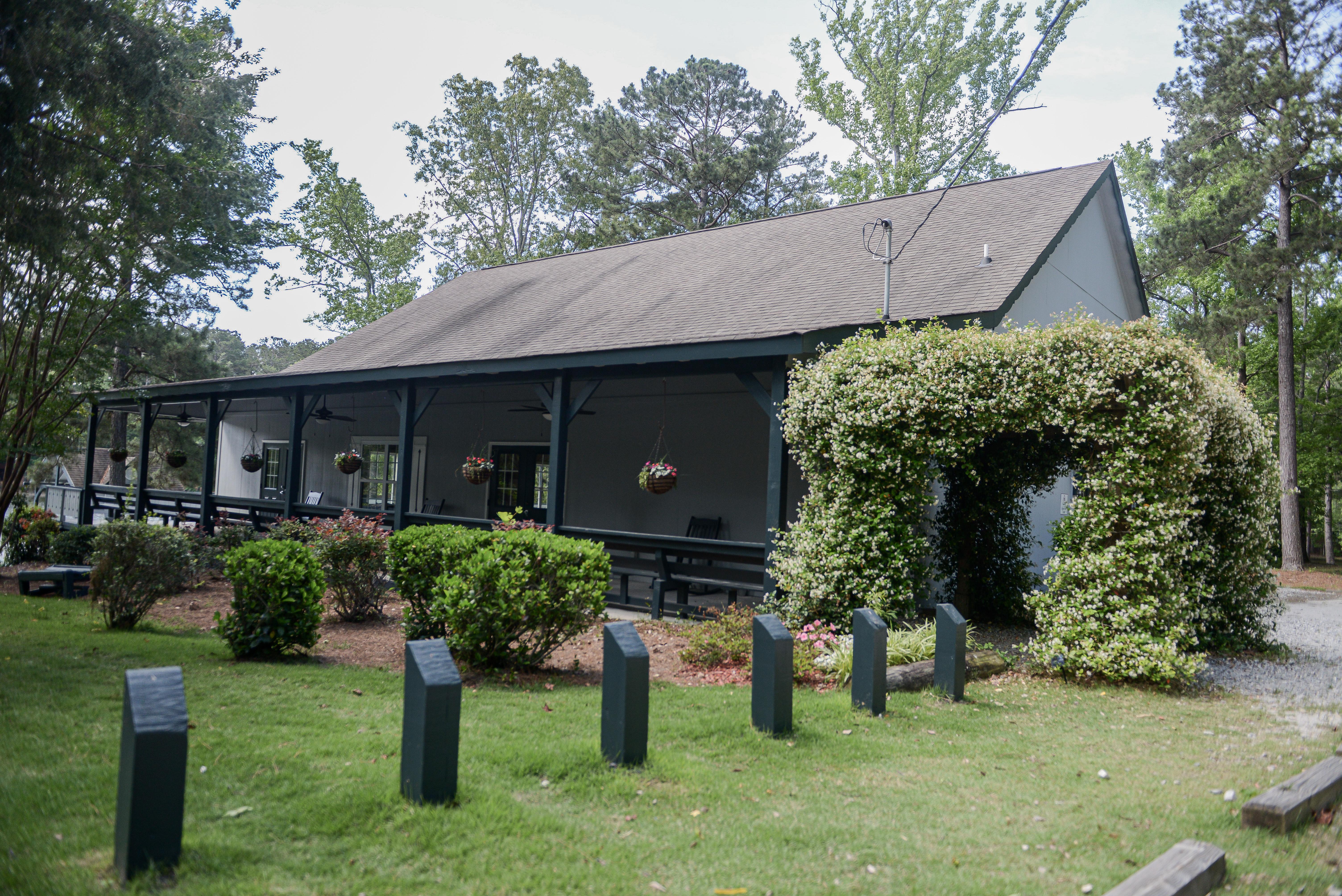 Courson's Clubhouse is a banquet hall featuring an open floor plan with natural stone flooring, dramatic open truss work ceiling, ample windows providing natural light, and a porch with outdoor seating. This facility also includes tables and chairs, private restroom, and complimentary parking. Outside vendors are permitted with no additional fees and on-site accommodations are available for those guests who wish to stay for the wedding.