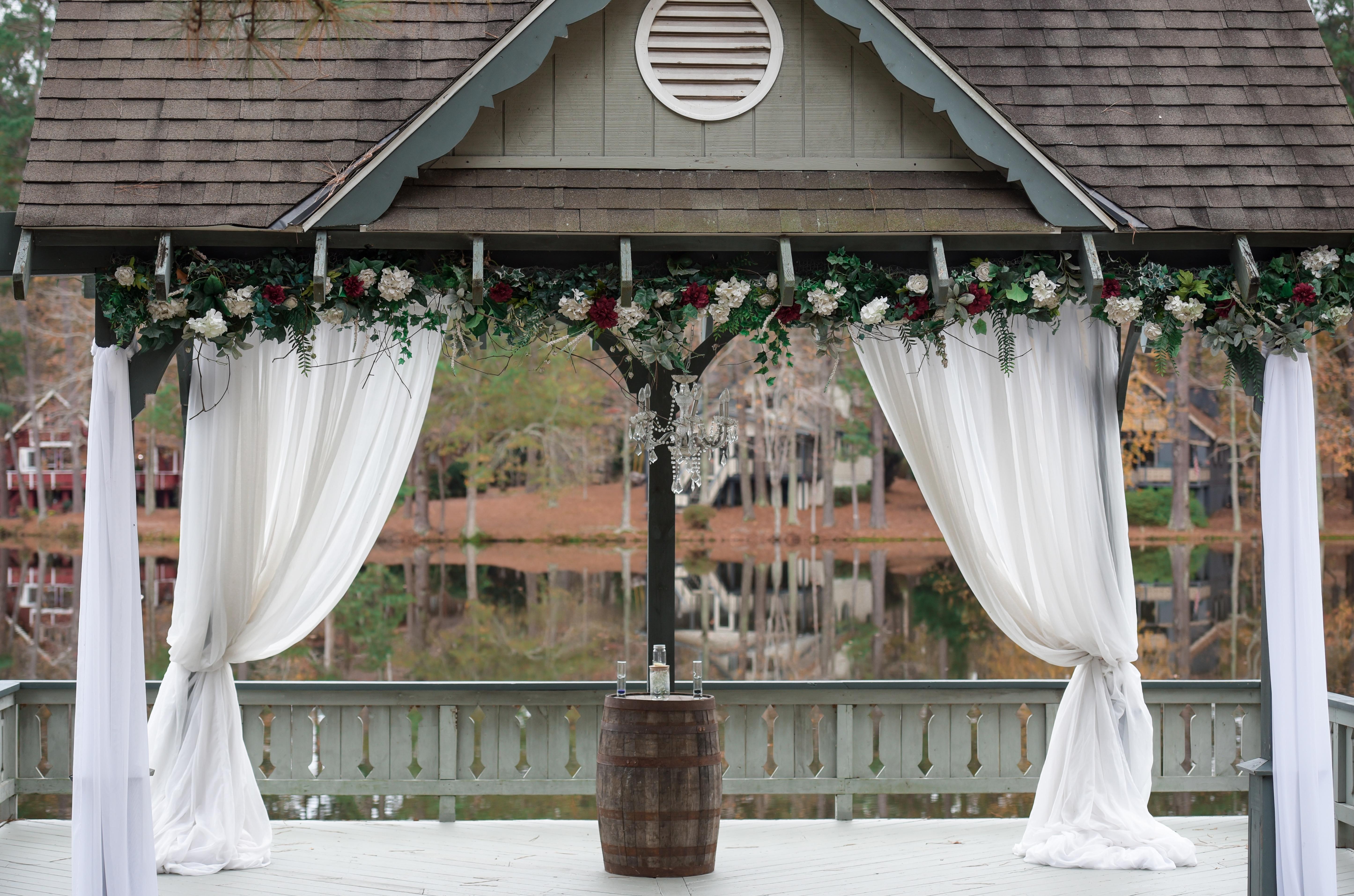 The Lakeside Wedding Pavilion and our Alpine Event Center for the DAY OF 3-bedroom cabin for two (2) nights Linen Package White Ceremony Chairs Tables and Chairs for Reception Access to our Catering kitchen Freedom to bring in any vendors Custom Premier Floral Package designed by the bride Custom 3-tier wedding cake Custom Groom's Cake Wedding Photographer 5 Hours of DJ Services $2000 Catering Credit Wedding Coordinator Rehearsal & “Day Of” Director Set-up, Breakdown, and Cleanup