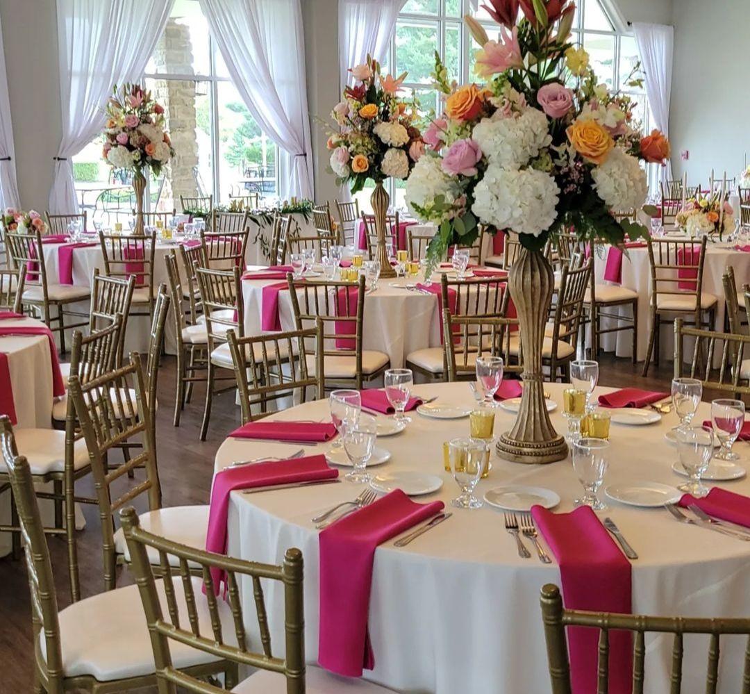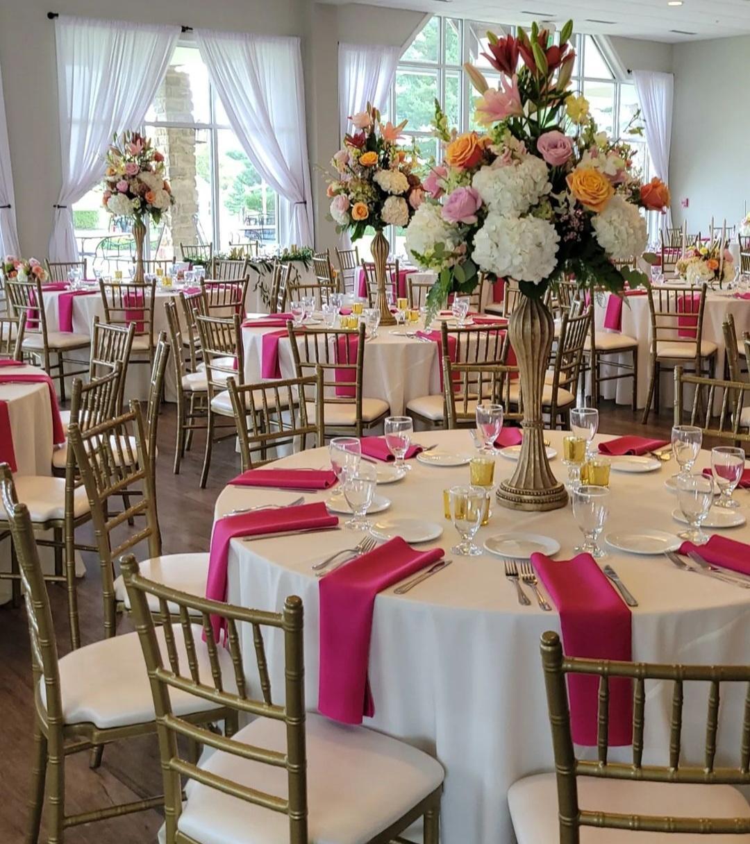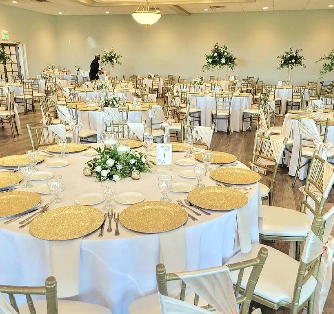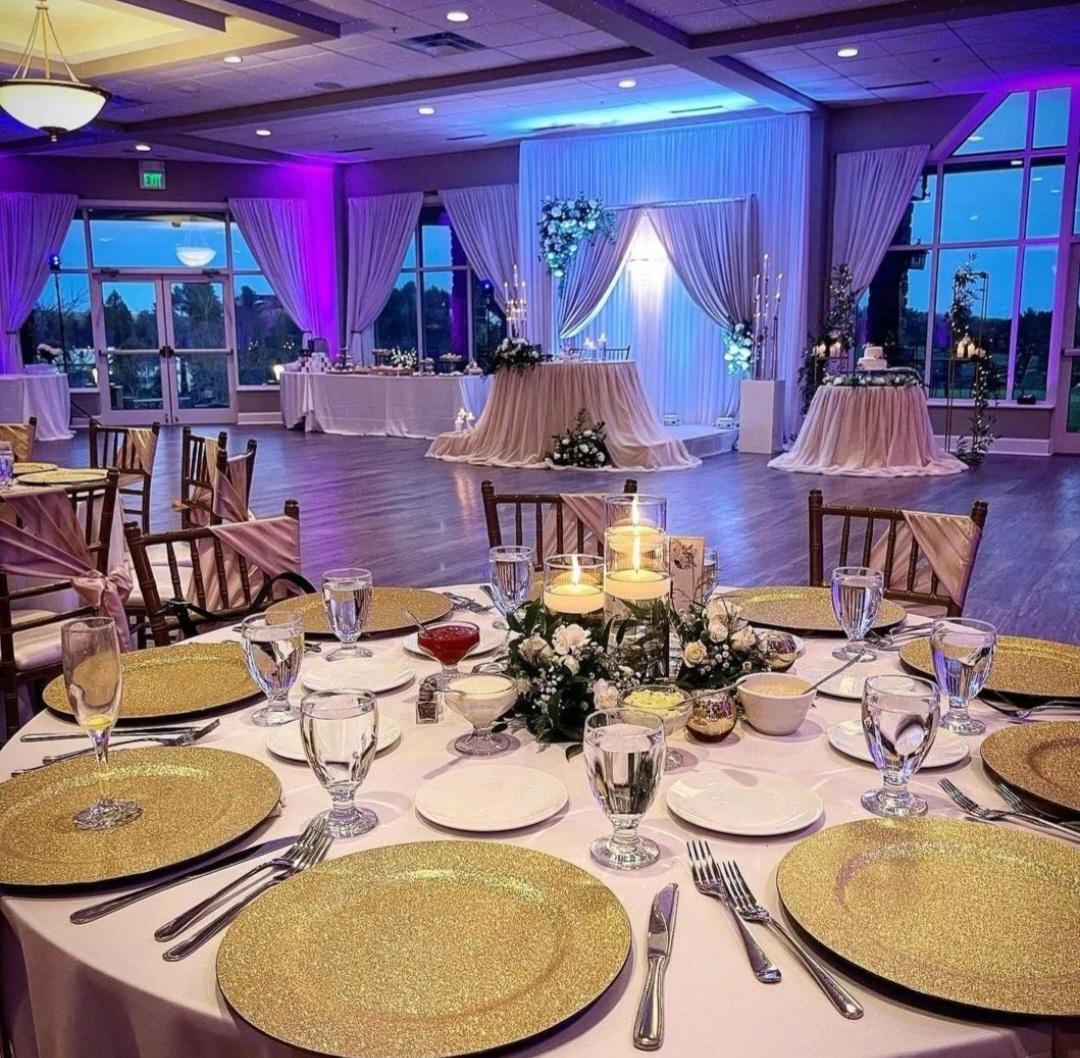 -Dimmers for lights -Gold Chiavari Chairs -Floor Length Tablecloths and Napkin Color of your choice -Two Centerpiece Options -Table Numbers -China, Flatware, & Glassware