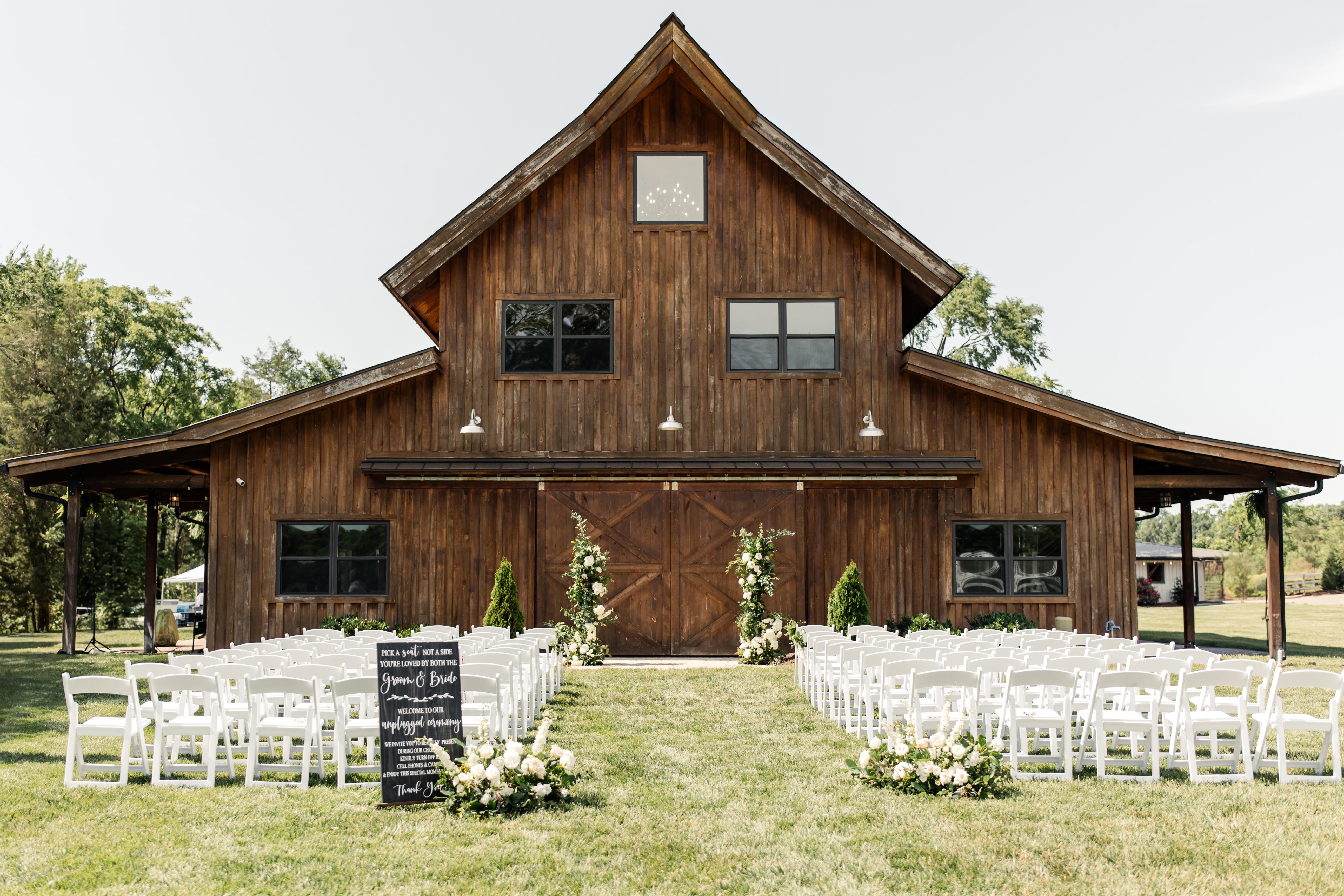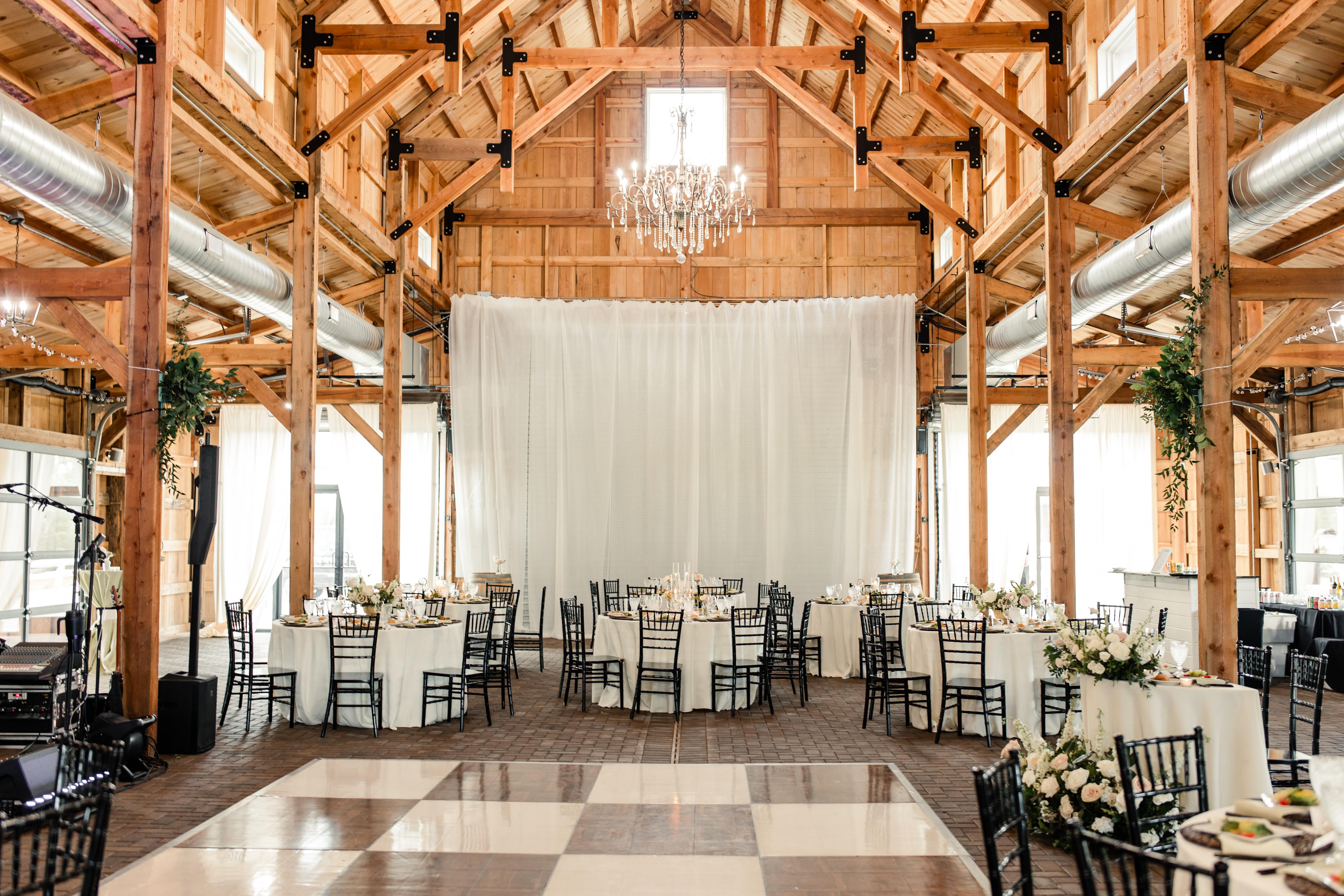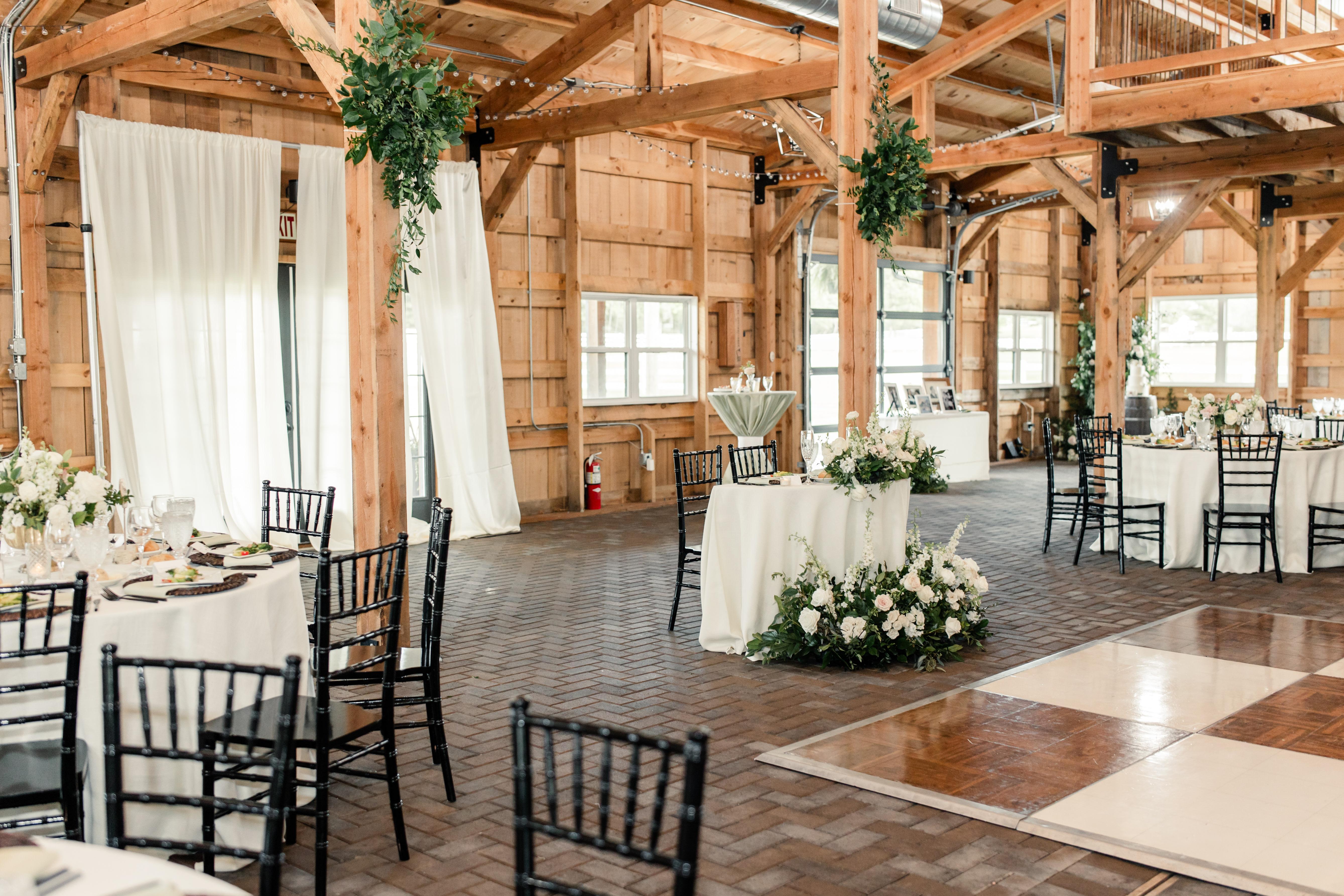 This 4,500 sq ft climate-controlled post-and-beam barn features elegant pavers and crystal chandeliers. In warmer months, the doors can be opened for a refreshing open-air breeze. With on-site bathrooms and Wi-Fi, the space comfortably accommodates up to 250 guests or more for cocktail-style events. The barn doors create a stunning modern rustic backdrop for your ceremony, while cocktail hour can be enjoyed under the overhang, overlooking the scenic pond and nature.