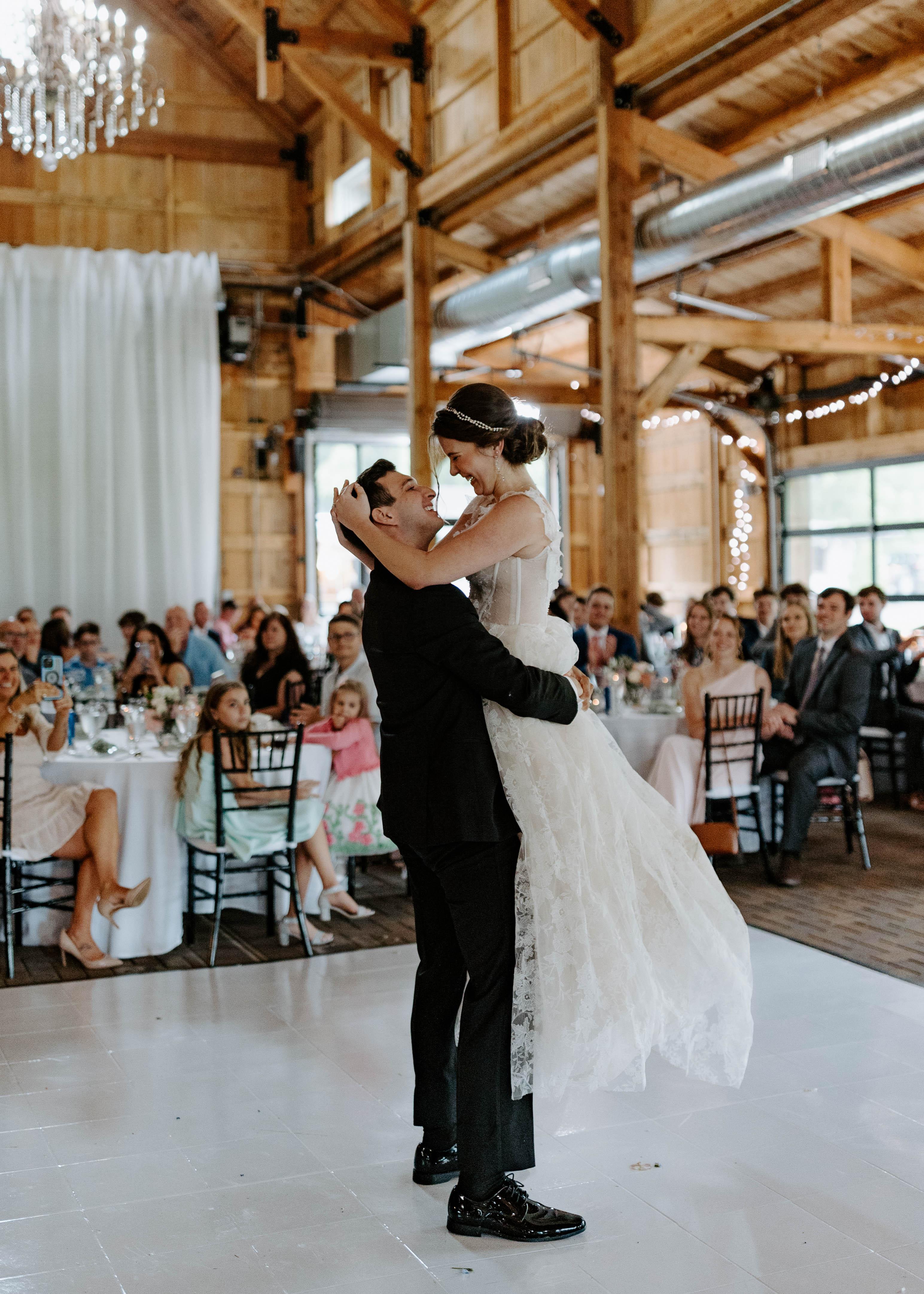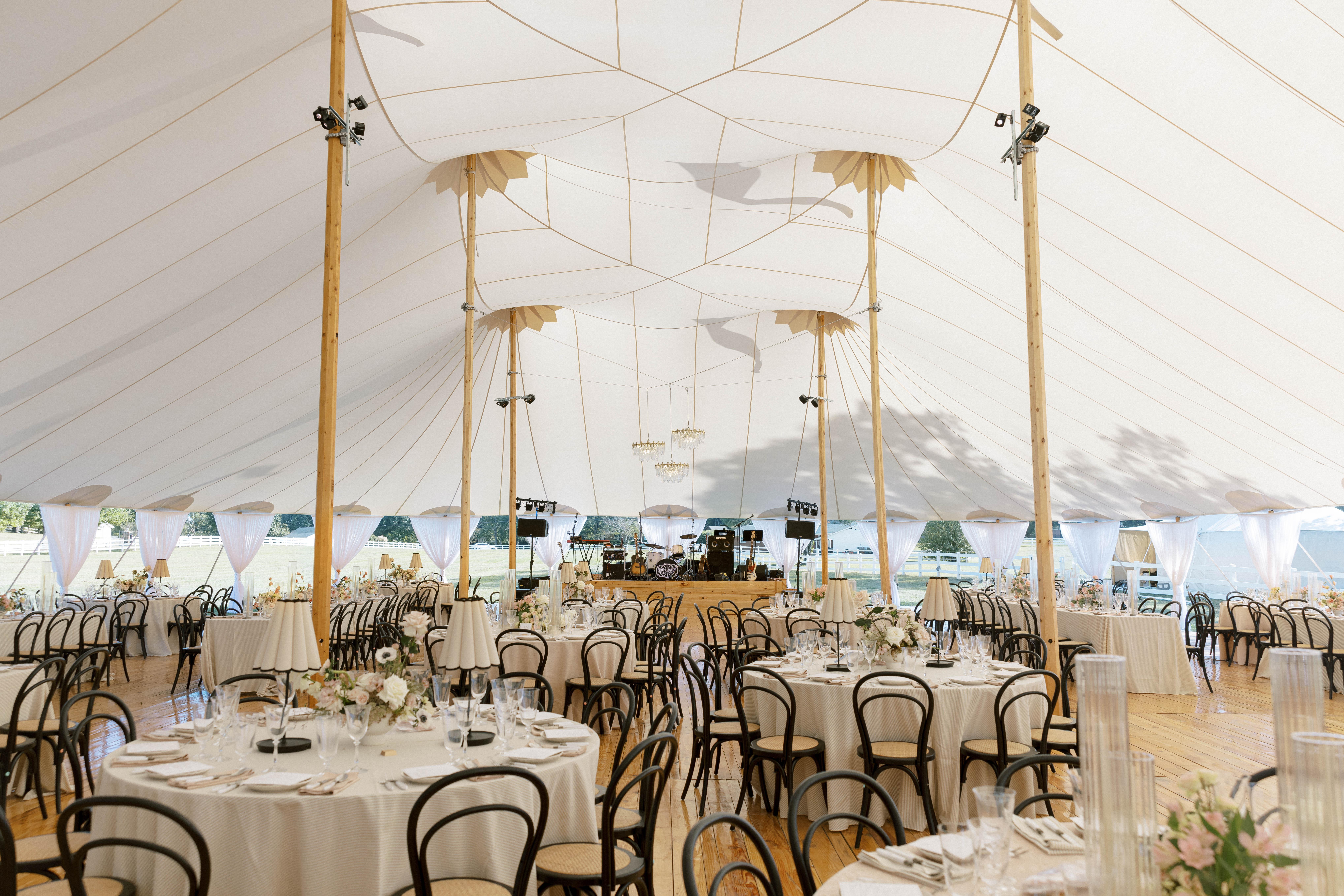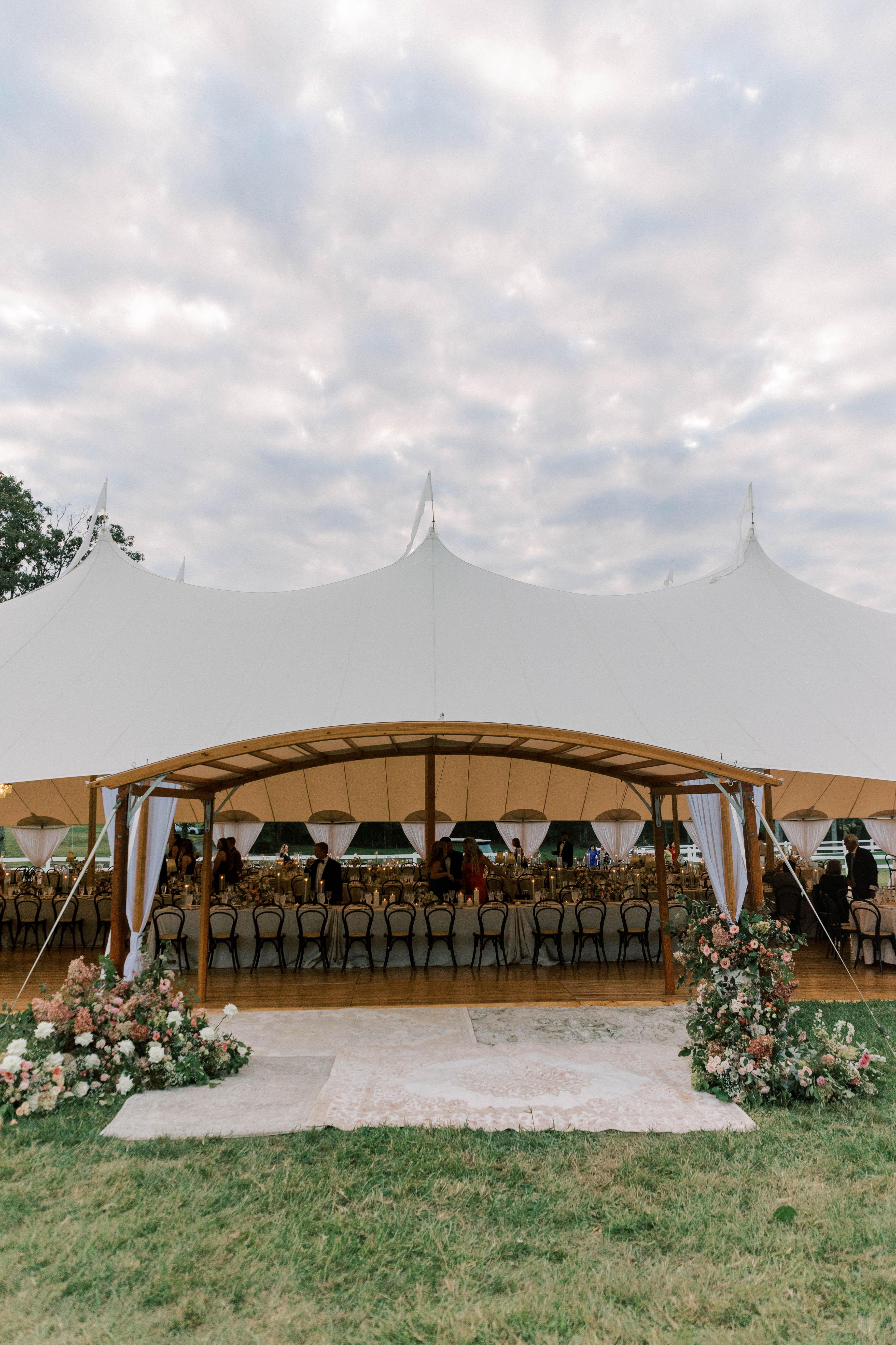 This 4,500 sq ft climate-controlled post-and-beam barn features elegant pavers and crystal chandeliers. In warmer months, the doors can be opened for a refreshing open-air breeze. With on-site bathrooms and Wi-Fi, the space comfortably accommodates up to 250 guests or more for cocktail-style events. The barn doors create a stunning modern rustic backdrop for your ceremony, while cocktail hour can be enjoyed under the overhang, overlooking the scenic pond and nature.