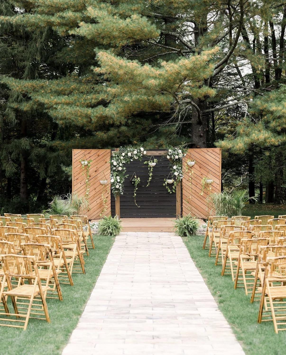 The outdoor ceremony site features an altar surrounded by lush greenery and bamboo chairs to seat all of your guests. Customize our wood backdrop with the vision of your choosing or enhance it with venue provided greenery. First look and photo opportunity areas are scattered throughout our outdoor space.