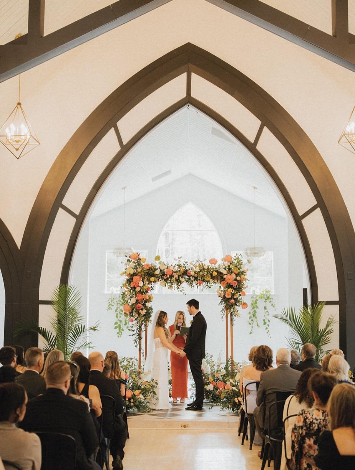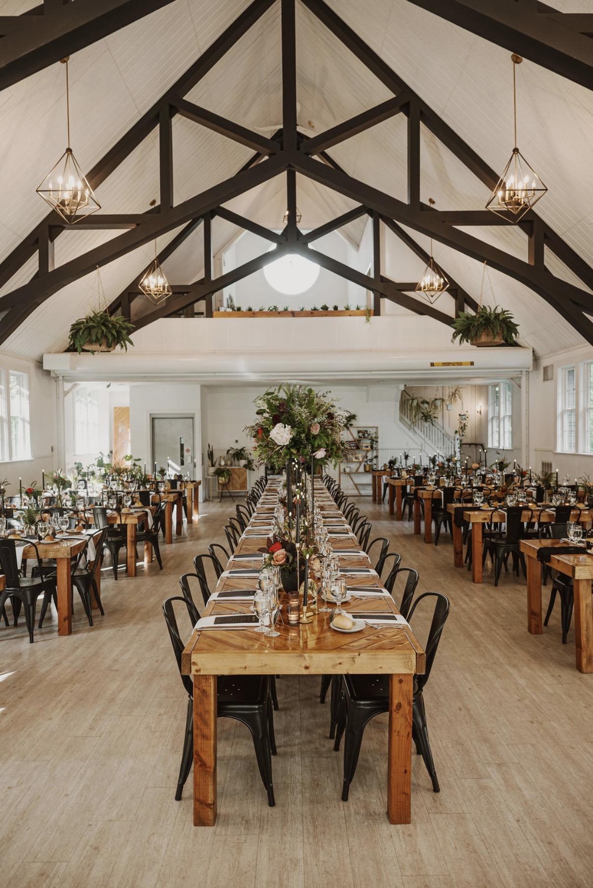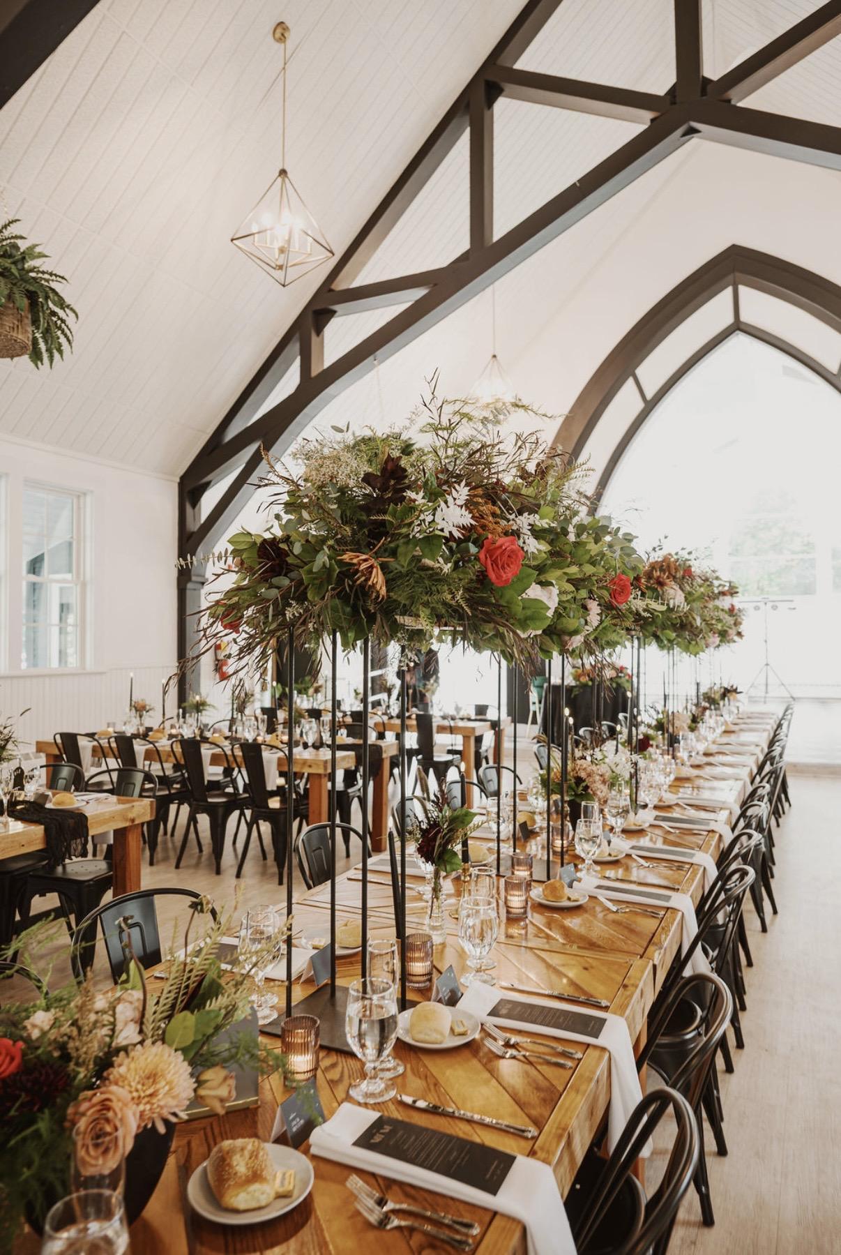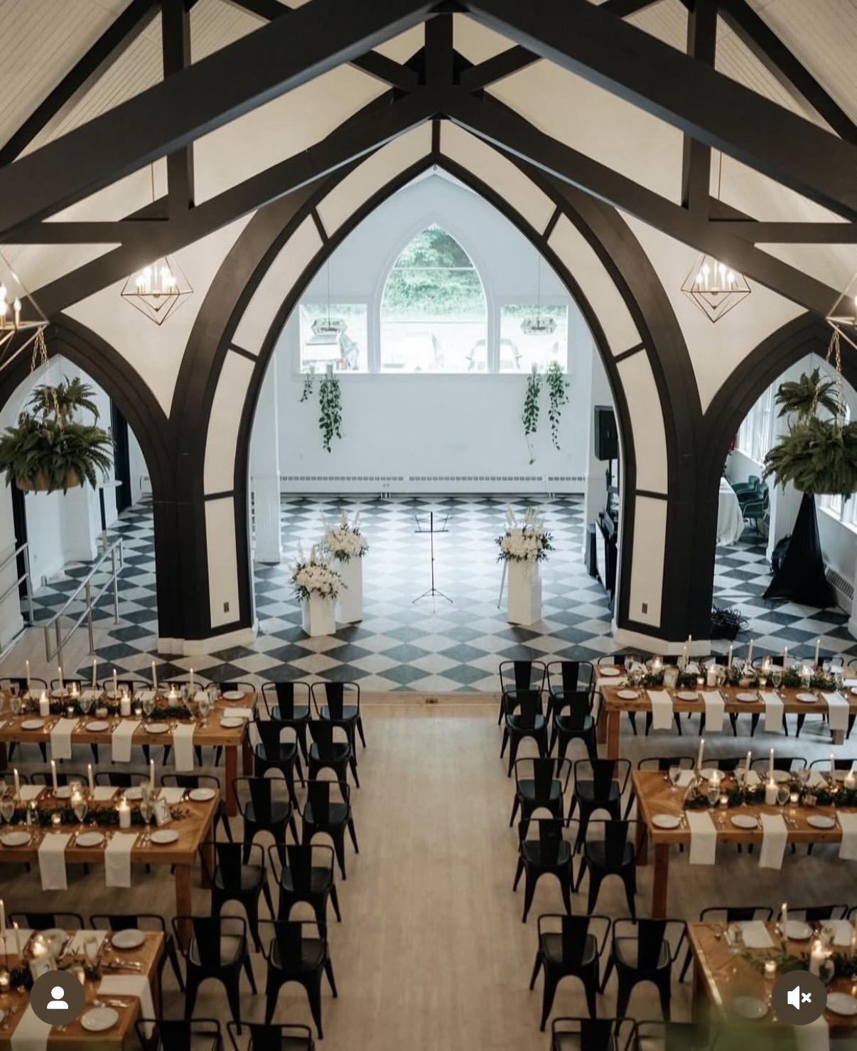 The indoor reception area is known for its stunning archways, lush greenery, black and white dance floor, and custom-built tables. The custom-built herringbone tables were individually handcrafted from the former church pews.