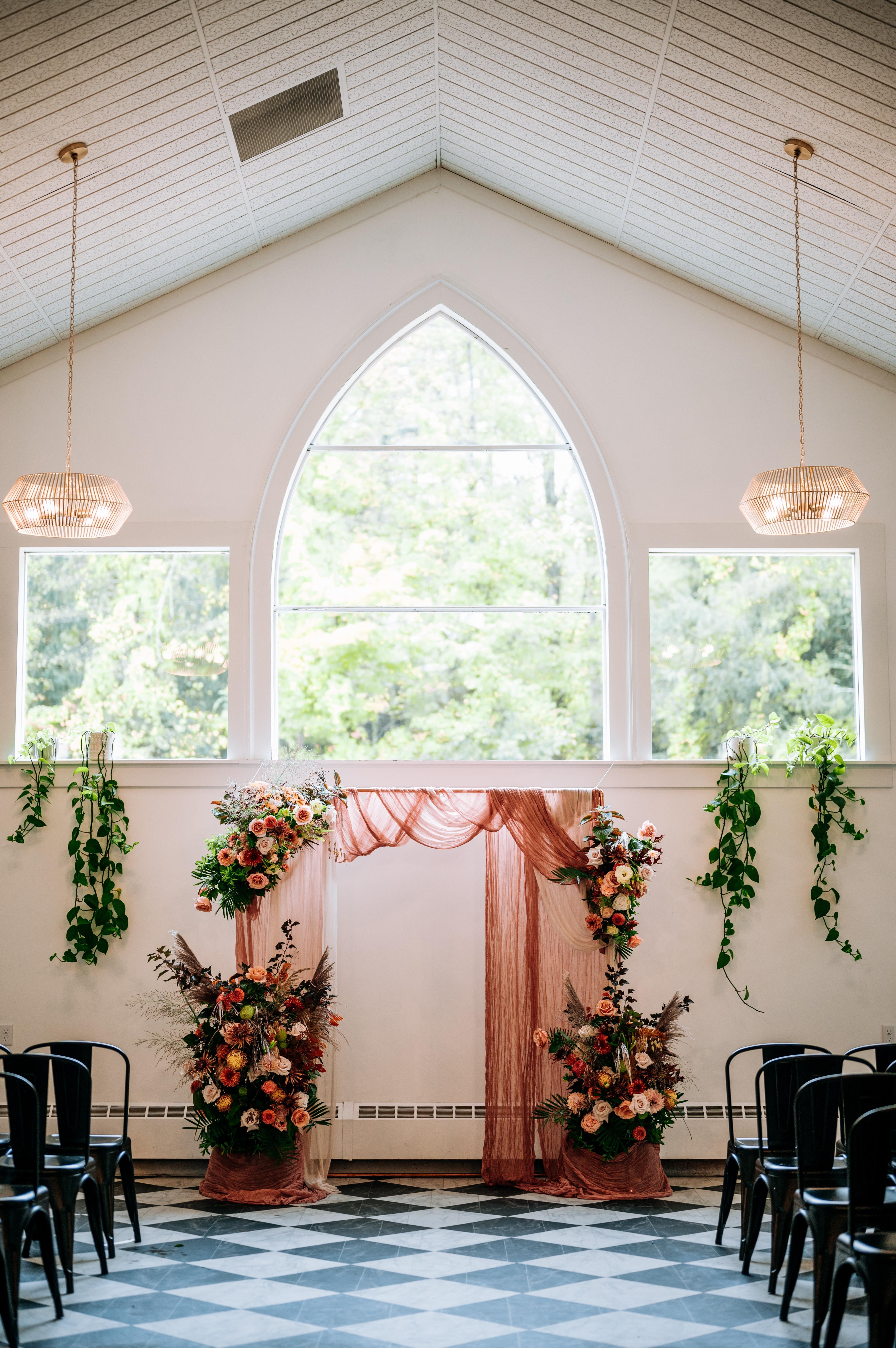 Pocono Palms is a wedding and event venue located in Canadensis, PA, owned by two sisters. A former church, originally built in 1912, Pocono Palms went through extensive renovations to transform it into the contemporary and unique space it is today. Pocono Palms combines the rustic charm of the Pocono Mountains with lush greenery and modern lines, to create a memorable oasis for couples looking for something different. The venue features a large outdoor garden, ceremony site and altar, and cocktail area. The indoor reception area is known for its stunning archways, lush greenery, black and white dance floor, and custom-built tables. Two stylish wedding suites also compliment the venue and create an enjoyable space for couples to prepare for their big day! Design a perfect event by partnering with local vendors for catering, florals, photography and more. Most importantly, Pocono Palms is inclusive venue, celebrating love of all kinds.