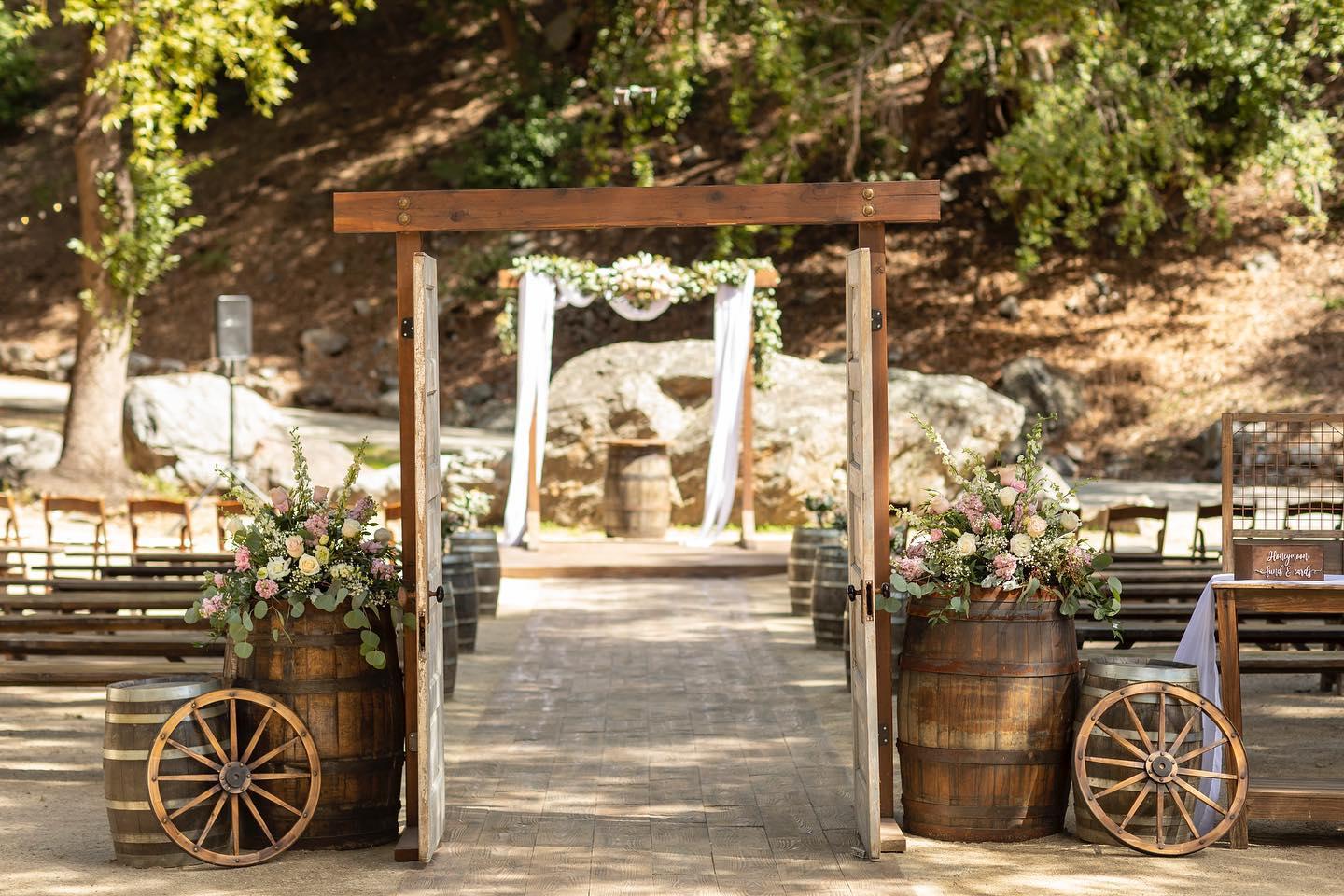 Our property can accommodate 300+ guests in both our ceremony and reception area. Our ceremony area is nestled against oak trees and rocks, with the ceremony arbor sitting beneath the trees where the sun peaks through and shines on your beautiful union.