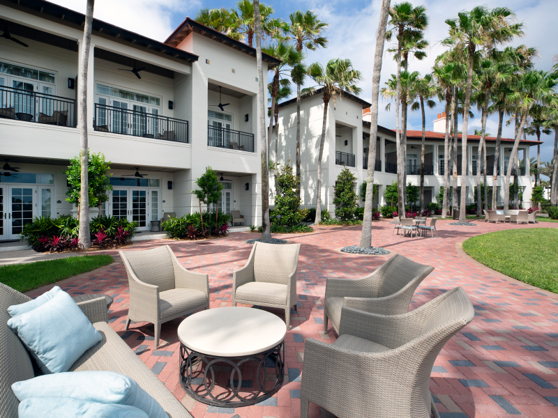 The Island House Patio, available with Island House guest room reservations, offers views of the lagoon and historic Island 9th Green, making it the perfect spot for a welcome reception or farewell brunch.