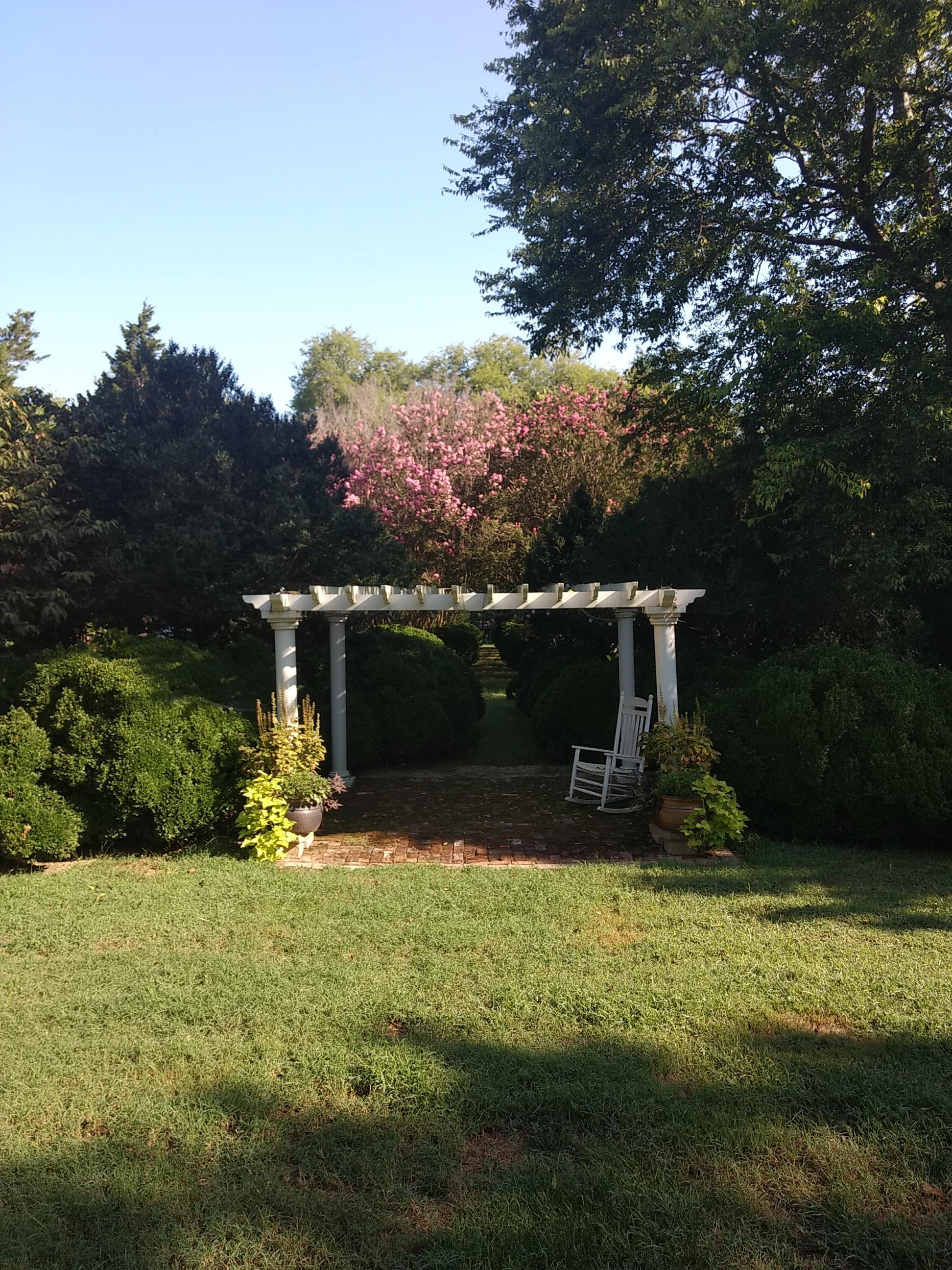 Outdoor ceremony garden that is surrounded by natural landscape and beautiful 100 year old crepe myrtles and trees provide a canopy for shade. The ceremony garden is lined with a boxwood row of over 100 year old English boxwoods.