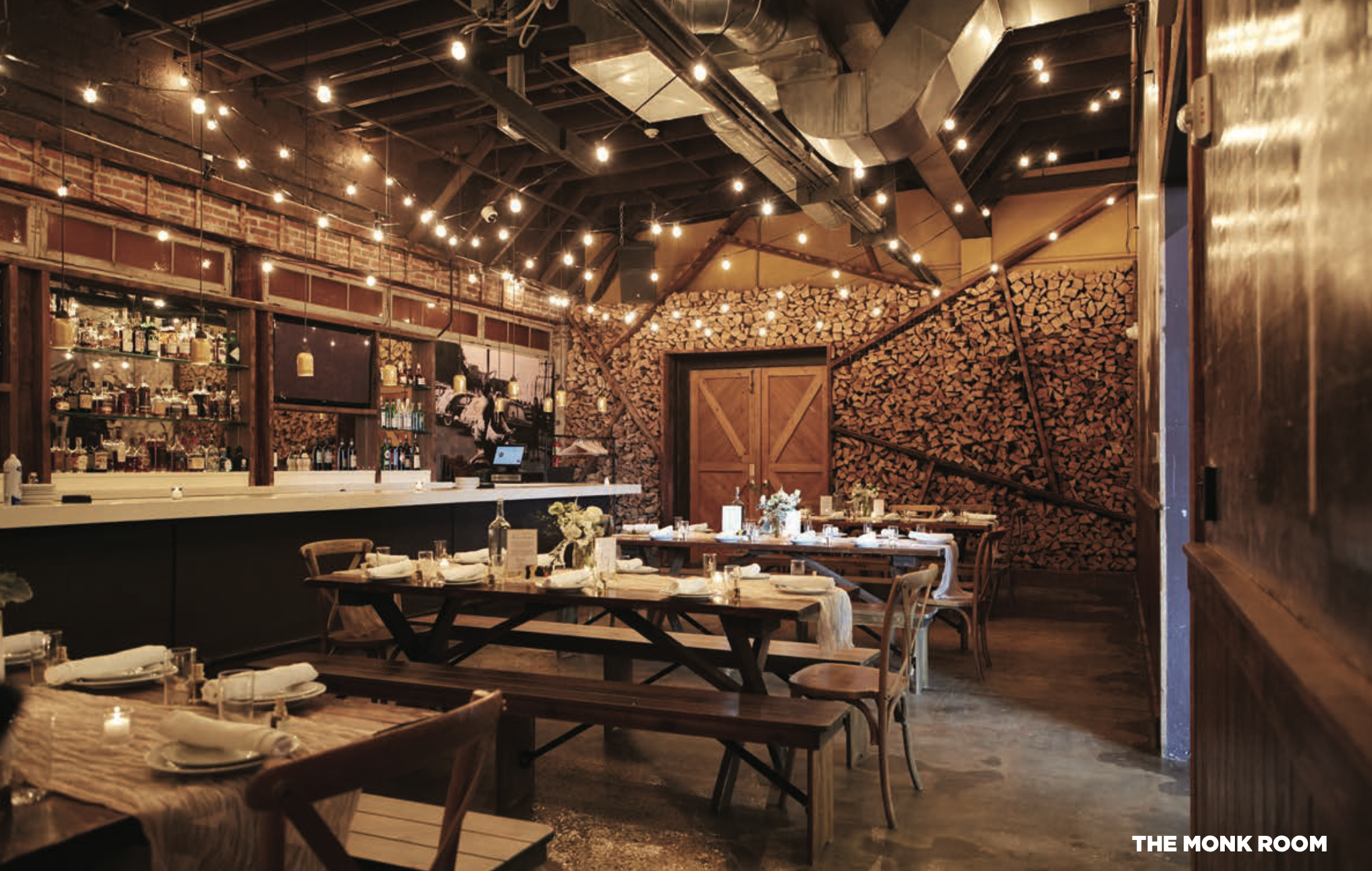Right next to The Abbot Room, The Monk Room is a perfectly cozy (and private) 1000 square foot space complete with a 20-foot stacked wood wall installation, full bar, and two large-screen TVs. Ideal for wedding ceremonies, cocktail receptions, and seated dinners.
