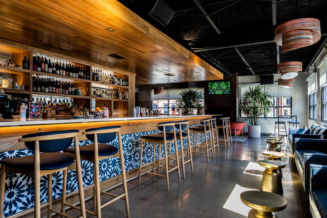 The beautiful lounge bar has a gas fireplace as a focal point with a variety of comfortable low and high seating options, couches, chairs, and stools, with décor inspired by the Mediterranean. There is a stunning full service elm wood bar, fitted with LED lighting that can be customized to suit the occasion and desired ambience