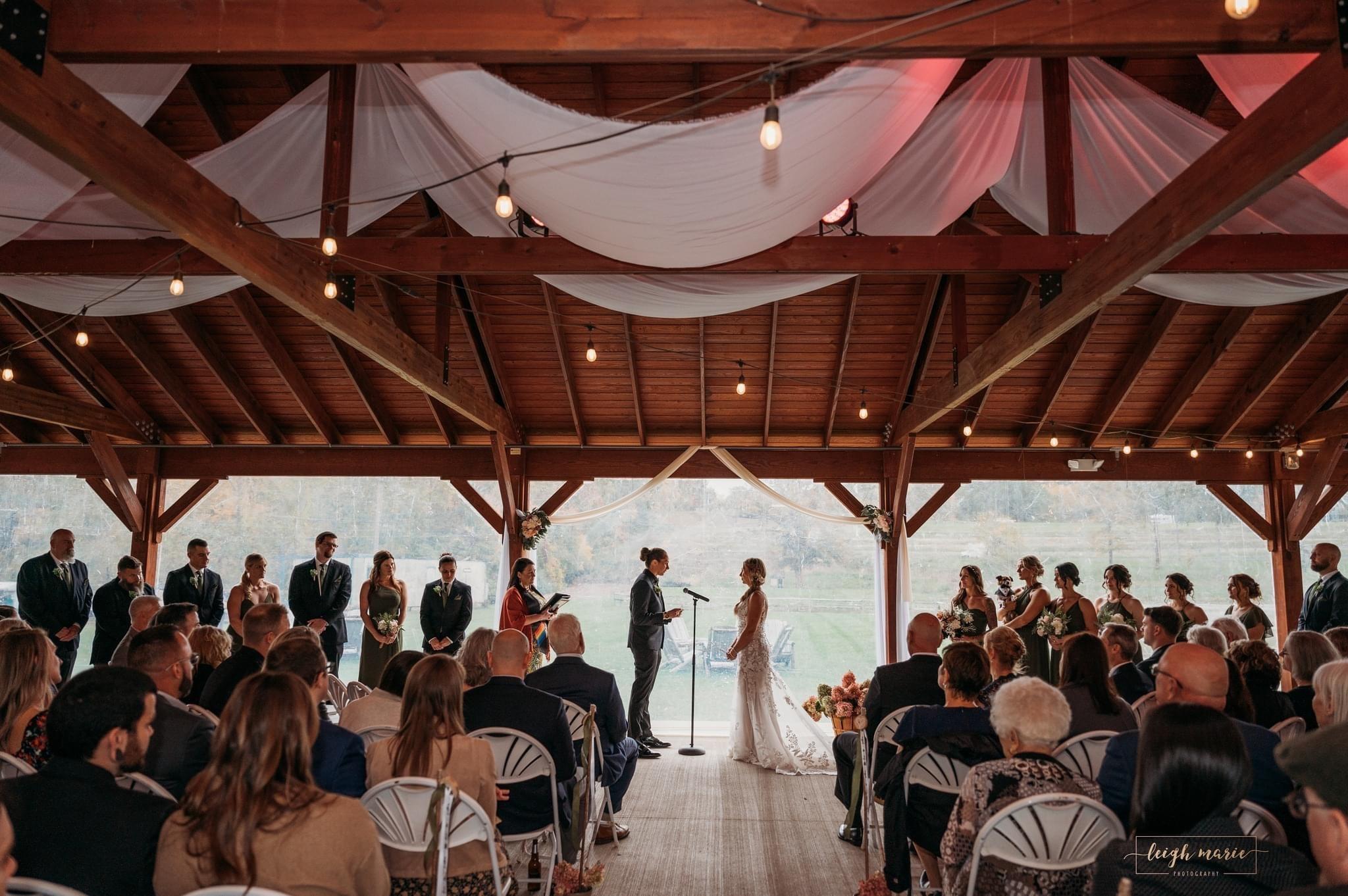 Powder Ridge offers plenty of indoor and outdoor space for any size wedding. Our rustic indoor Lodge with beautiful barn door and two stone fireplaces can accommodate 200 people. Our outdoor Pavilion built in September 2021 can hold 200 people with dance floor space. Mountain Top ceremonies are our specialty.