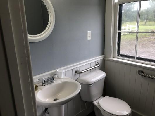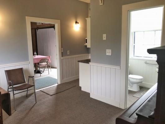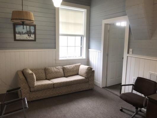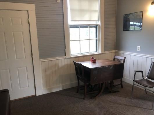 This space features a bedroom with a king sized bed for the bride and groom, bridesmaid makeup and hair space, kids space with bunk beds and toys. small kitchen with dining table. bathroom with toilet and sink. no shower has yet been added. Mens den features clothing benches, sectional couch and tv area. also has access to the porch via sliding patio door!